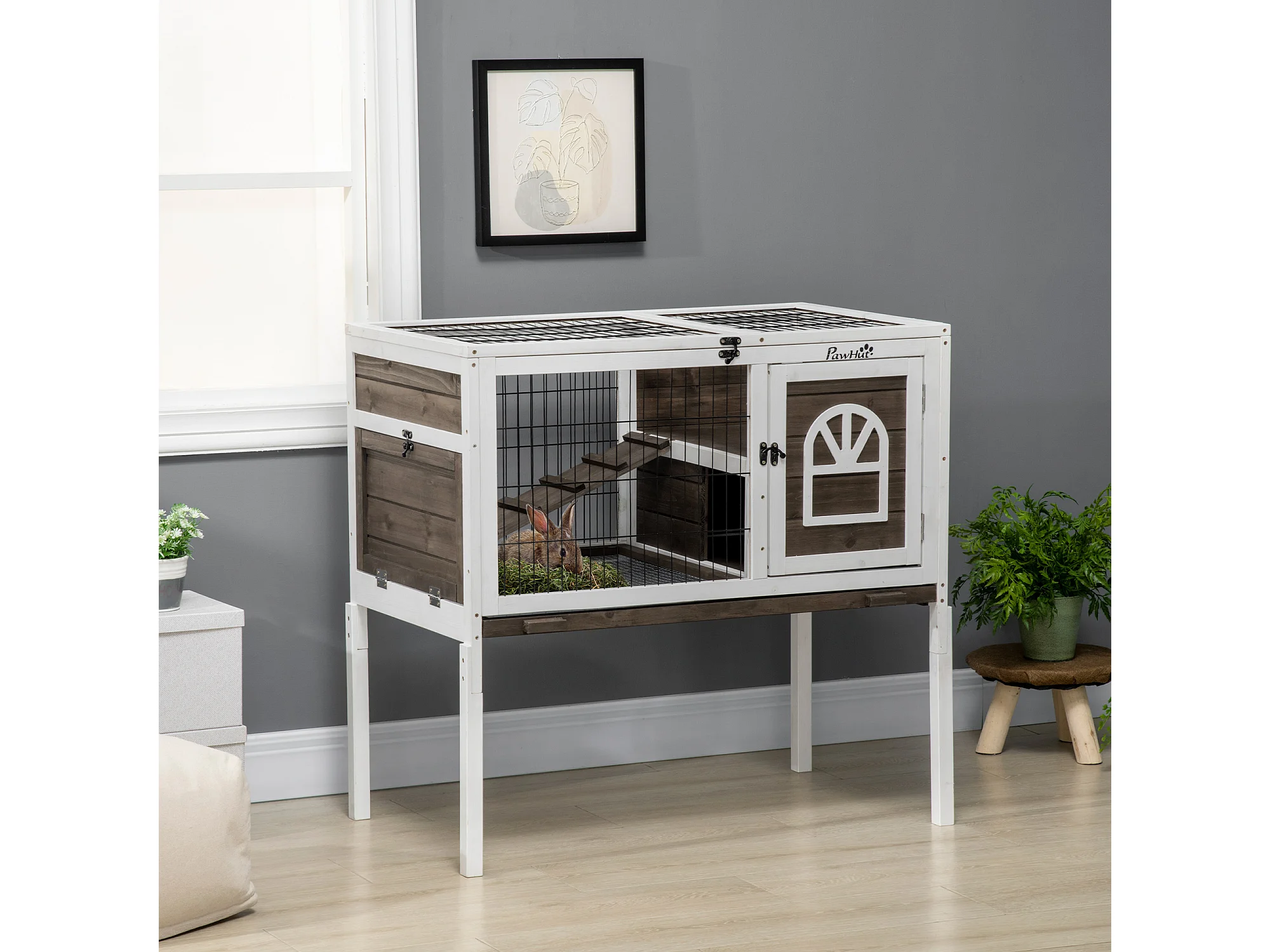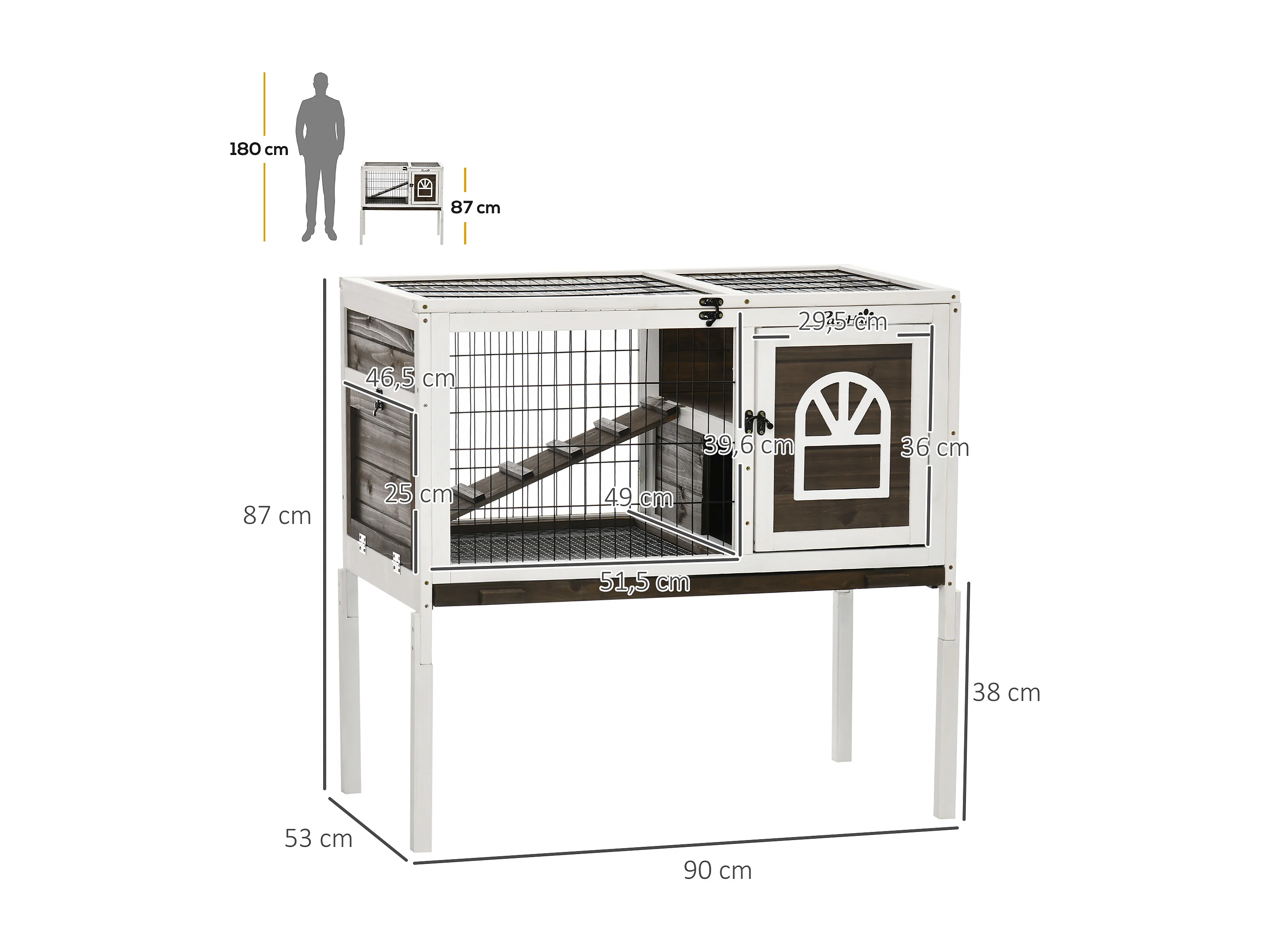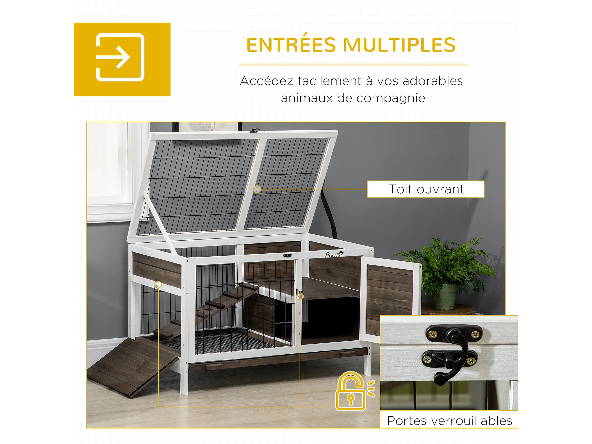 Clapier cage à lapin - 2 portes verrouillables, toit ouvrant, plateau excrément - bois foncé blanc