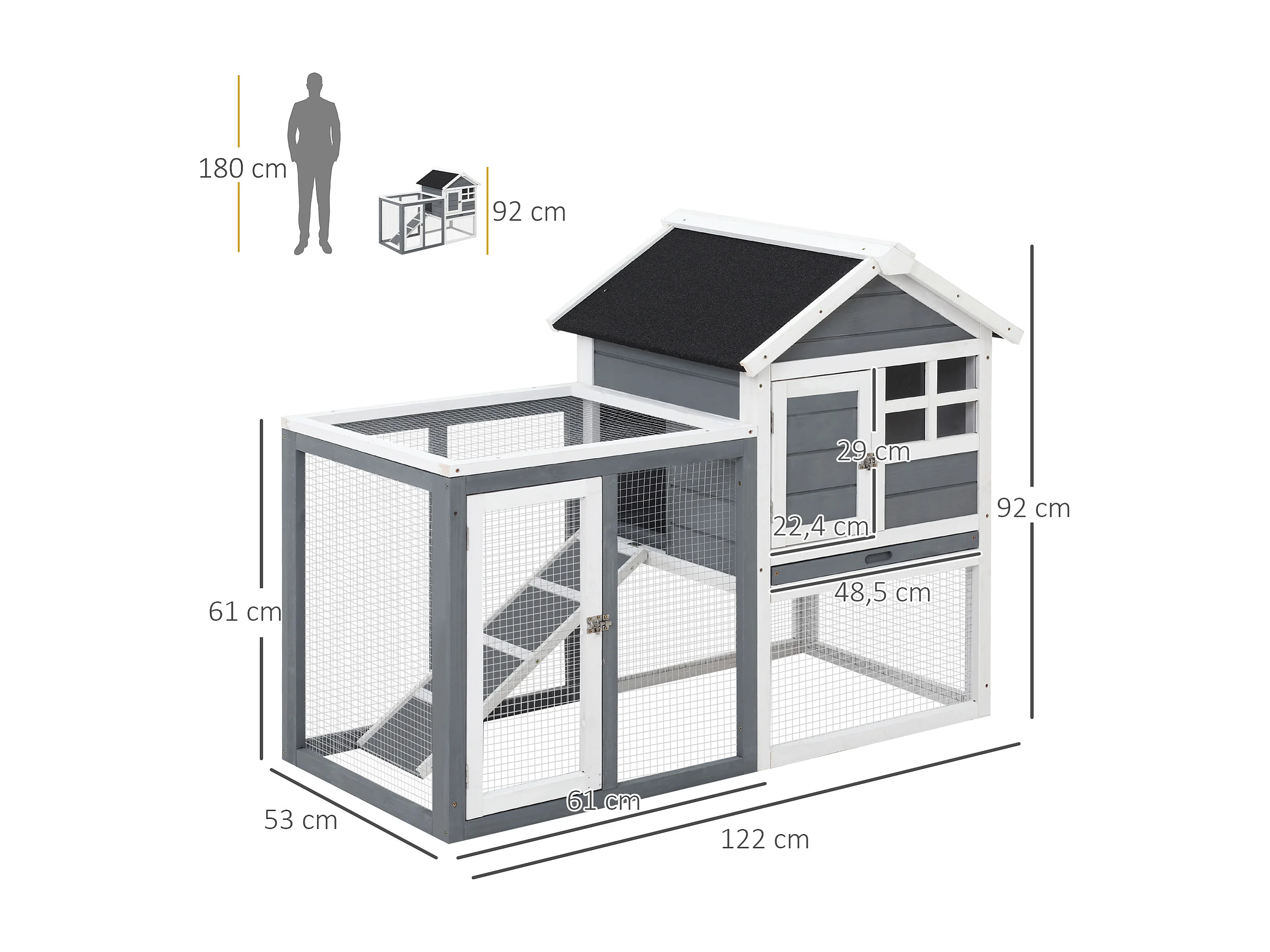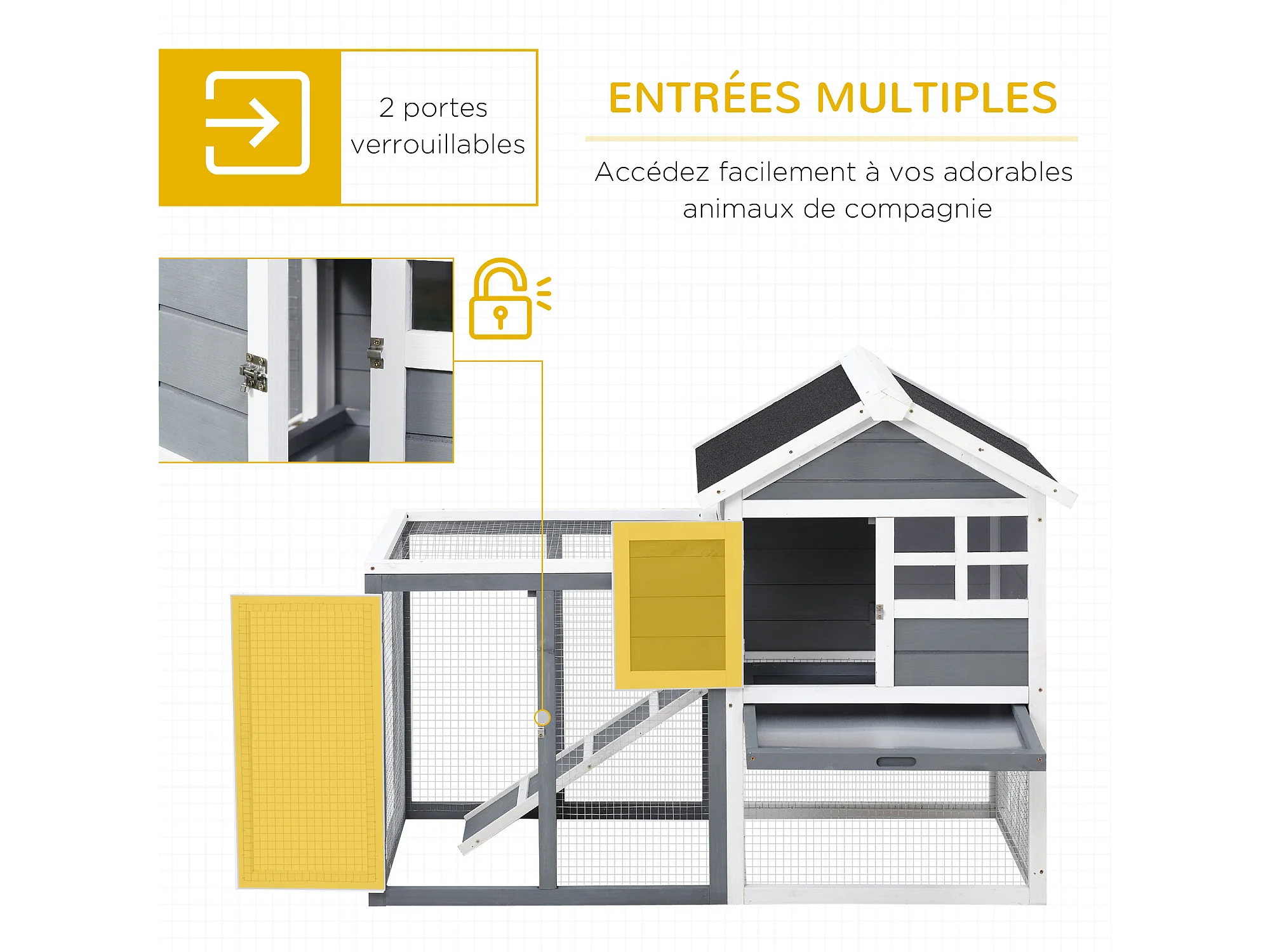 Clapier cage à lapins multi-équipé : niche supérieure avec rampe, plateau excrément, fenêtre + enclos extérieur sécurisé 2 portes 122L x 63l x 92H cm gris