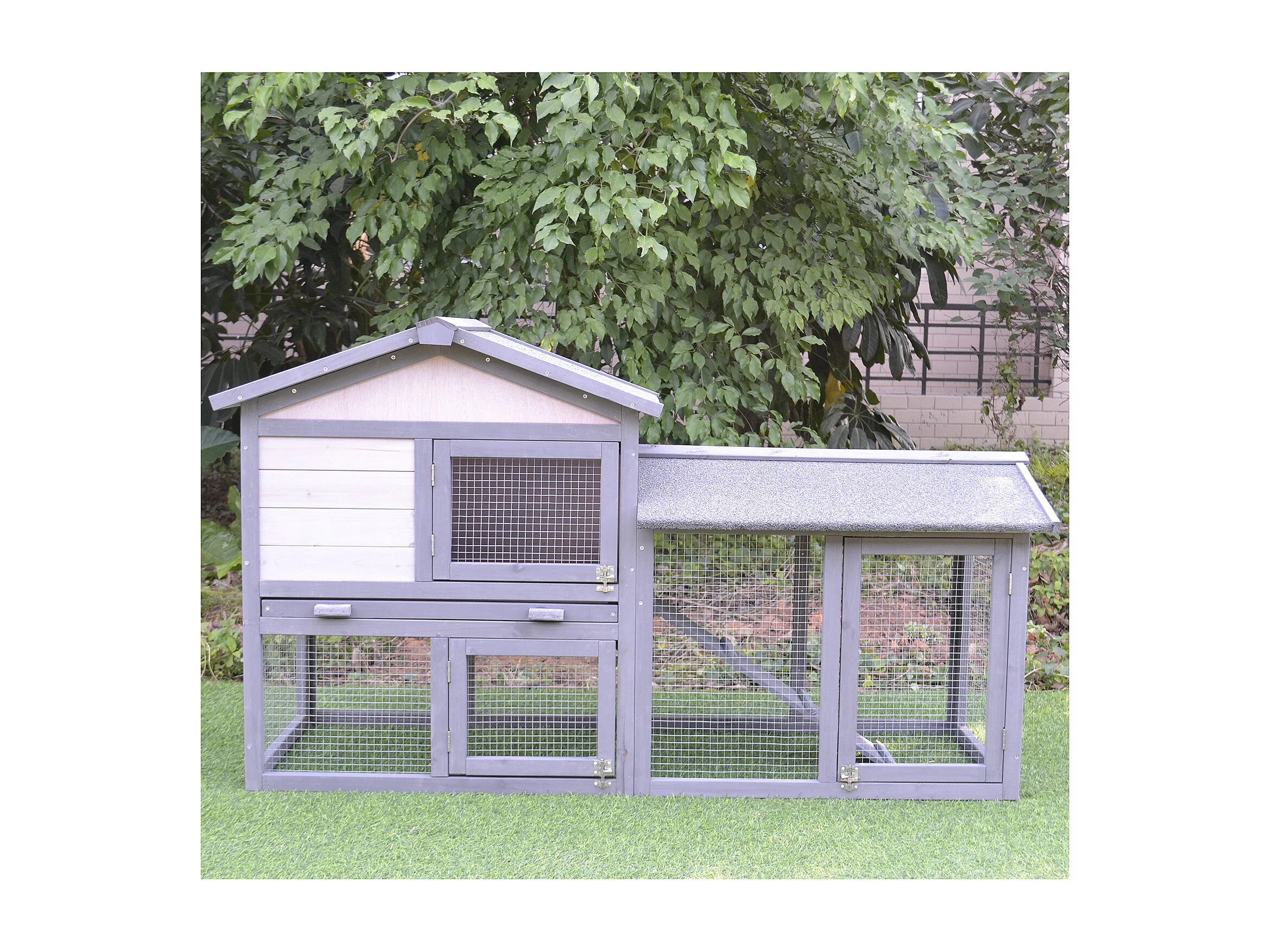 Clapier cage à lapins rongeurs 2 niveaux 3 portes verrouillables tiroir à déjection toit intégral bitumé 147L x 54l x 84H cm bois massif pin gris blanc
