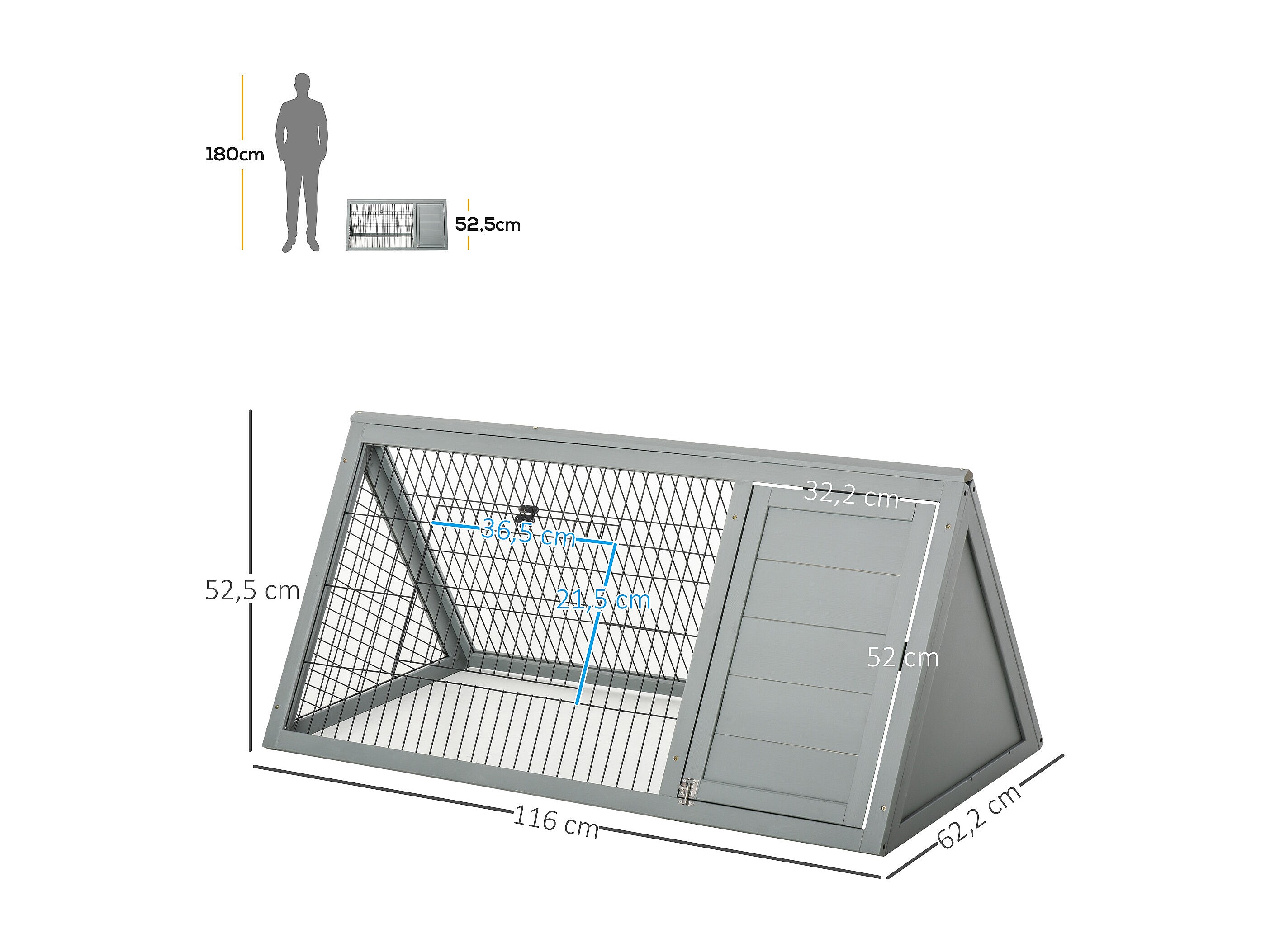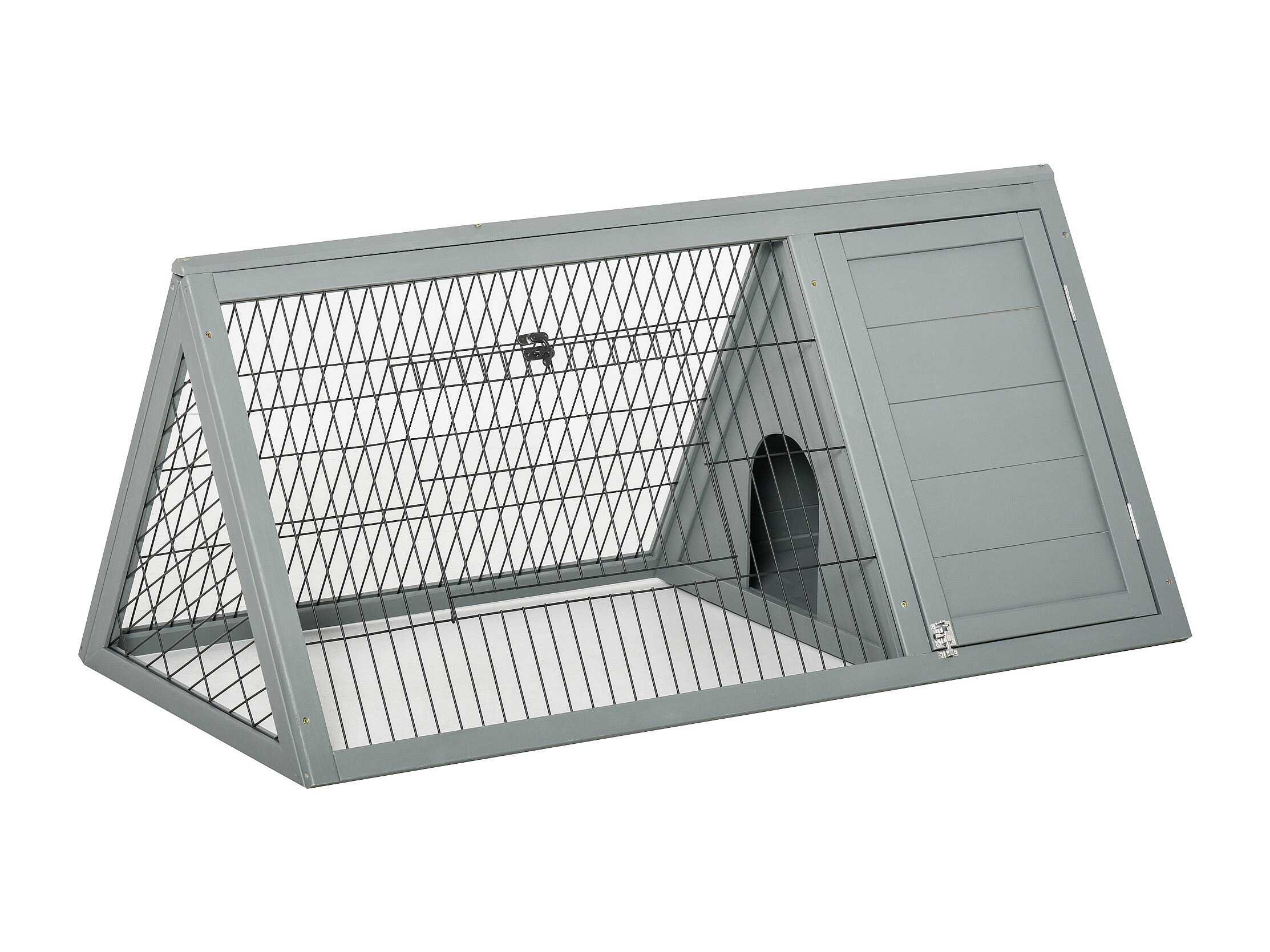 Clapier triangulaire de sol enclos extérieur niche double porte dim. 116L x 62l x 52,5H cm métal bois sapin gris