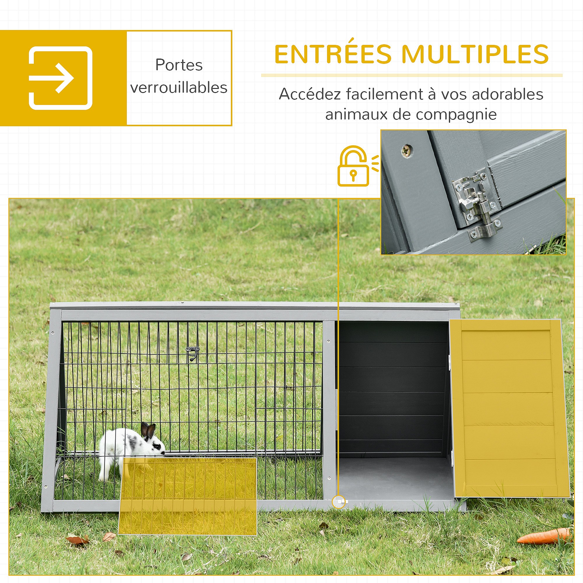 Clapier de sol enclos extérieur niche porte double toit ouvrant fil métallique bois sapin pré-huilé peint gris blanc