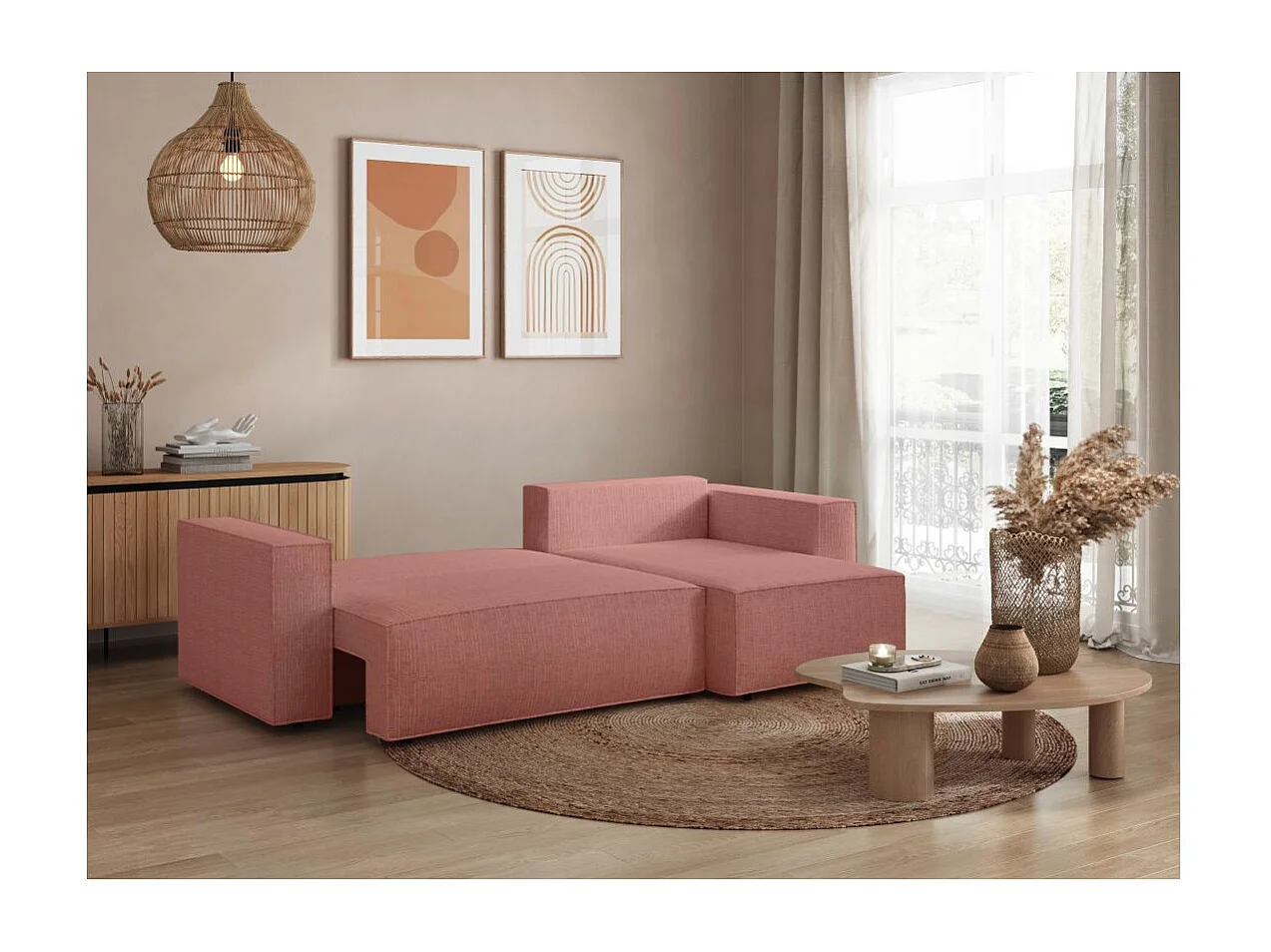 Canapé d'angle 3 places convertible réversible Clarisse avec coffre en tissu texturé - Rose - L269 x P159 x H89cm - Loungitude
