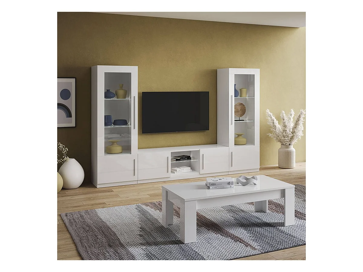 CLARK - Ensemble Salon Complet Laqué Blanc Meuble TV et Vitrines avec Leds + Table Basse