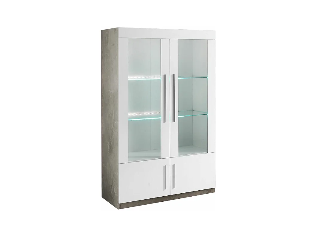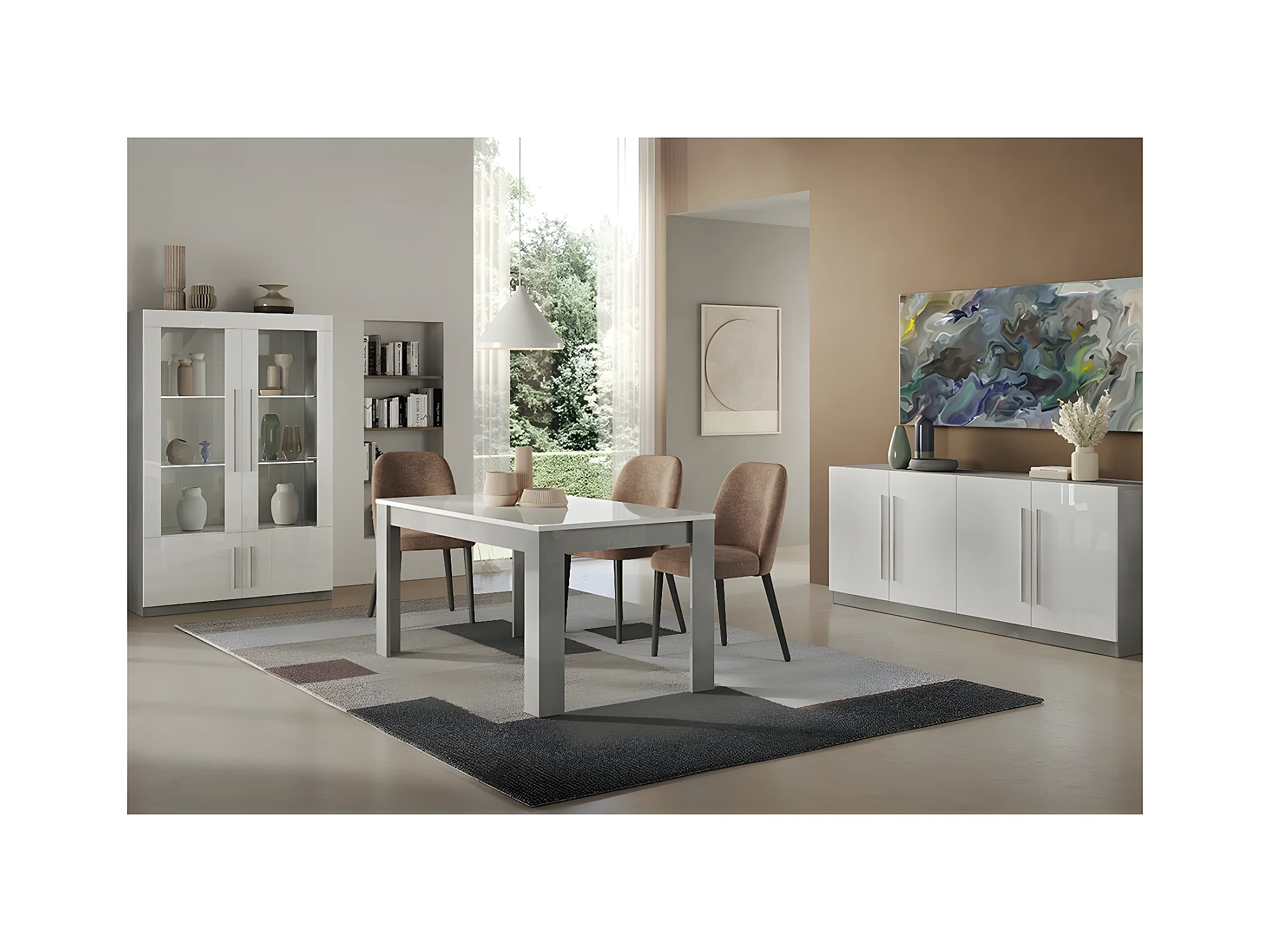 CLARK - Ensemble Séjour Complet Blanc et Marbre Table 190cm + Buffet + Vitrine avec Leds