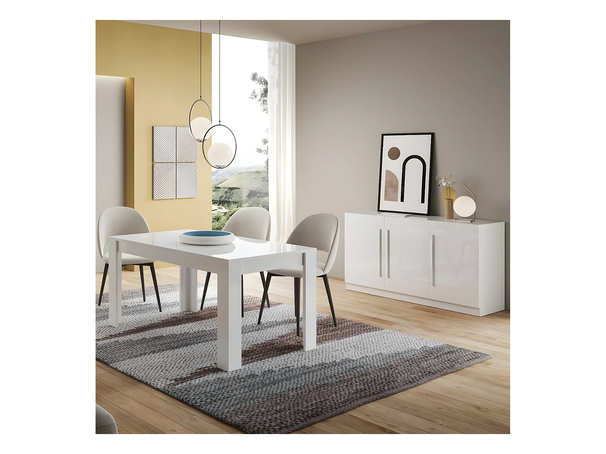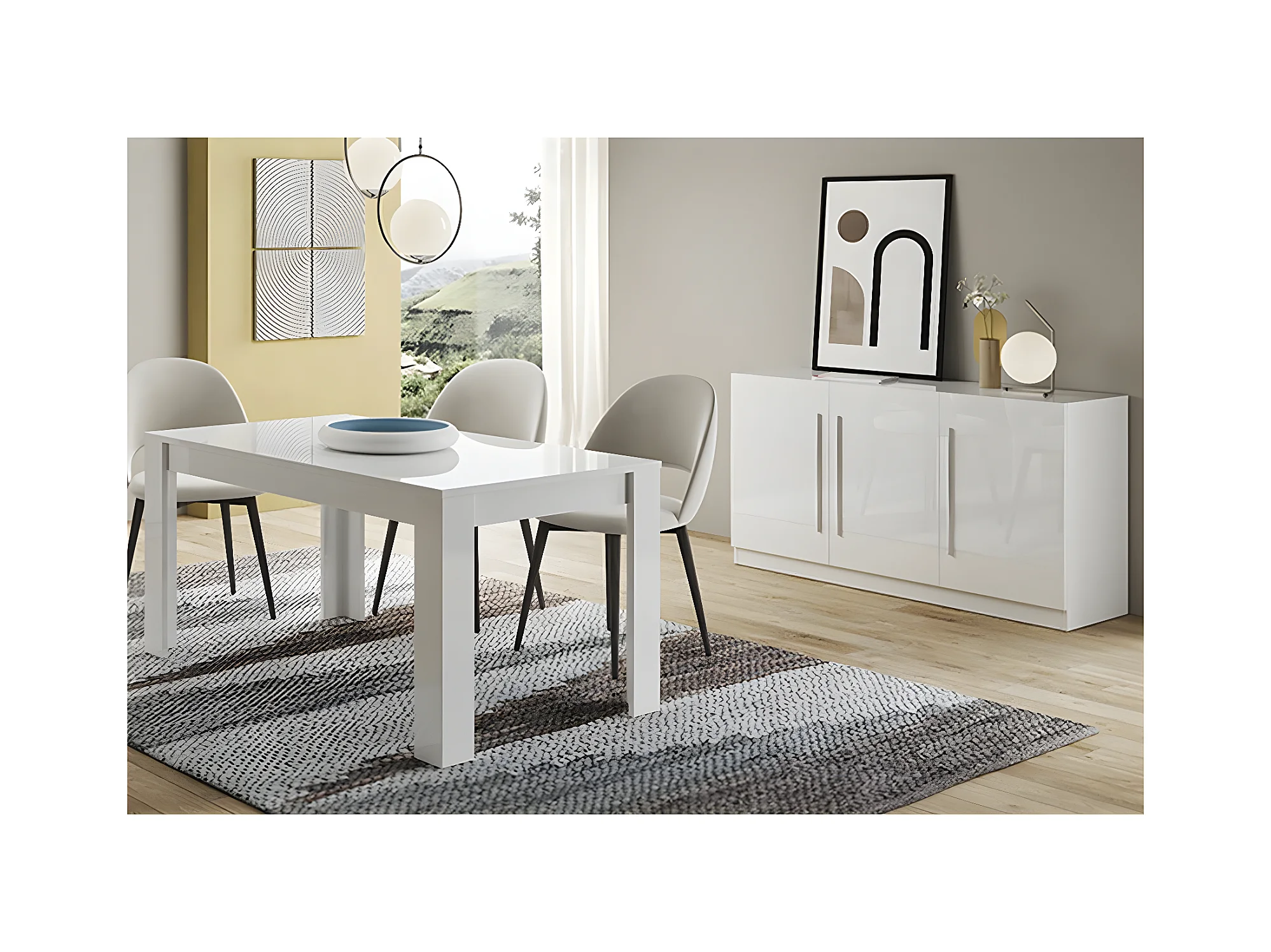 CLARK - Ensemble Séjour Laqué Blanc Table 190cm + Buffet 3 Portes