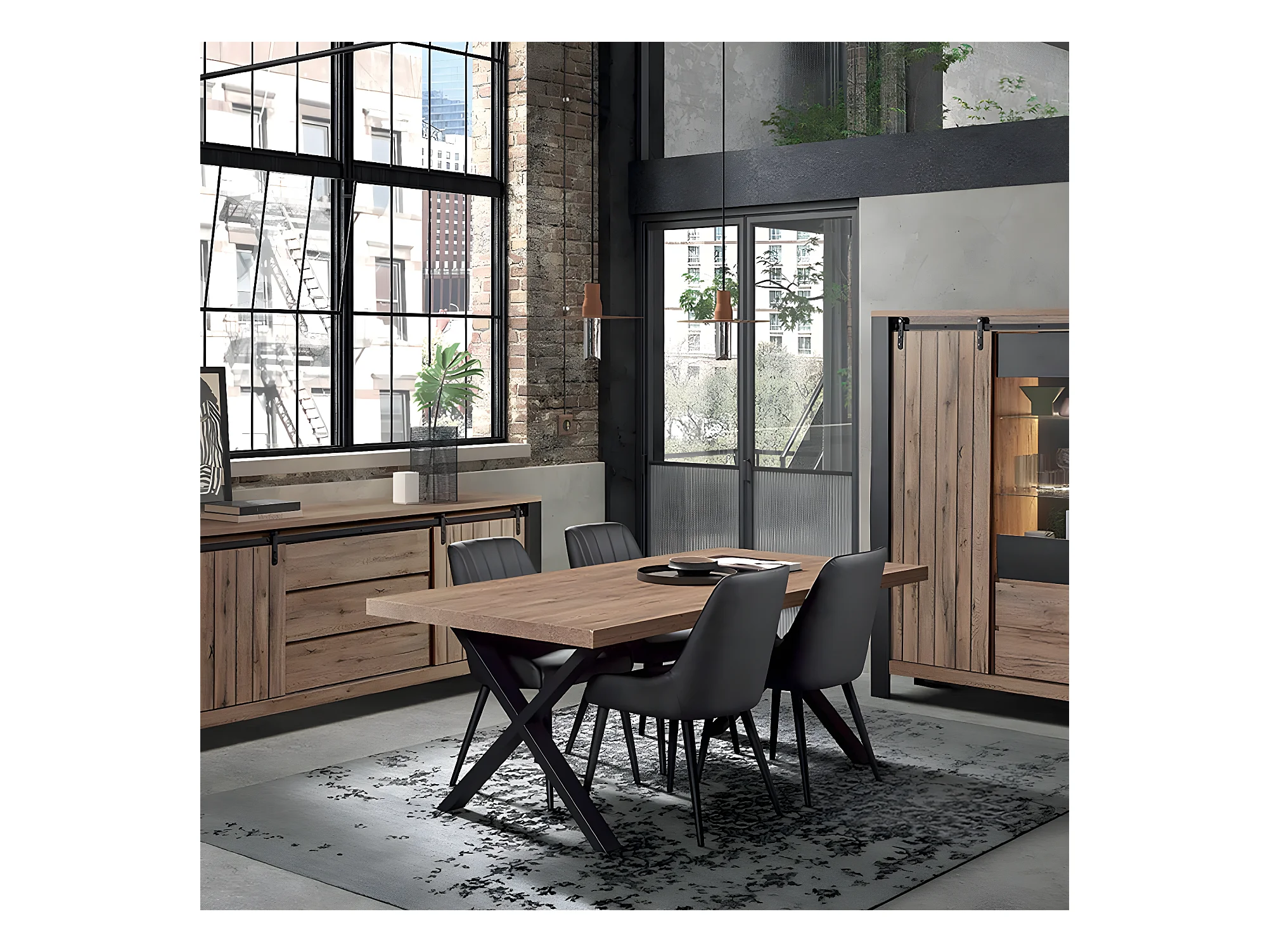 CLODIUS - Ensemble Séjour Complet et Table 230 cm Aspect Bois Piètement X Métal Noir