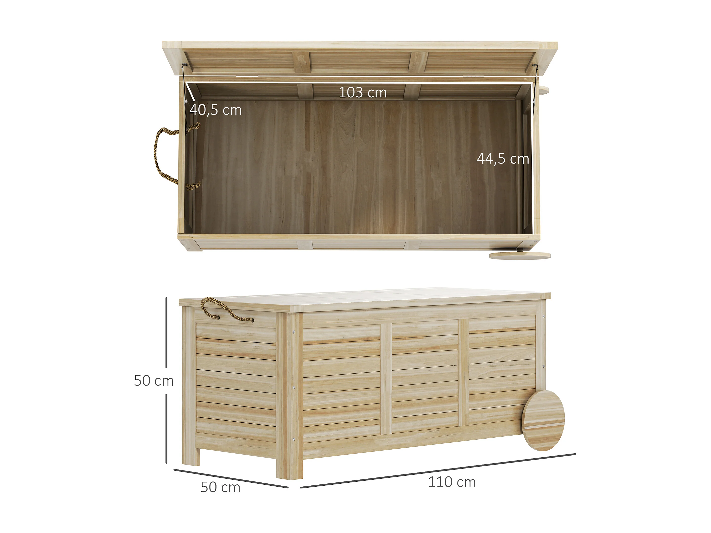 Coffre de jardin 185L banc dim. 110 x 50 x 50 cm - 2 roues, poignée, compas - bois sapin pré-huilé