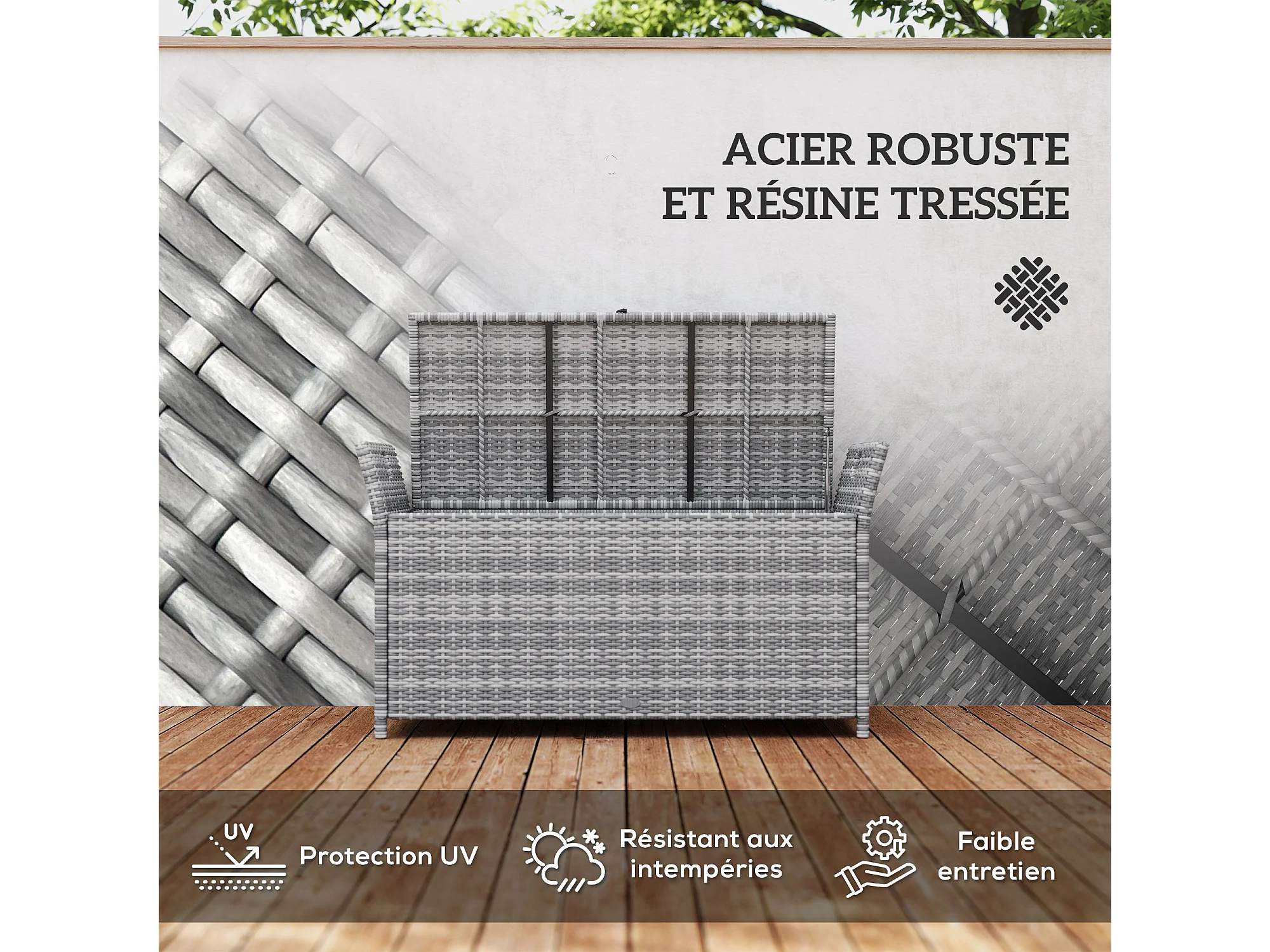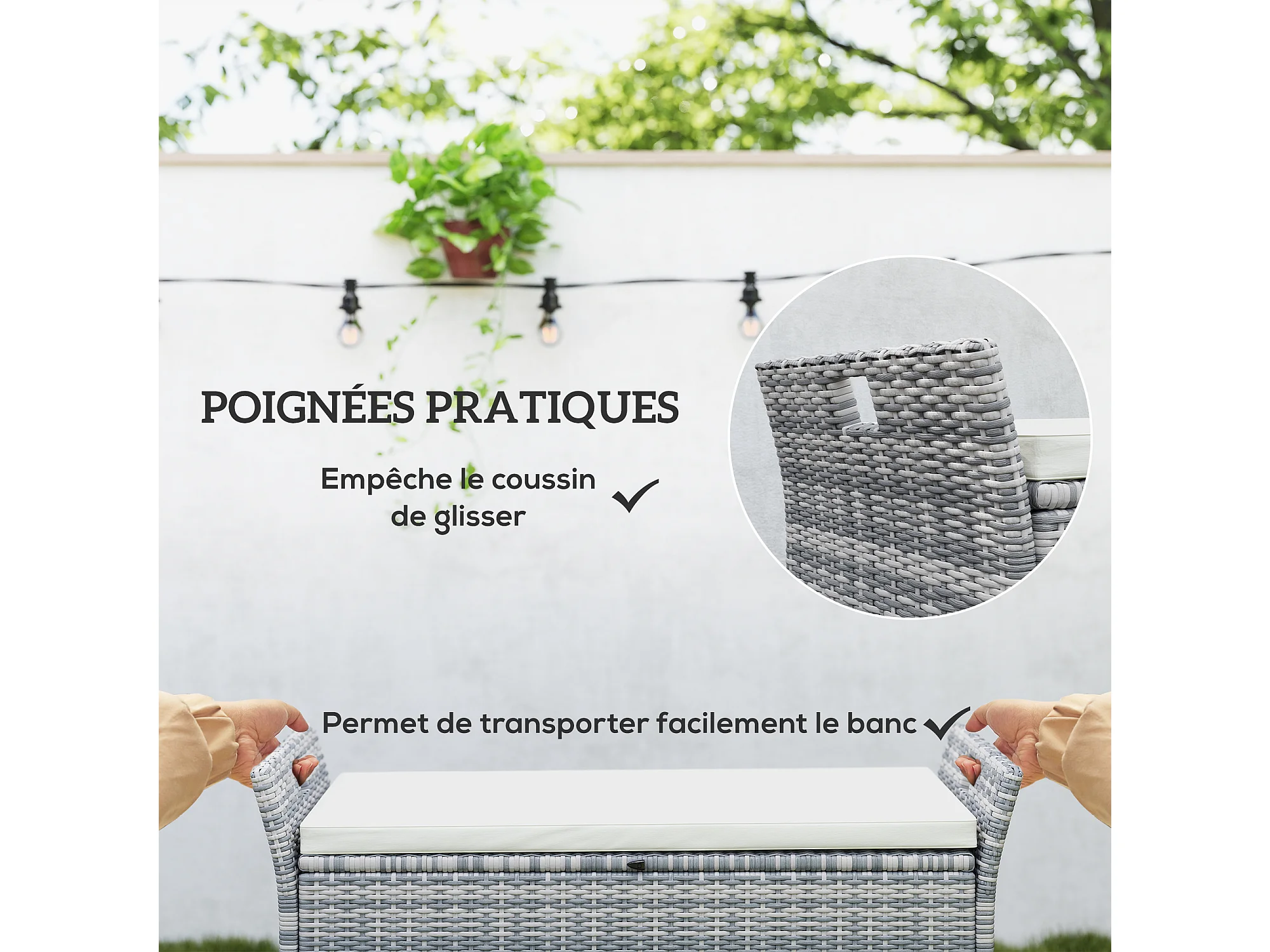 Coffre de jardin en résine tressée avec poignées et coussin déhoussable dim. 125 x 55 x 70 cm gris