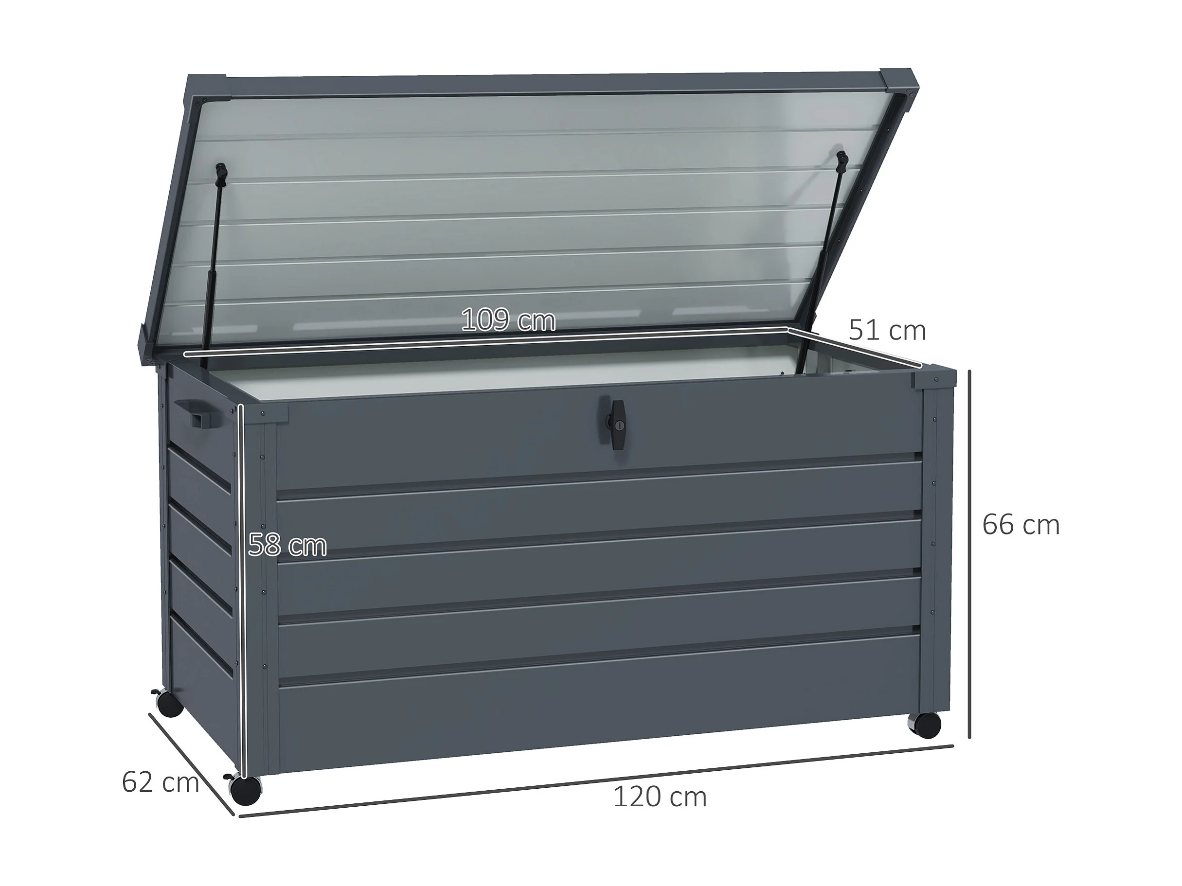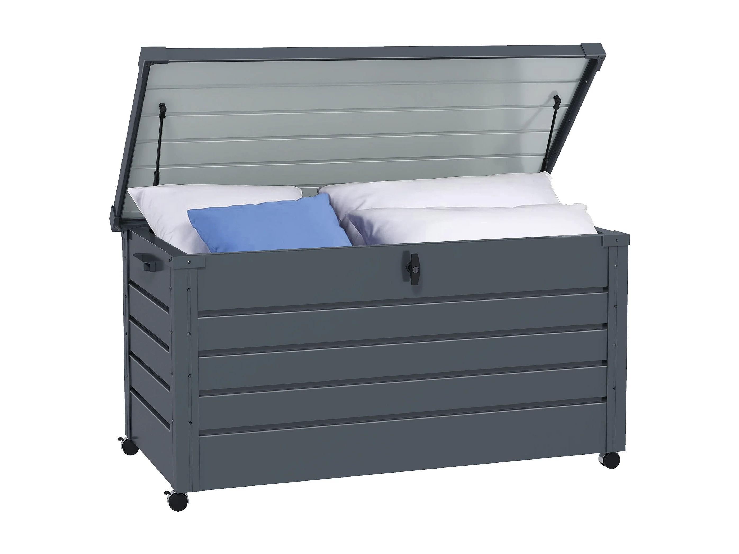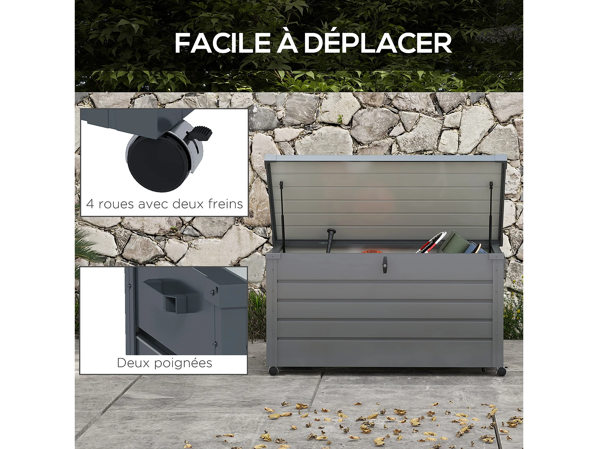 Coffre de jardin grande taille 311L verrouillable - roulettes, poignées, vérins gaz - acier anthracite
