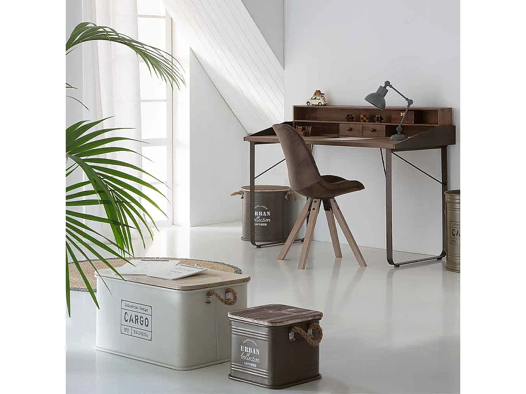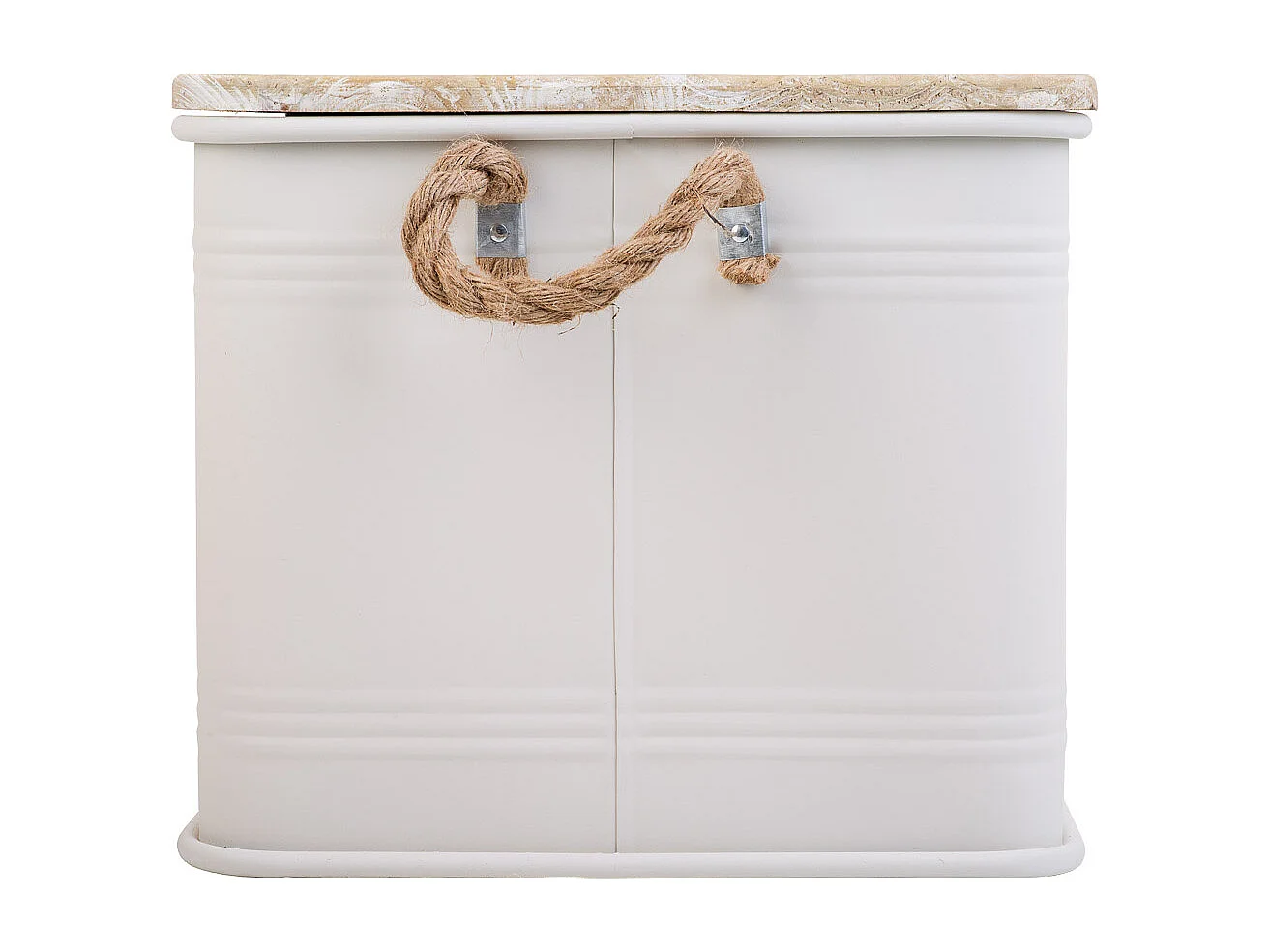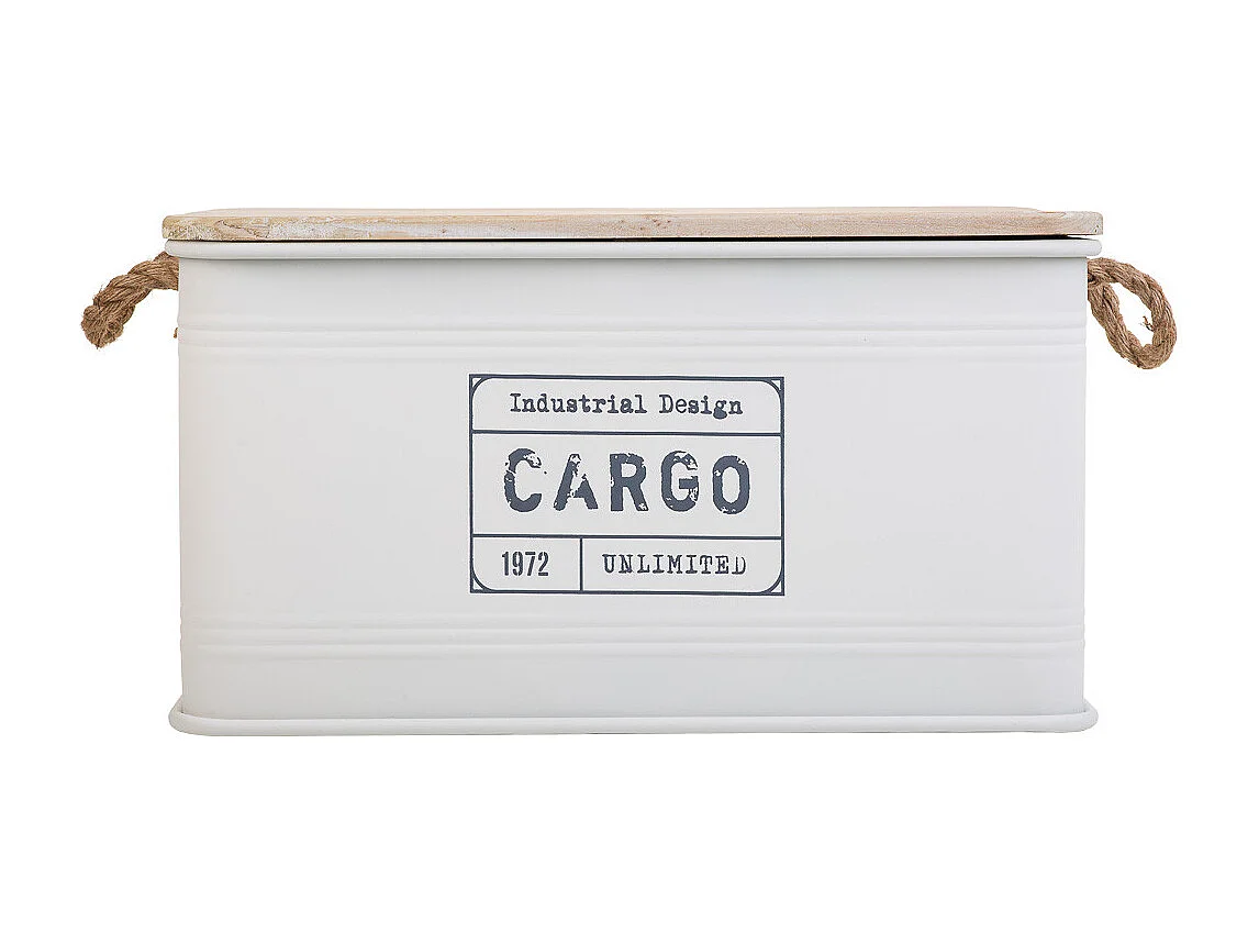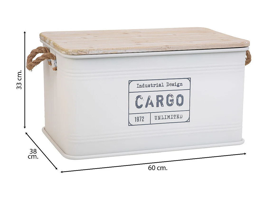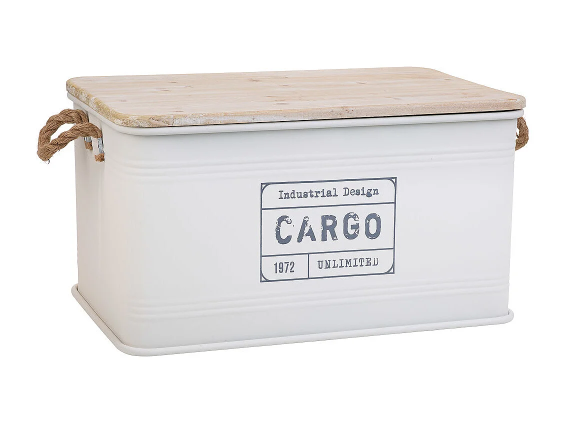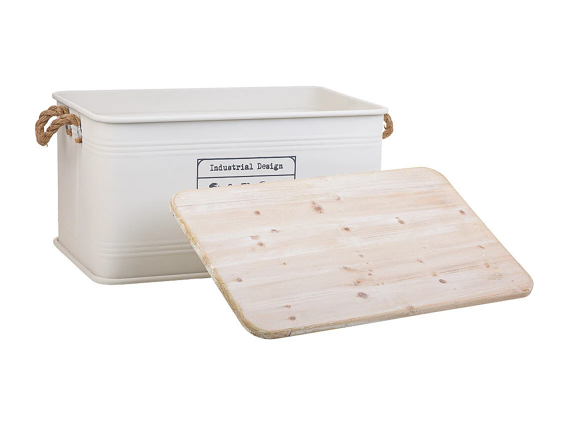 Coffre en métal, couvercle en bois et poignées en corde imprimée blanc 60x38x33h cm