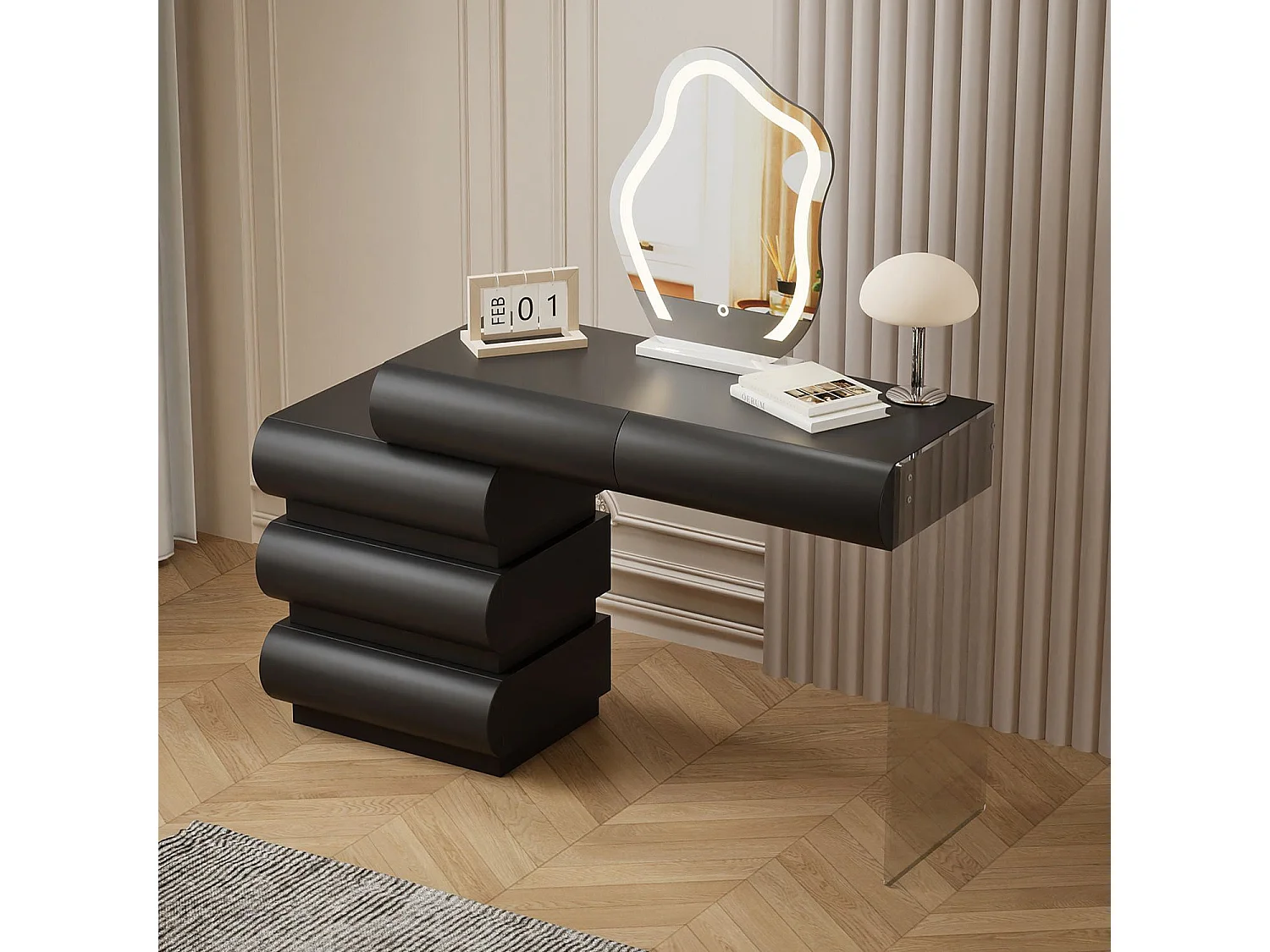Coiffeuse avec 5 tiroirs arrondis et miroir design L102cm Mezade Noir