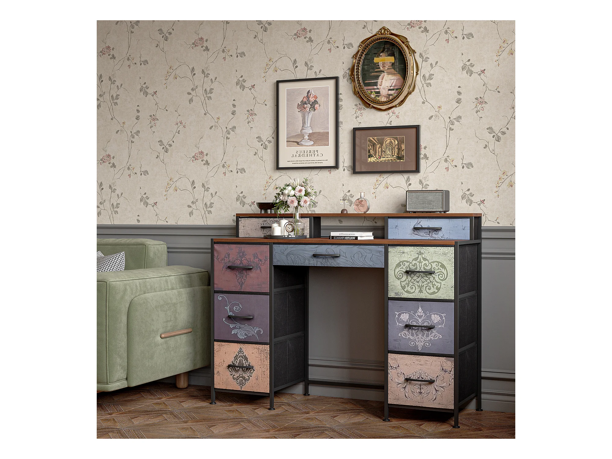 Coiffeuse avec 9 tiroirs en tissu, style bohème, coiffeuse, chambre à coucher, Commode longue pour placard, 121 x 40 x 91,2 cm