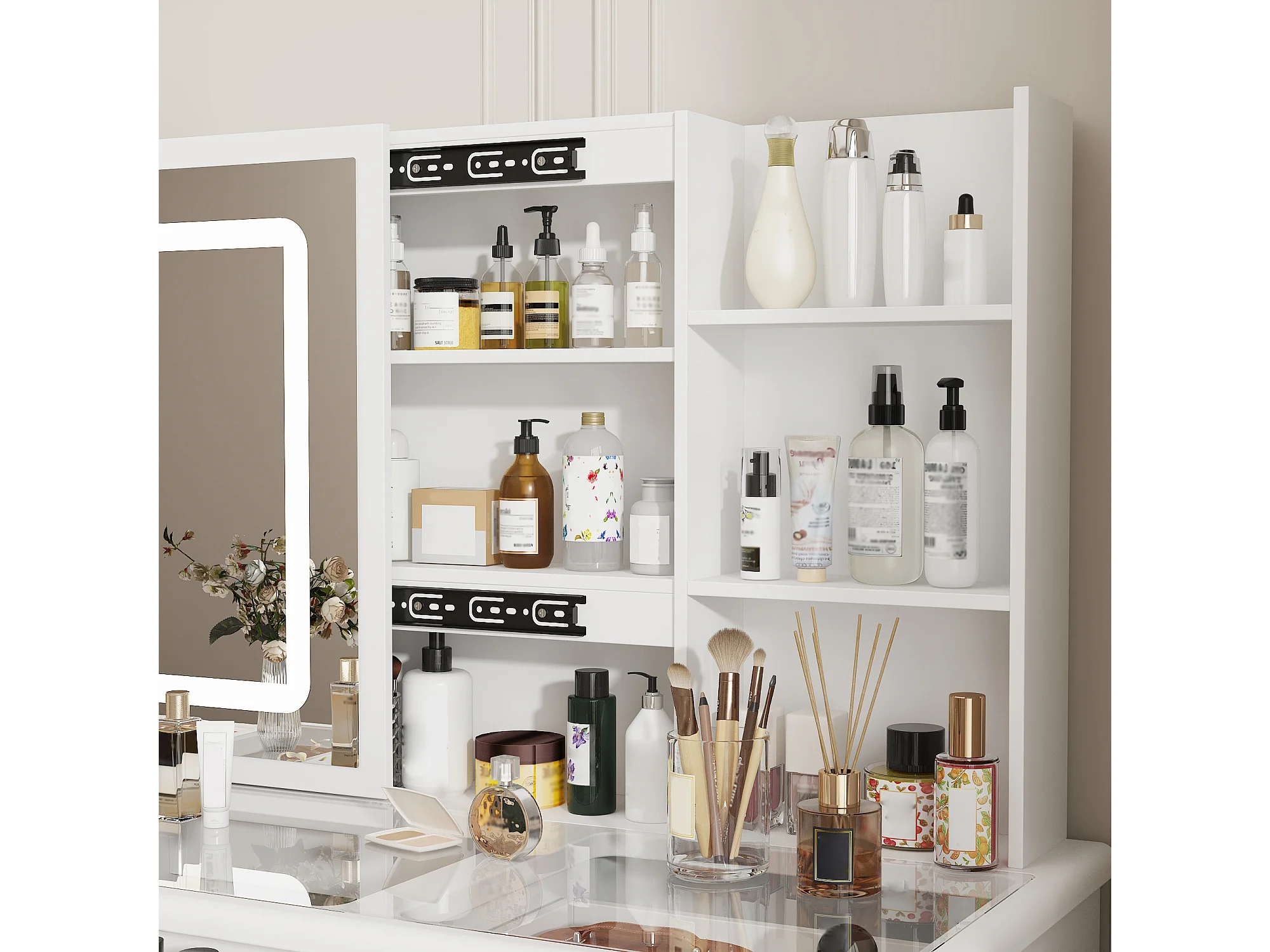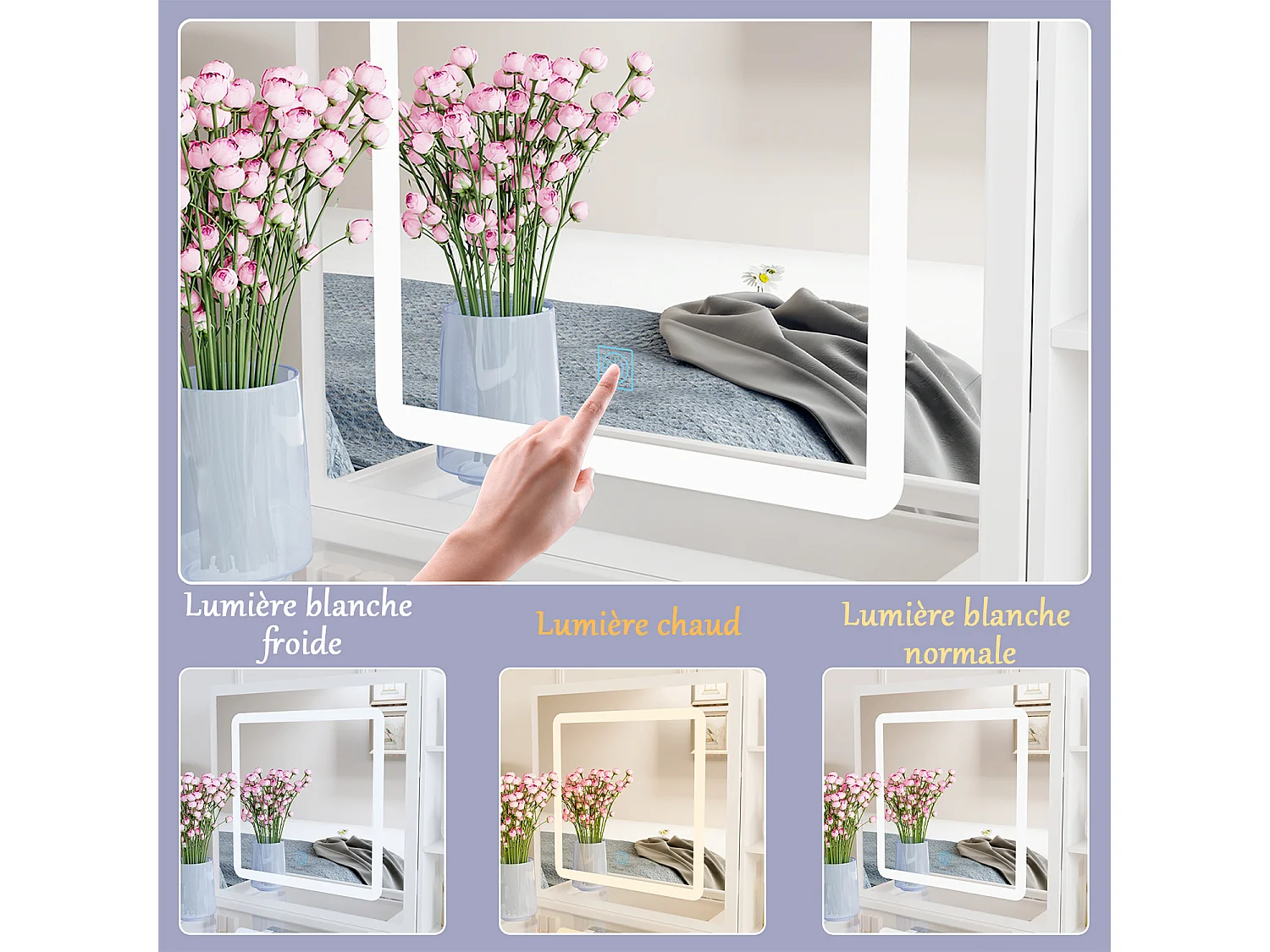 Coiffeuse avec miroir coulissant - LED 3 couleurs - tabouret, 5 tiroirs et compartiments, 100x50x136, Banc