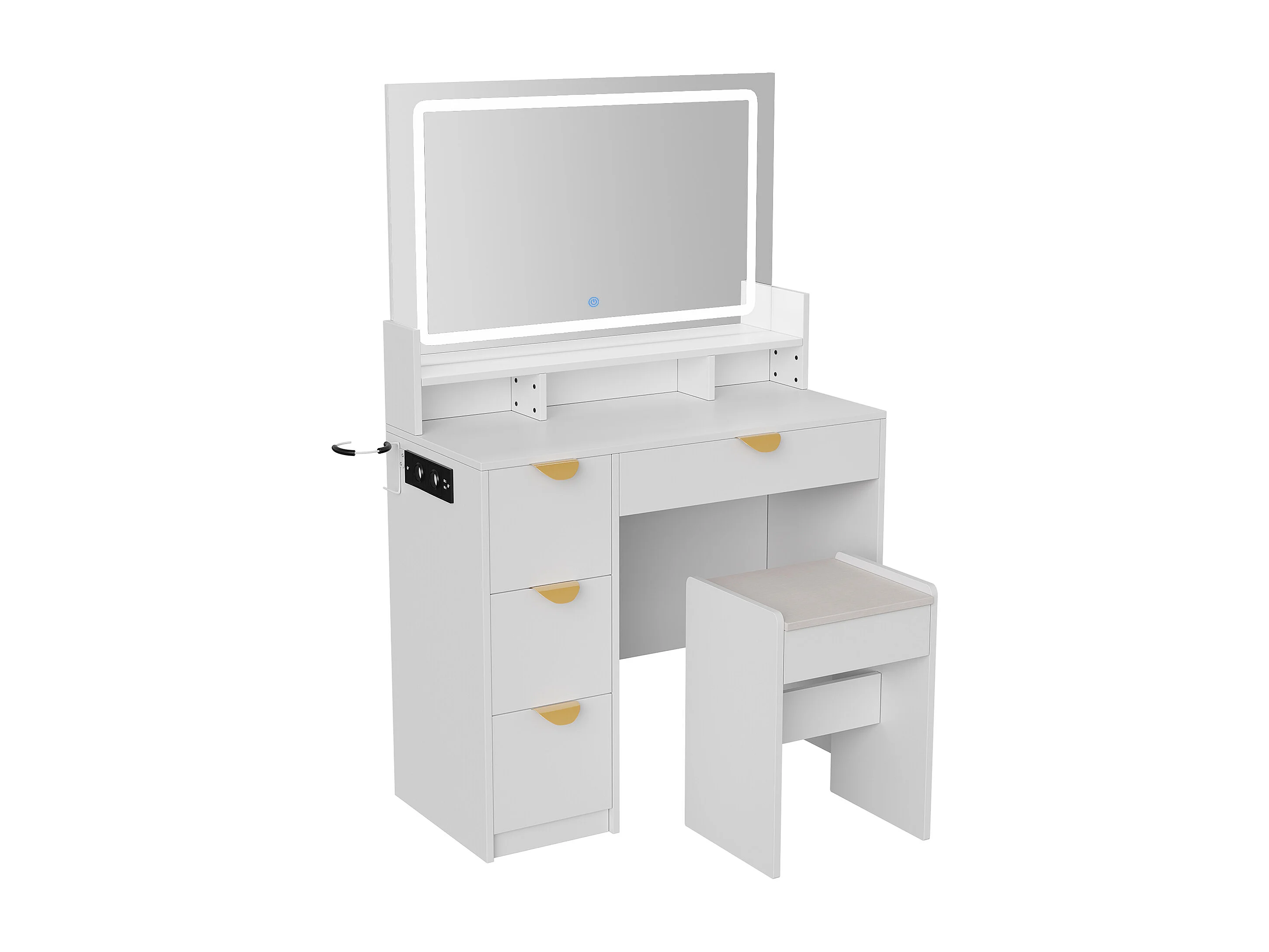 Coiffeuse avec éclairage LED et prises électriques, 3 couleurs à luminosité réglable, table de toilette avec 4 tiroirs et 4 compartiments ouverts, coiffeuse avec ta
