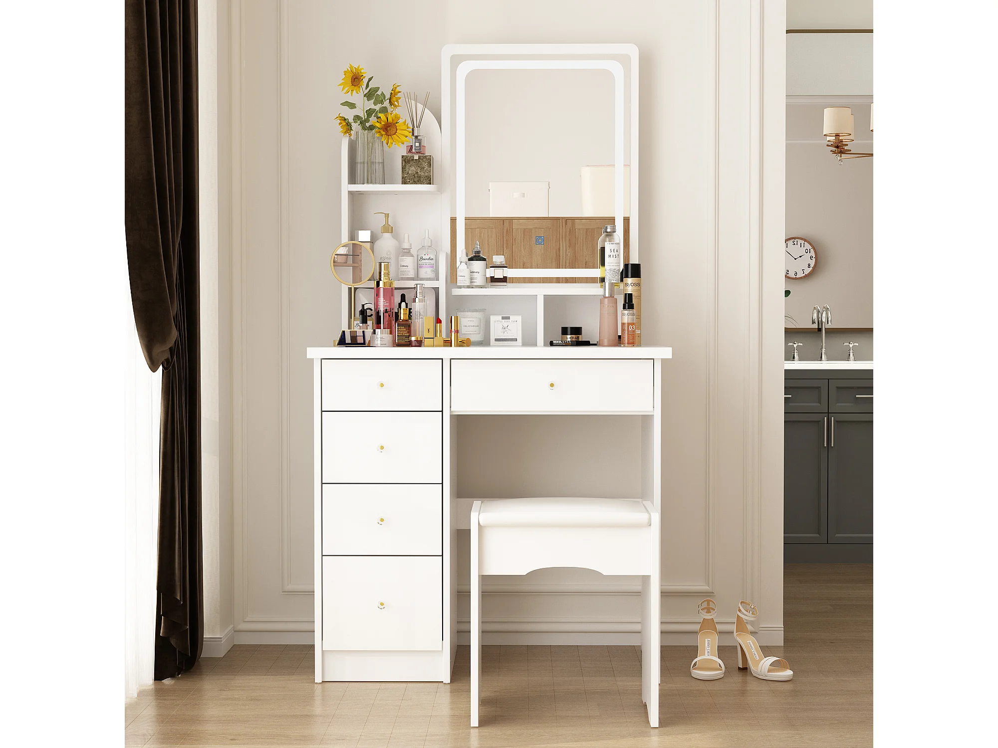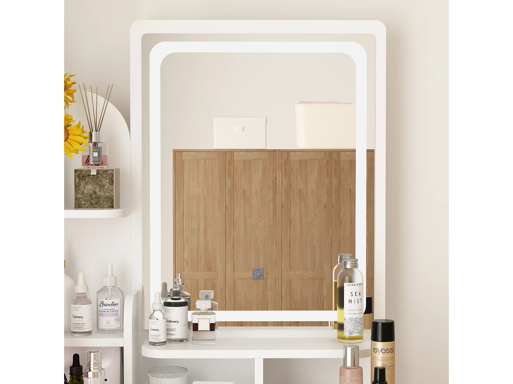 Coiffeuse Blanche avec Miroir et Tabouret, Table de Maquillage avec Lumière LED, Tiroirs et Compartiments, Chambre, 40x80x140