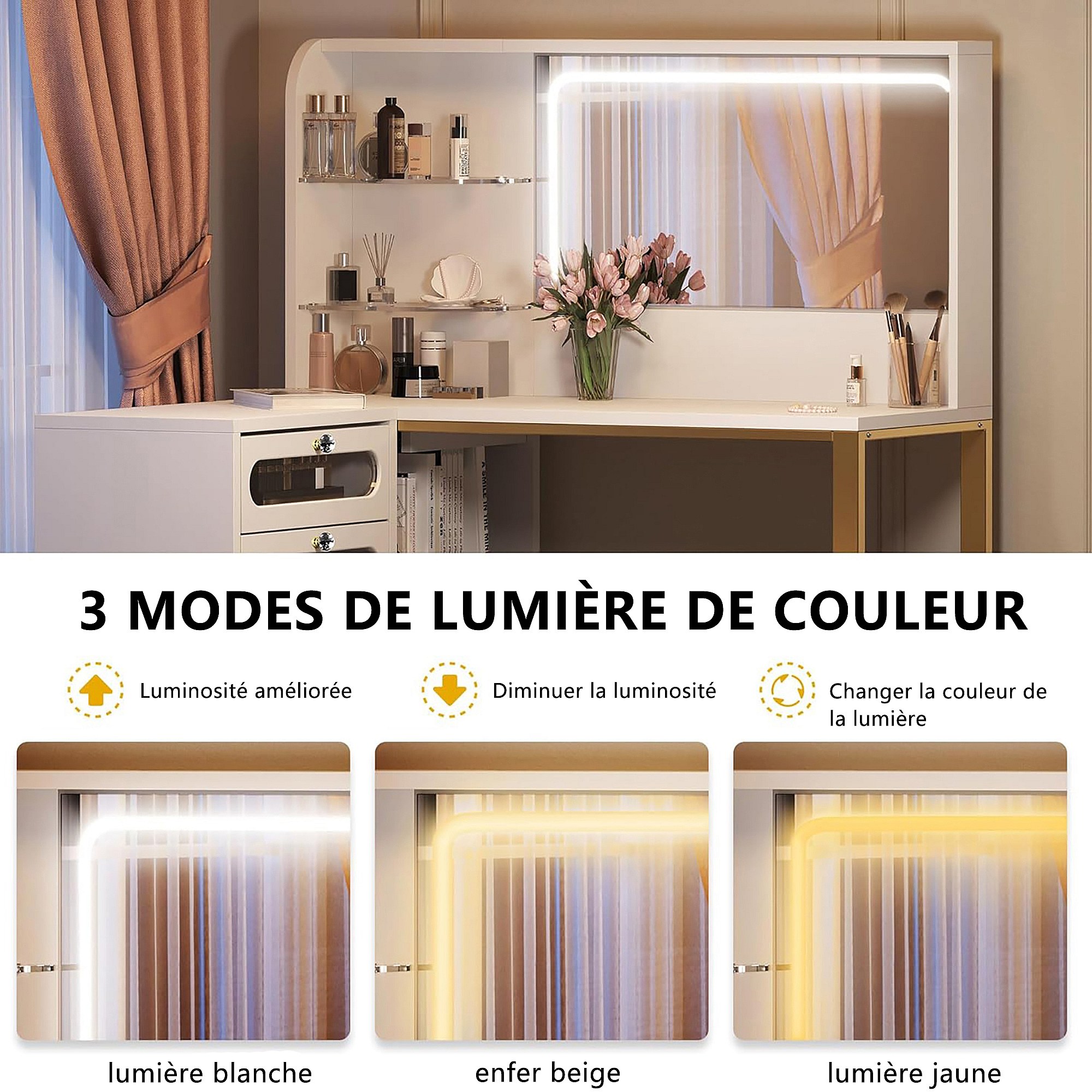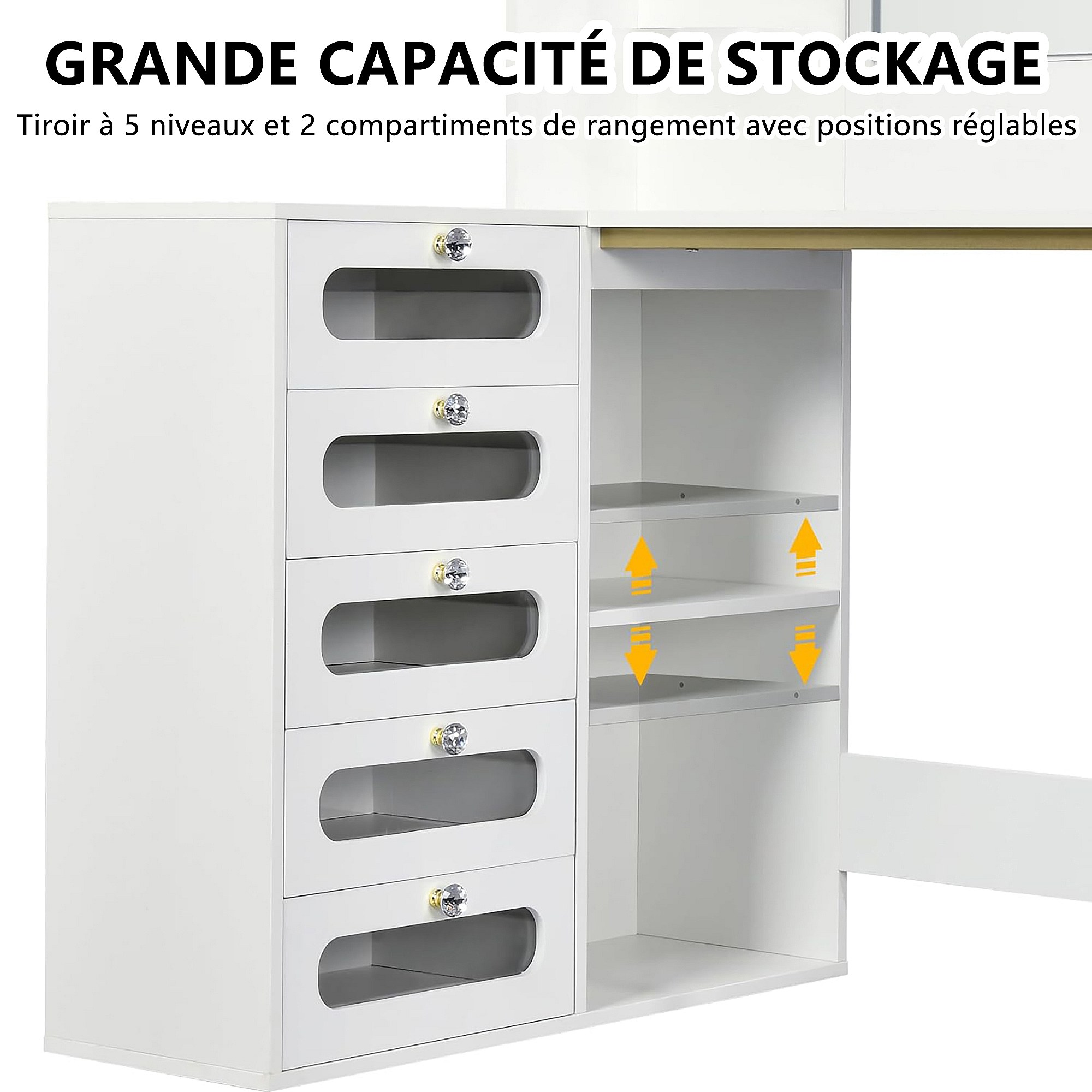 Coiffeuse avec Lumières, Luminosité Réglable, Coiffeuse avec Miroir, Table de Maquillage avec tabouret, 5 tiroirs et 4 étagères