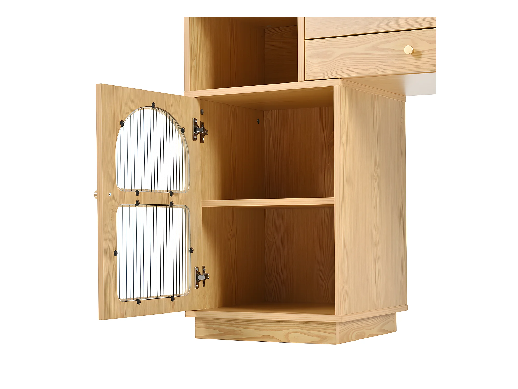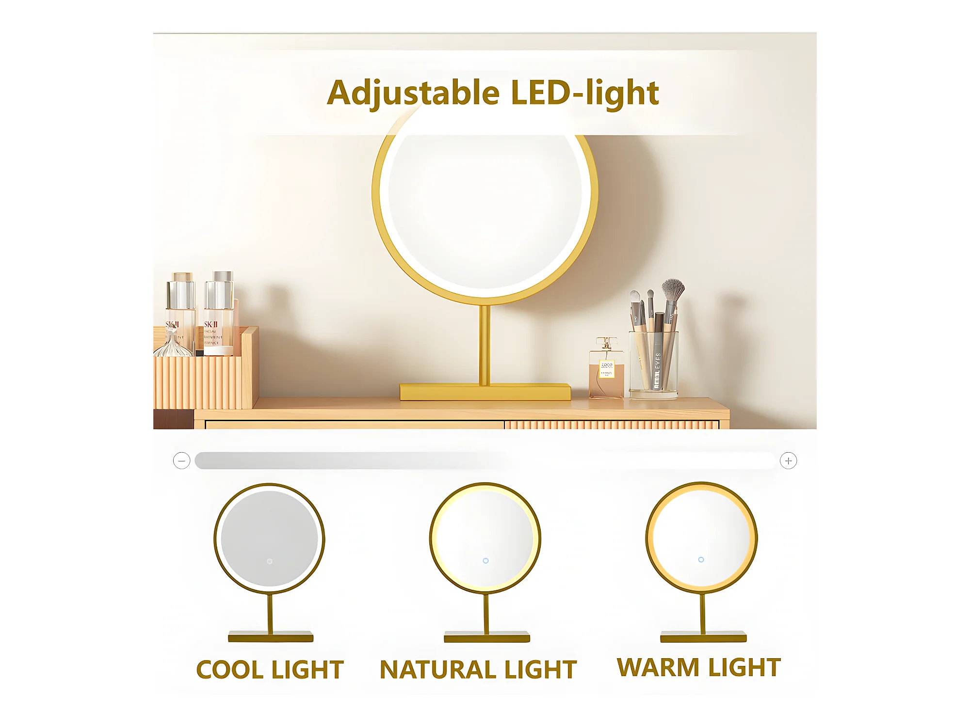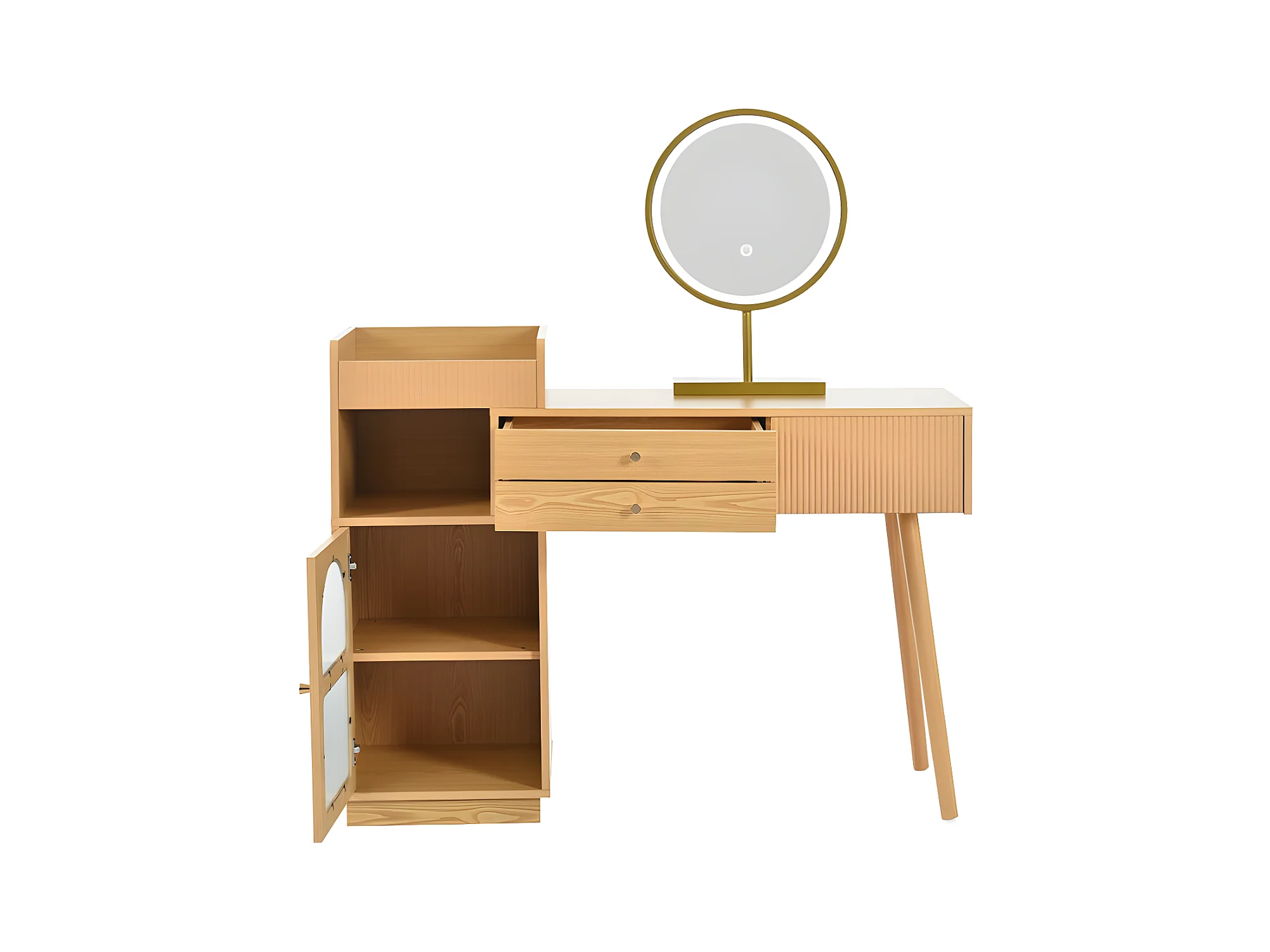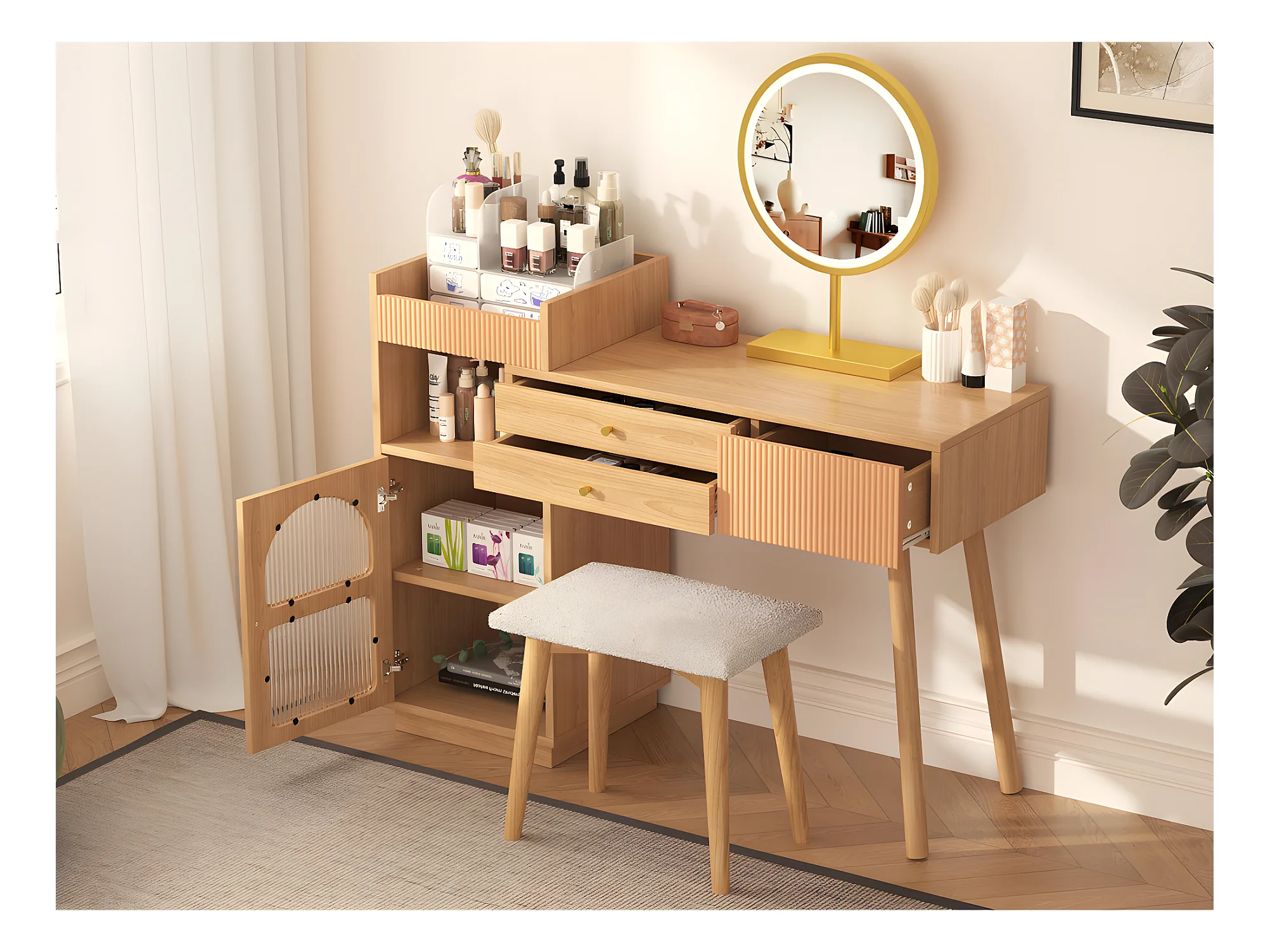 Coiffeuse avec miroir et éclairage LED - 3 tiroirs et une armoire latérale - Naturel (tabouret non inclus)