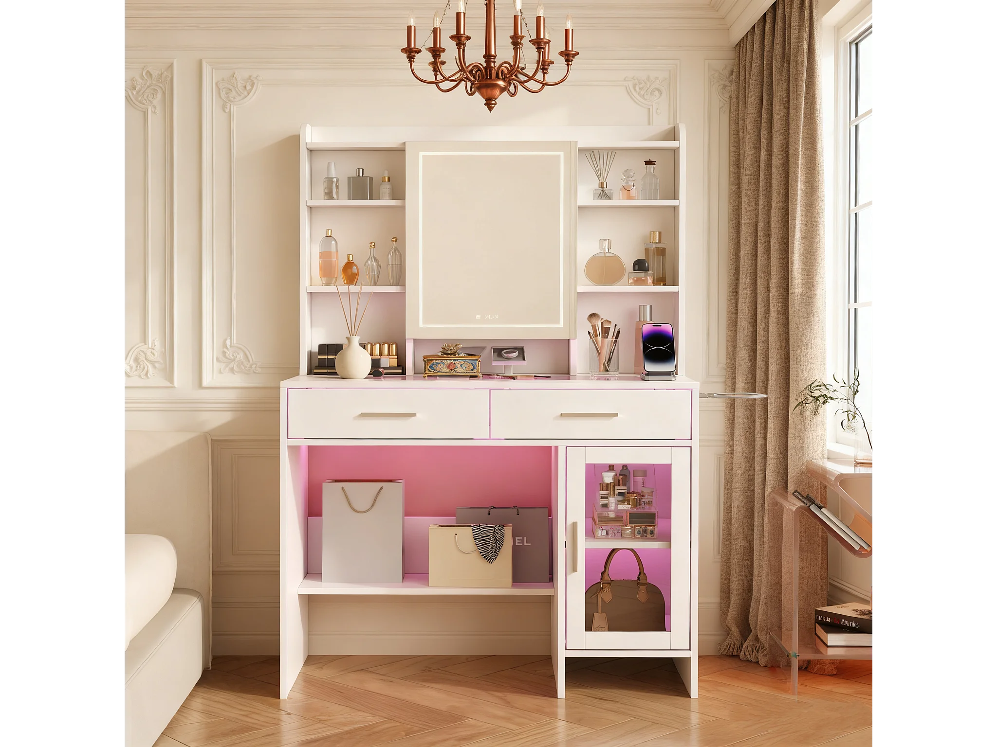 Coiffeuse - Miroir LED - Etagères Ouvertes et 2 tiroirs,1 porte - 3 Couleurs avec Luminosité Réglable - Blanc - Prise Électrique - support pour sèche-cheveux