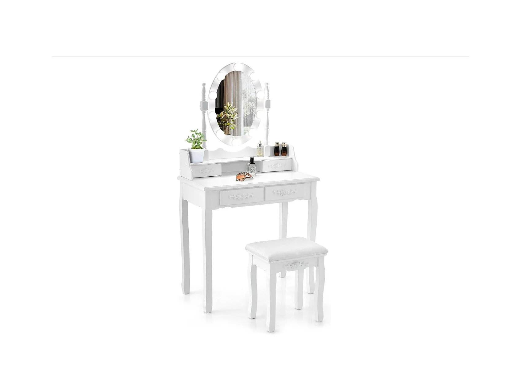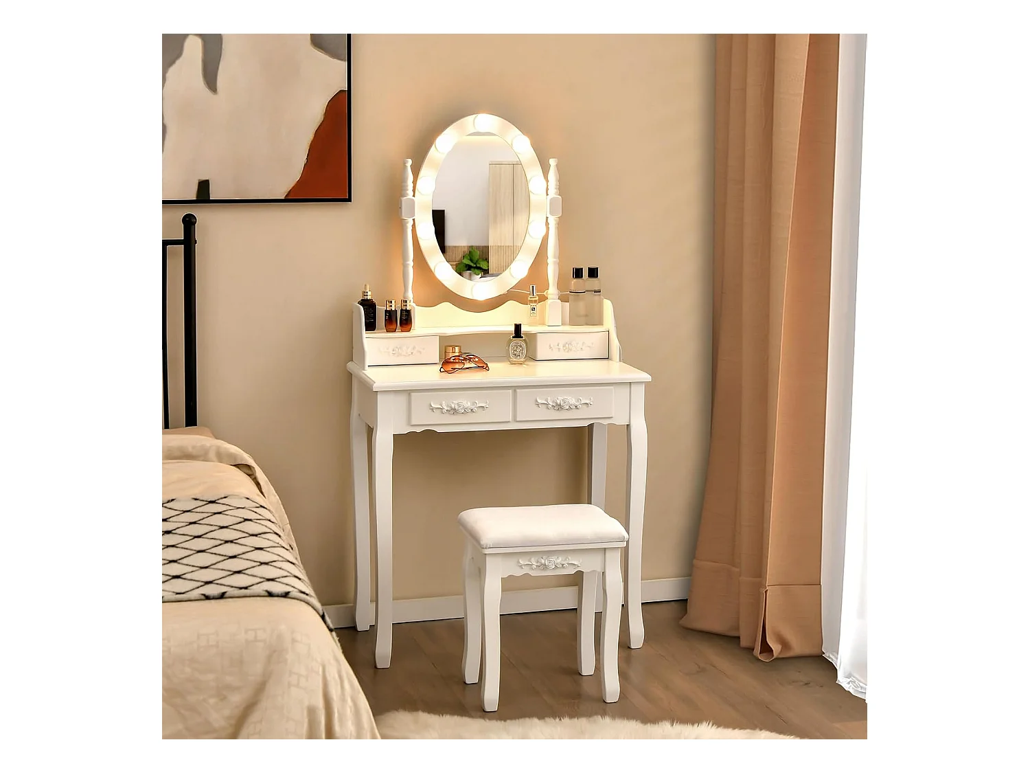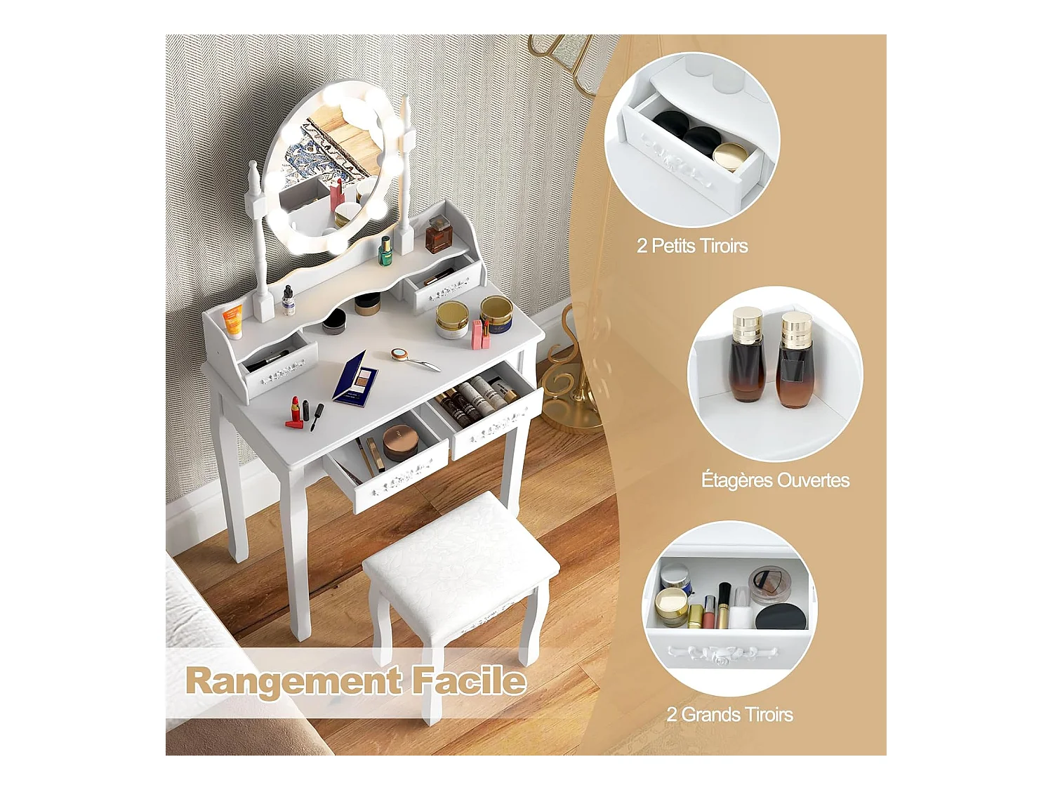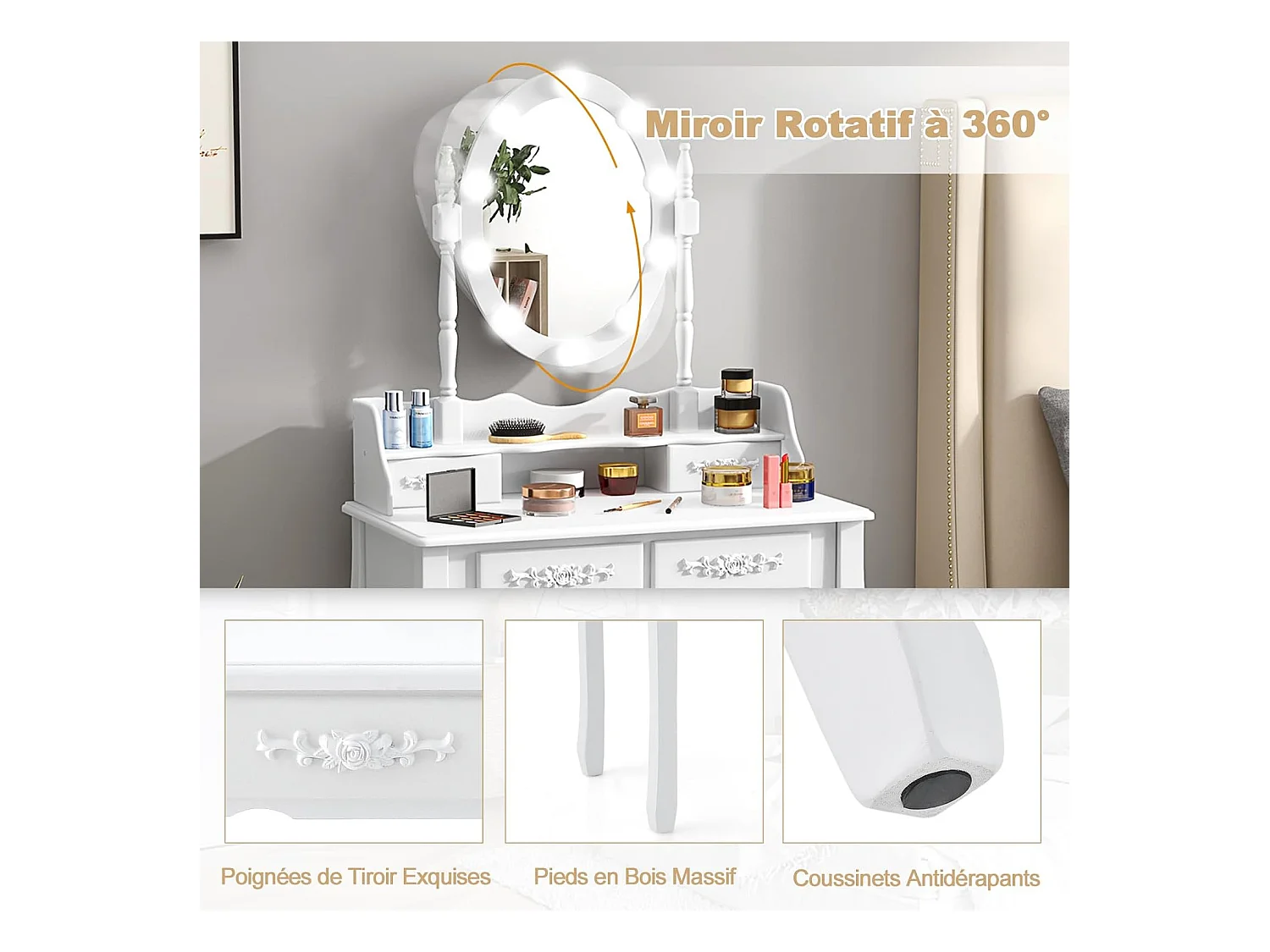 Coiffeuse avec Eclairage, Miroir Ovale, Pivotant à 360°, 10 Lumières, Tabouret Rembourré Inclus, avec 3 Tiroirs de Rangements, Blanc