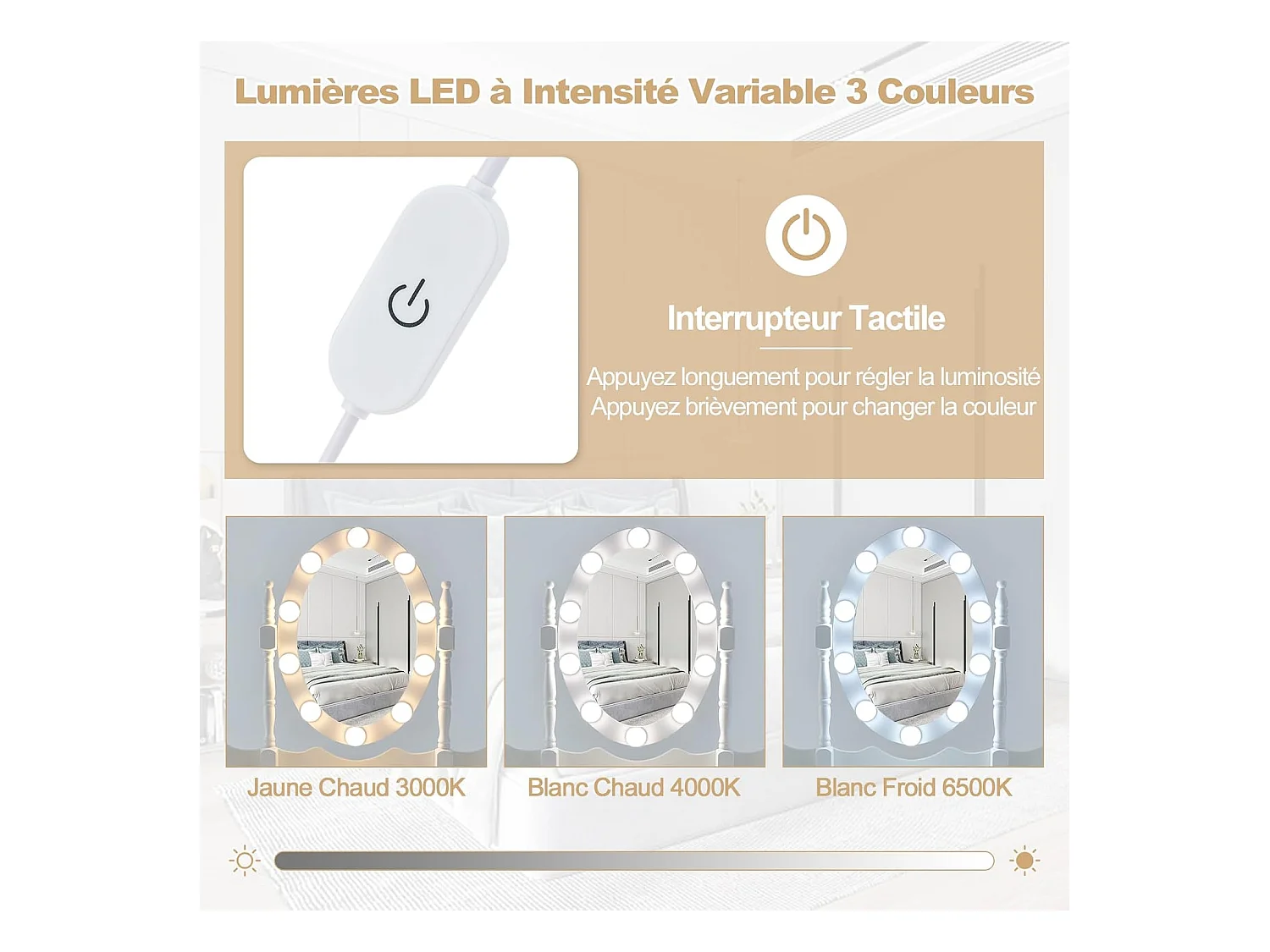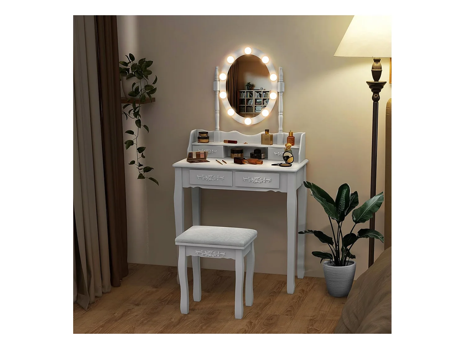 Coiffeuse, Table de Maquillage avec 10 Ampoules LED à Intensité Variable Tabouret avec 5 Tiroirs et Boîtes de Rangement Amovibles, Blanc
