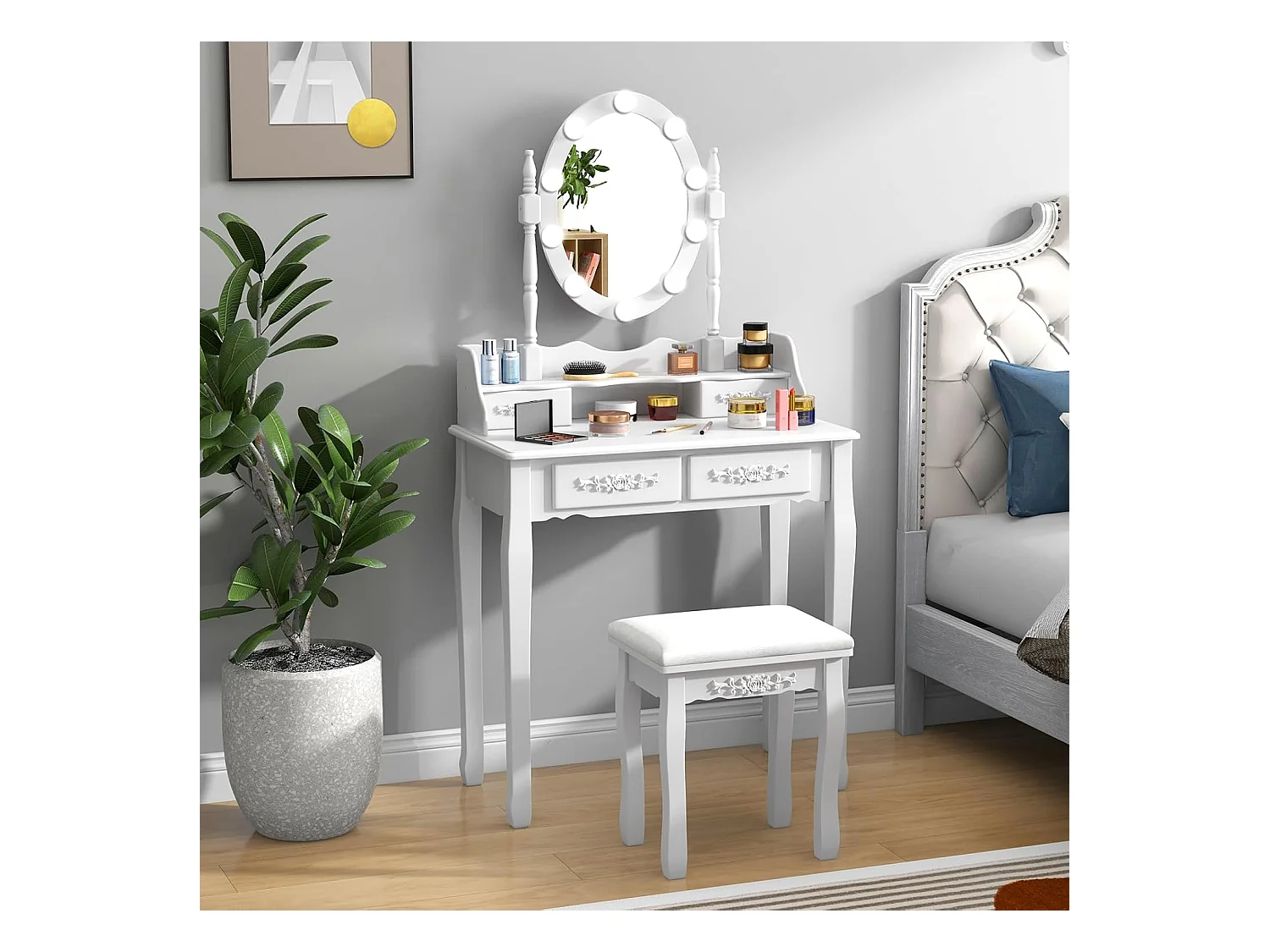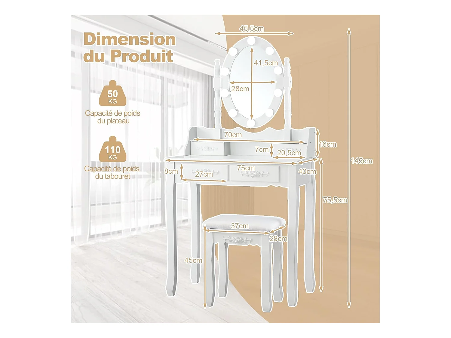 Coiffeuse Table de Maquillage 75x40x145CM avec Miroir Ovale 1 Tabouret Pieds en Pin et 4 Tiroirs Blanche