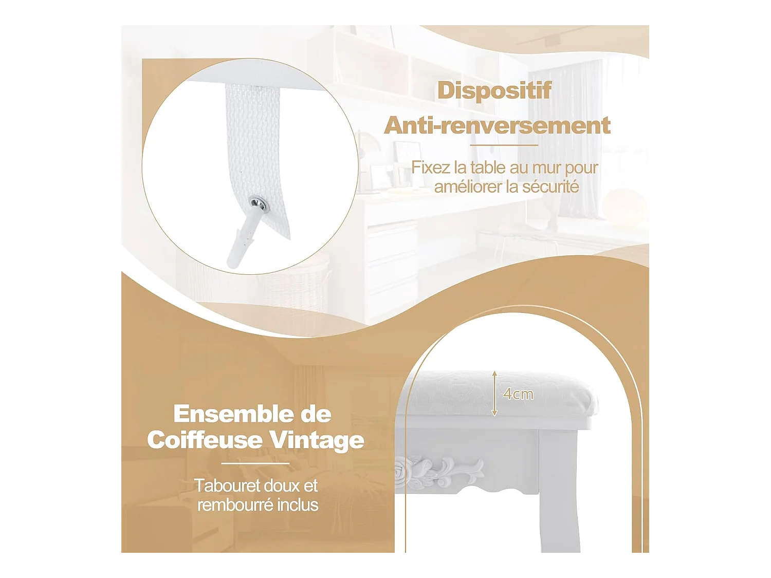 Coiffeuse avec Tabouret Table de Maquillage avec 3 Tiroirs et Dessus Amovible Blanc