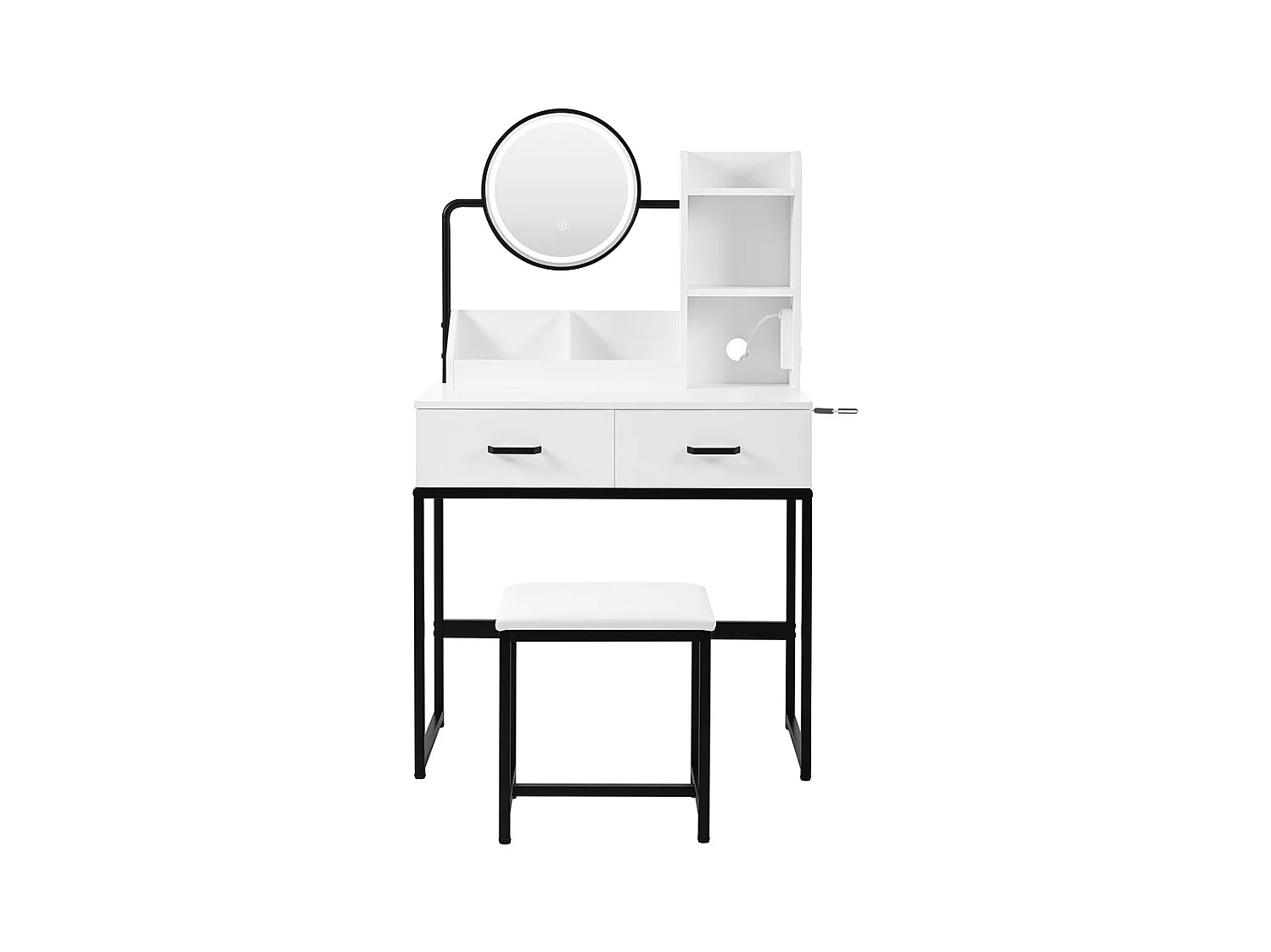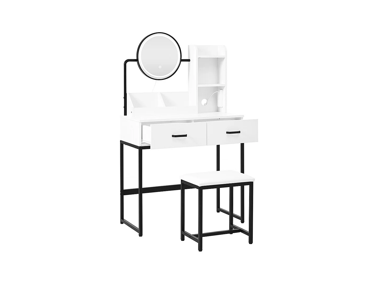Coiffeuse blanc éclairage LED miroir pivotant prises électriques 2 tiroirs 2 étagères ouvertes pieds métal noir