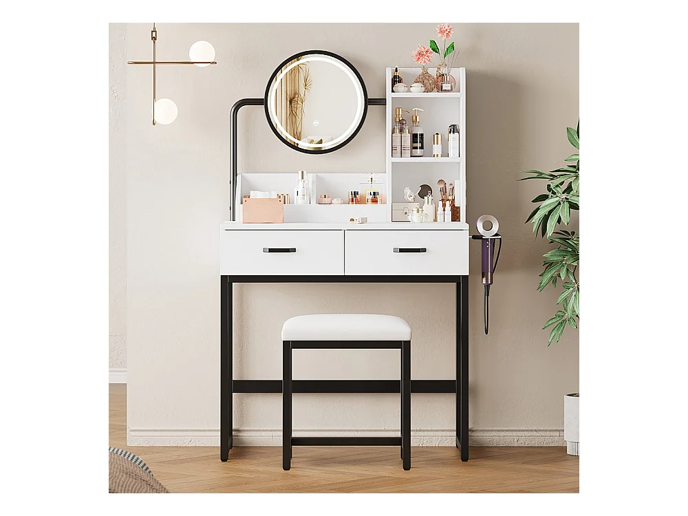 Coiffeuse avec miroir et tabouret CAEN LED Blanc