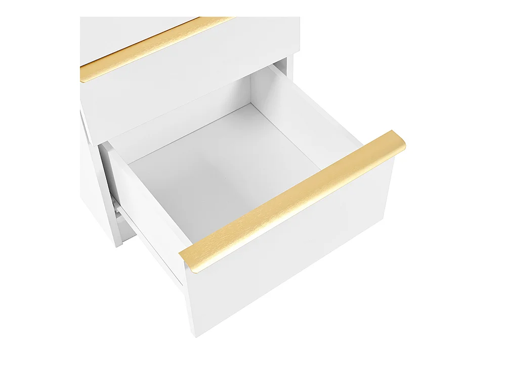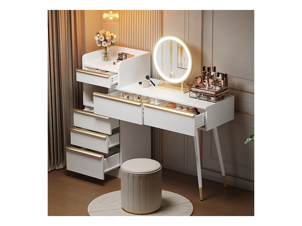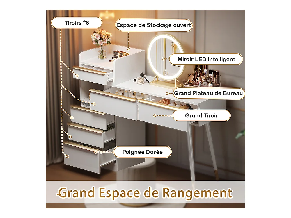 Coiffeuse blanc plateau coulissant 6 tiroirs poignées dorées miroir LED lumière tamisable sans tabouret