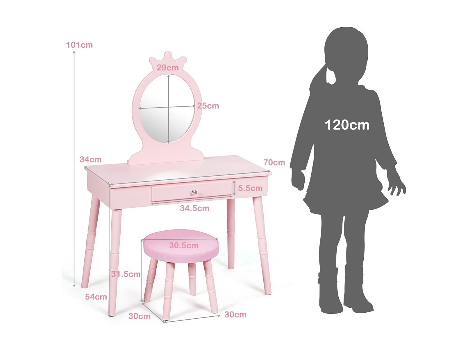 Coiffeuse et tabouret Rose 65x36x128 cm Bois de paulownia MDF FR782679