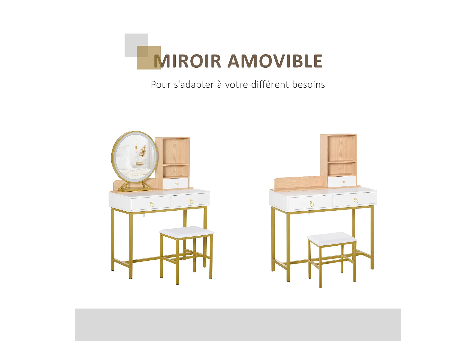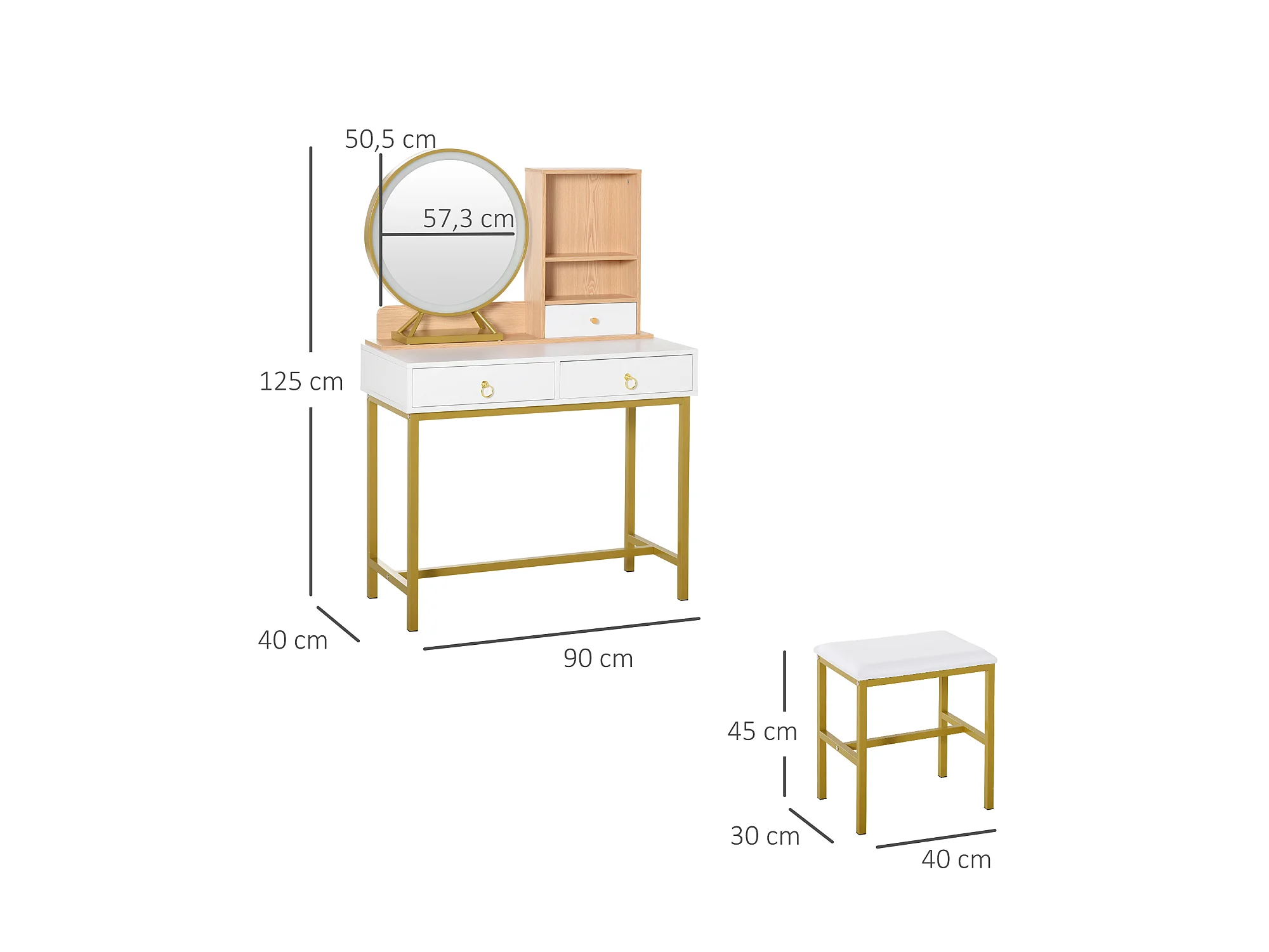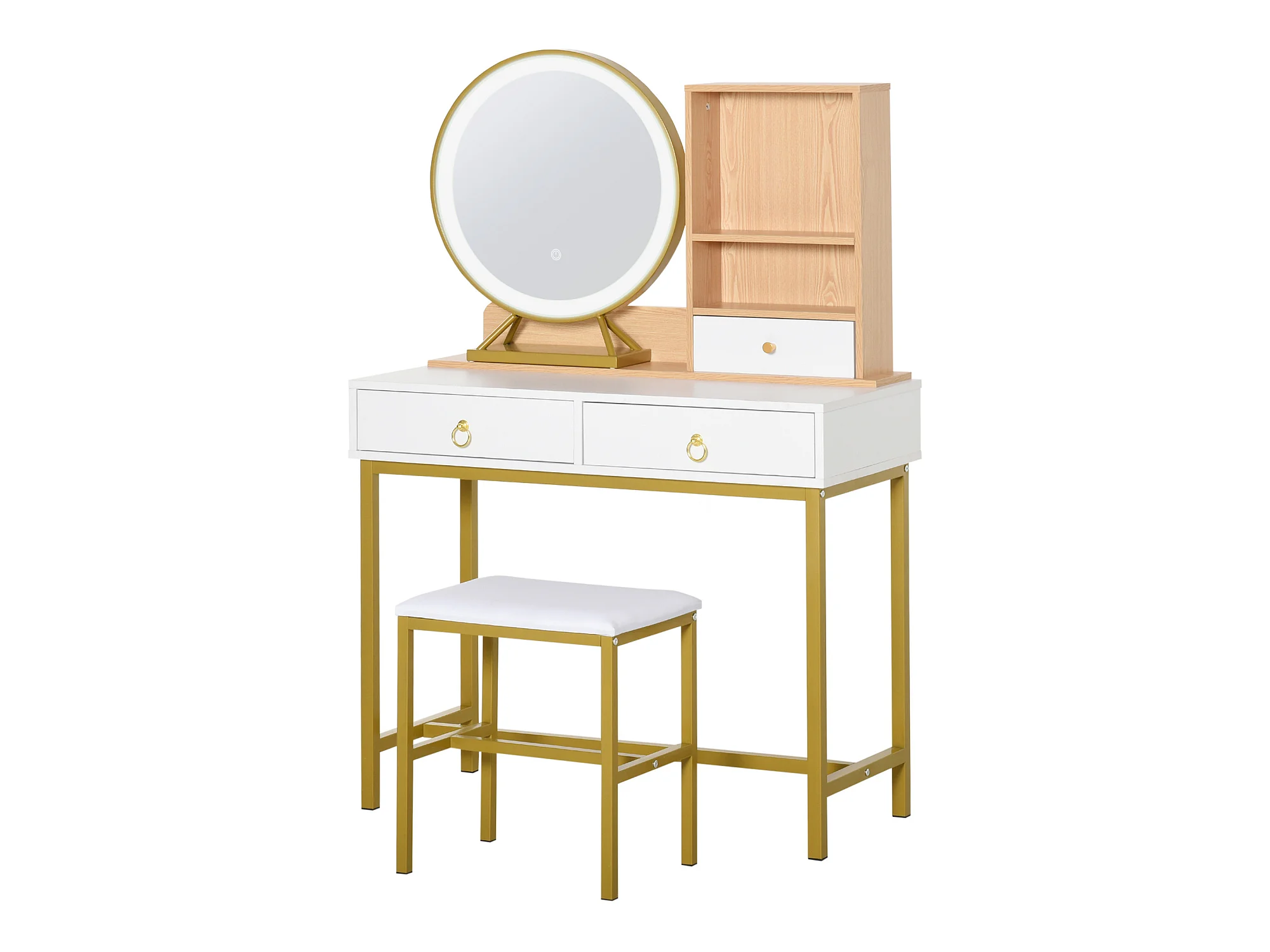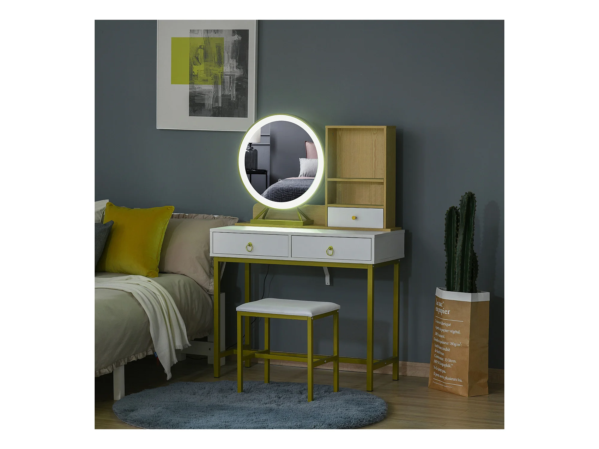 Coiffeuse design art déco - miroir LED intégré - 3 tiroirs, 2 niches - tabouret inclus - métal doré panneaux particules blanc bois clair