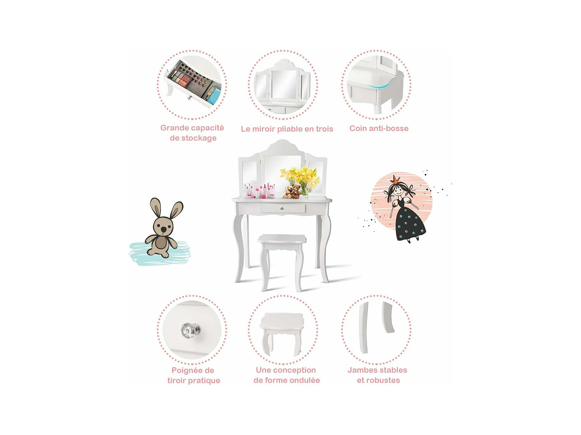 Coiffeuse pour enfants avec miroir à trois volets, ensemble de coiffeuse 2-en-1