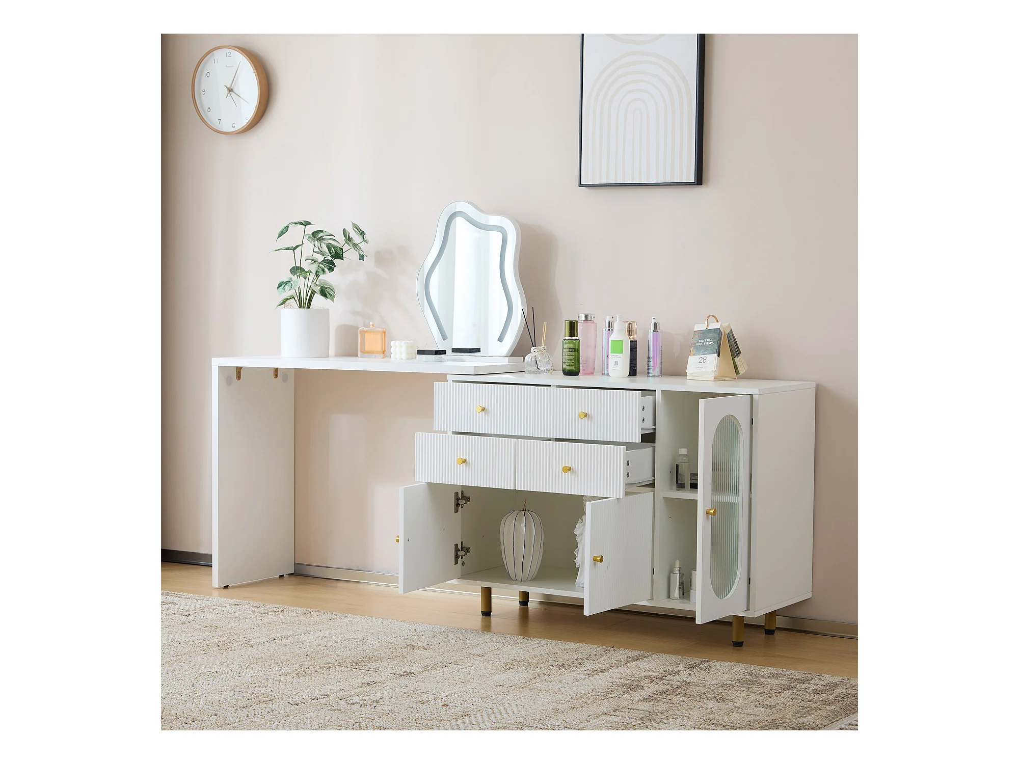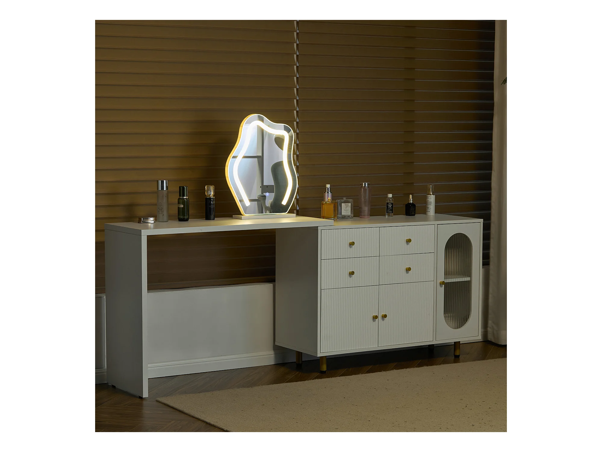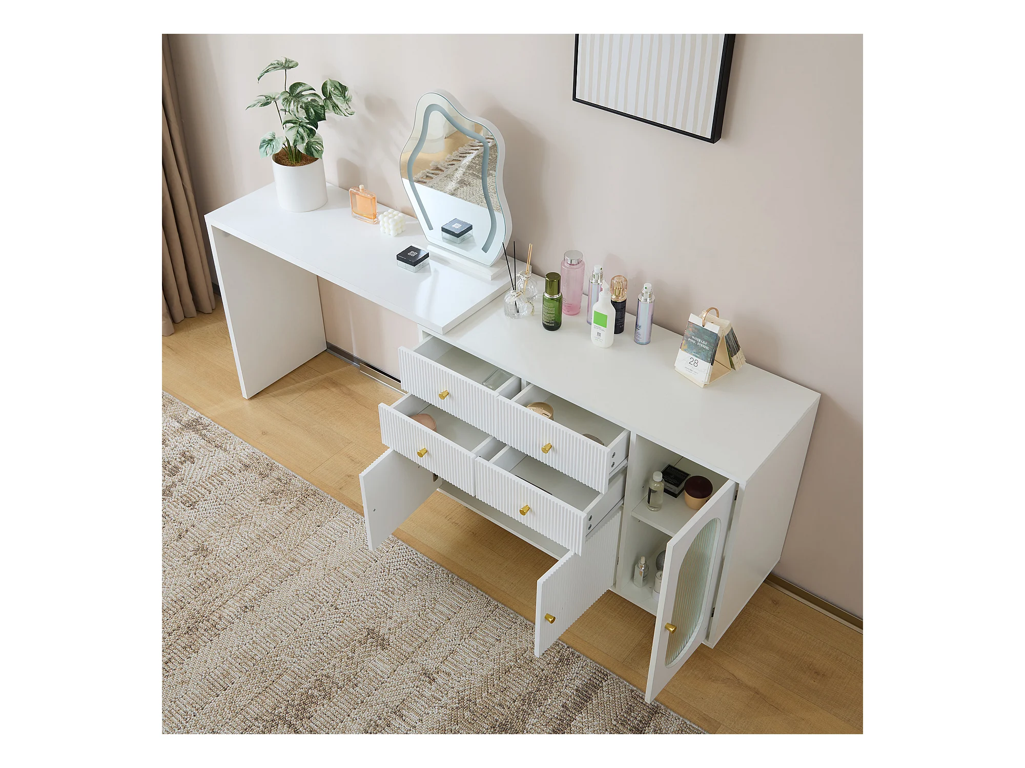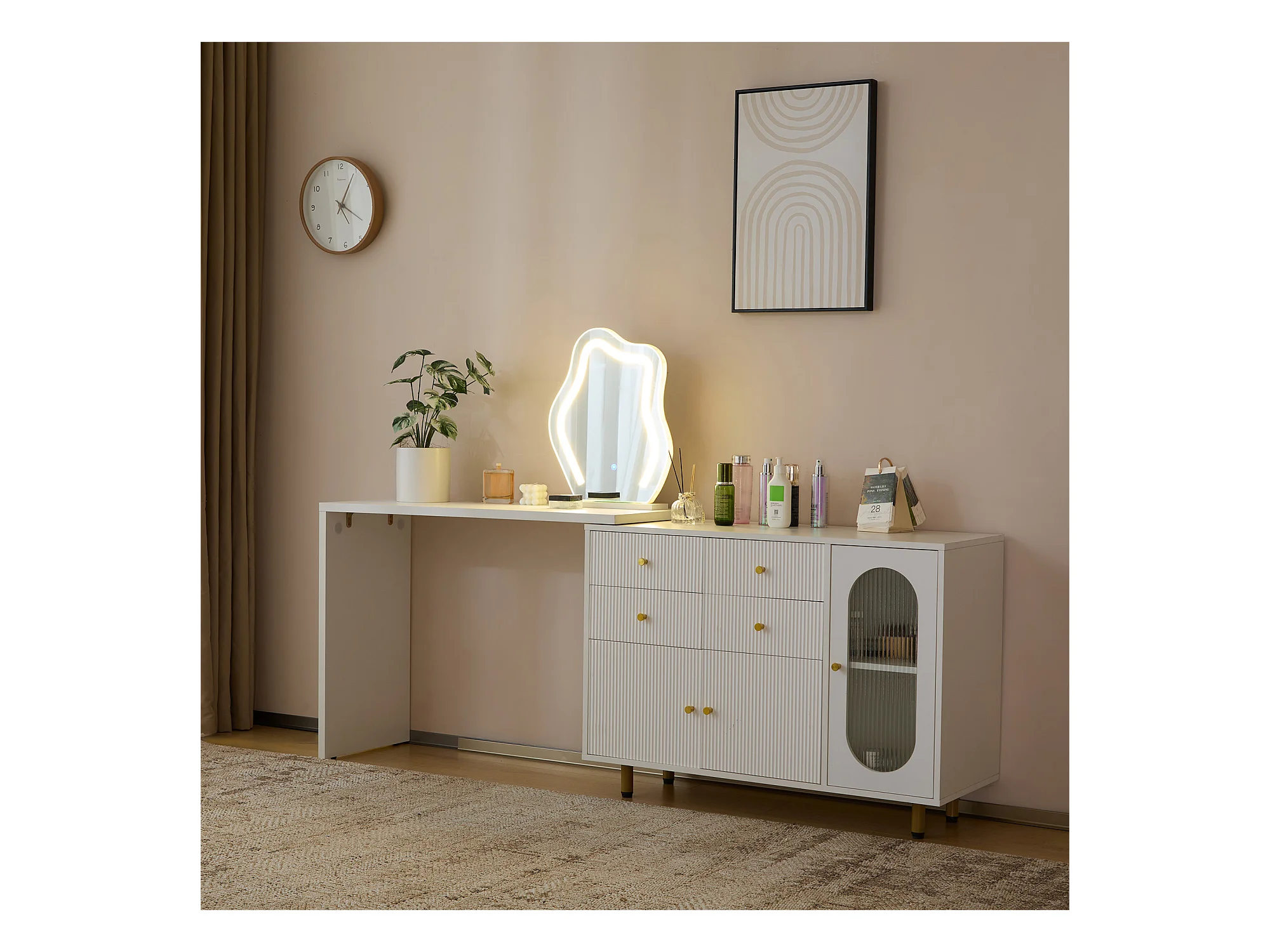 Coiffeuse extensible avec miroir, 4 tiroirs et 3 portes - 100 x 40 x 74.5 cm - Panneau de particules - LEDs - Blanc (sans tabouret)
