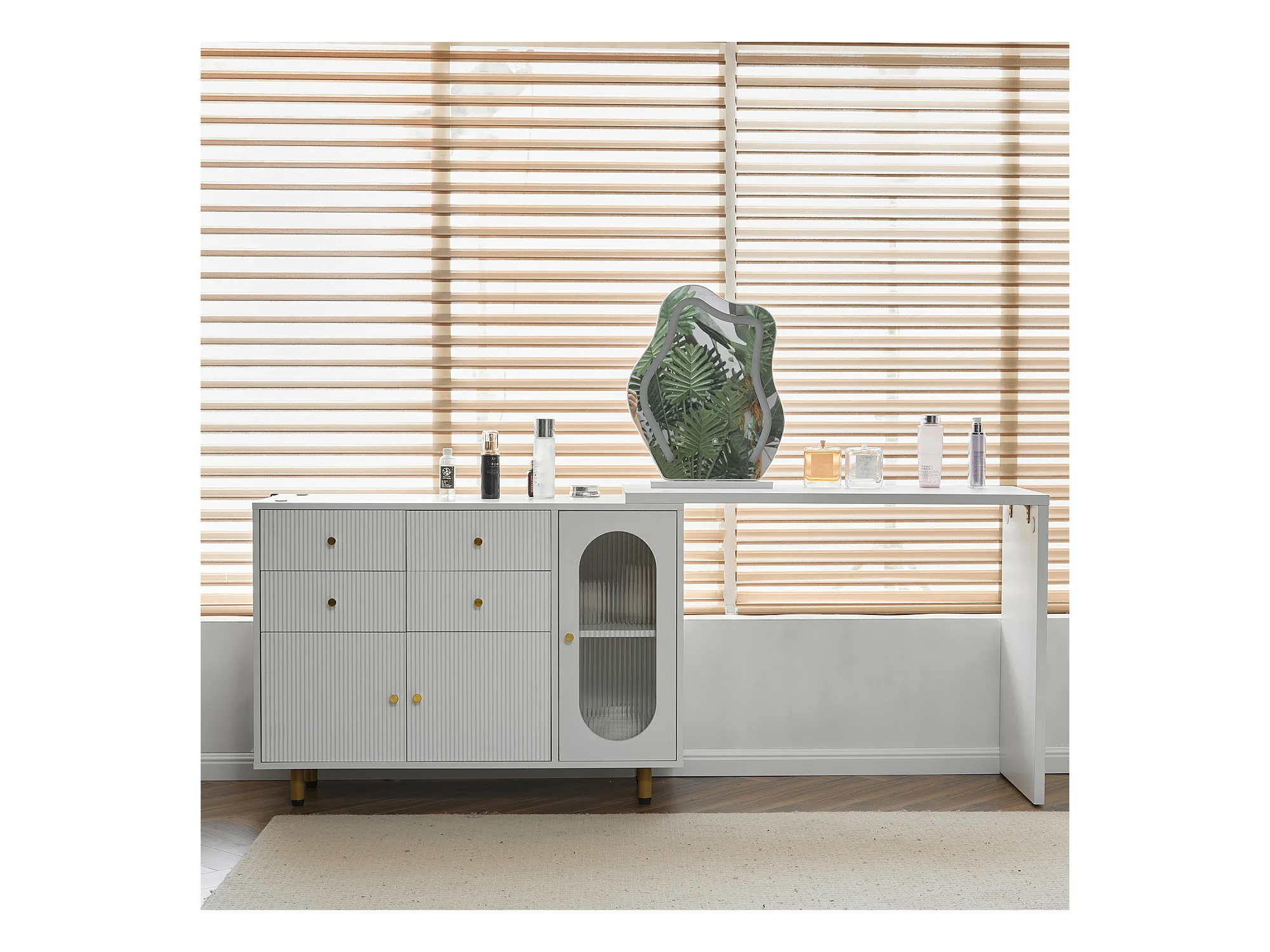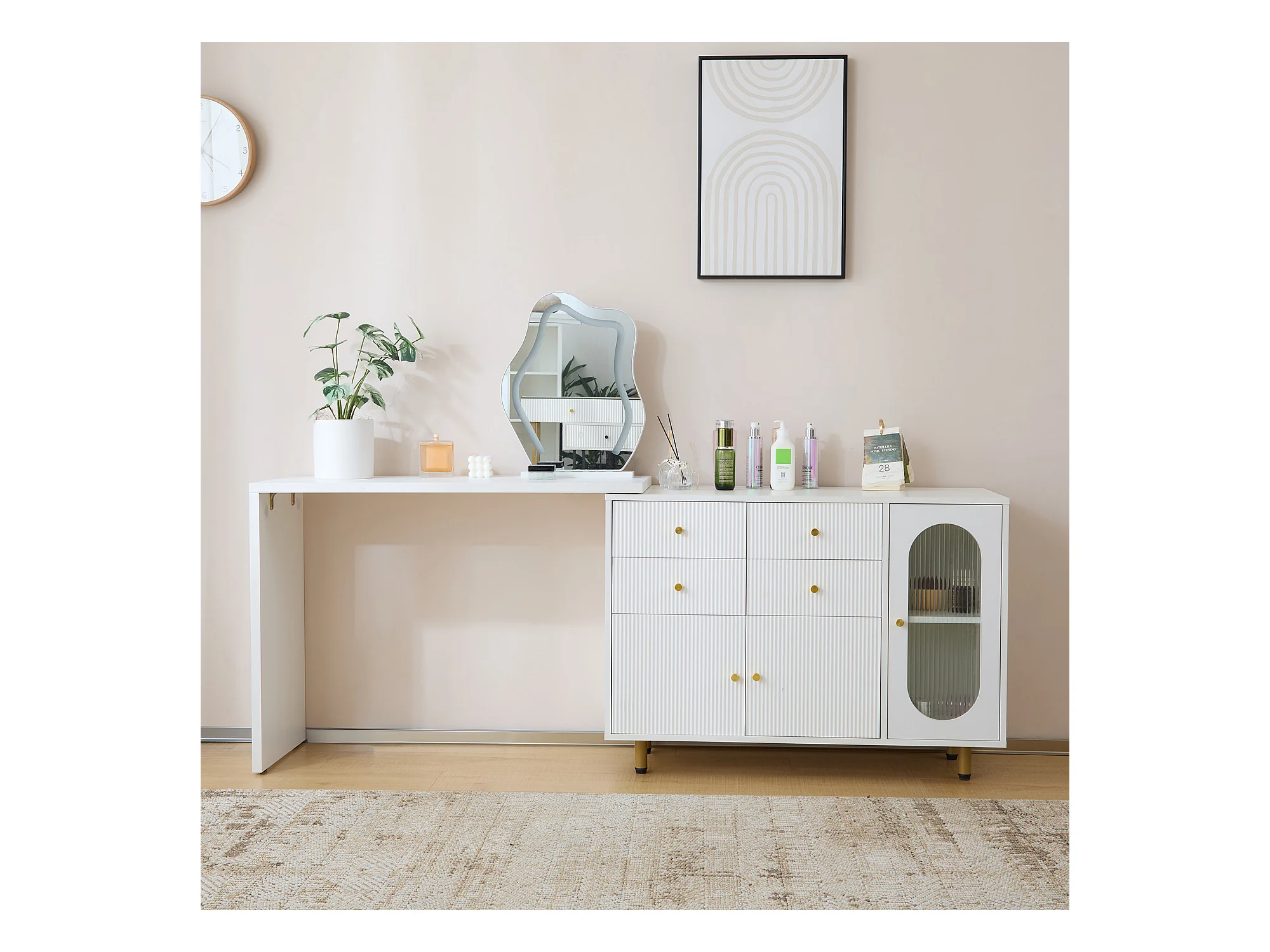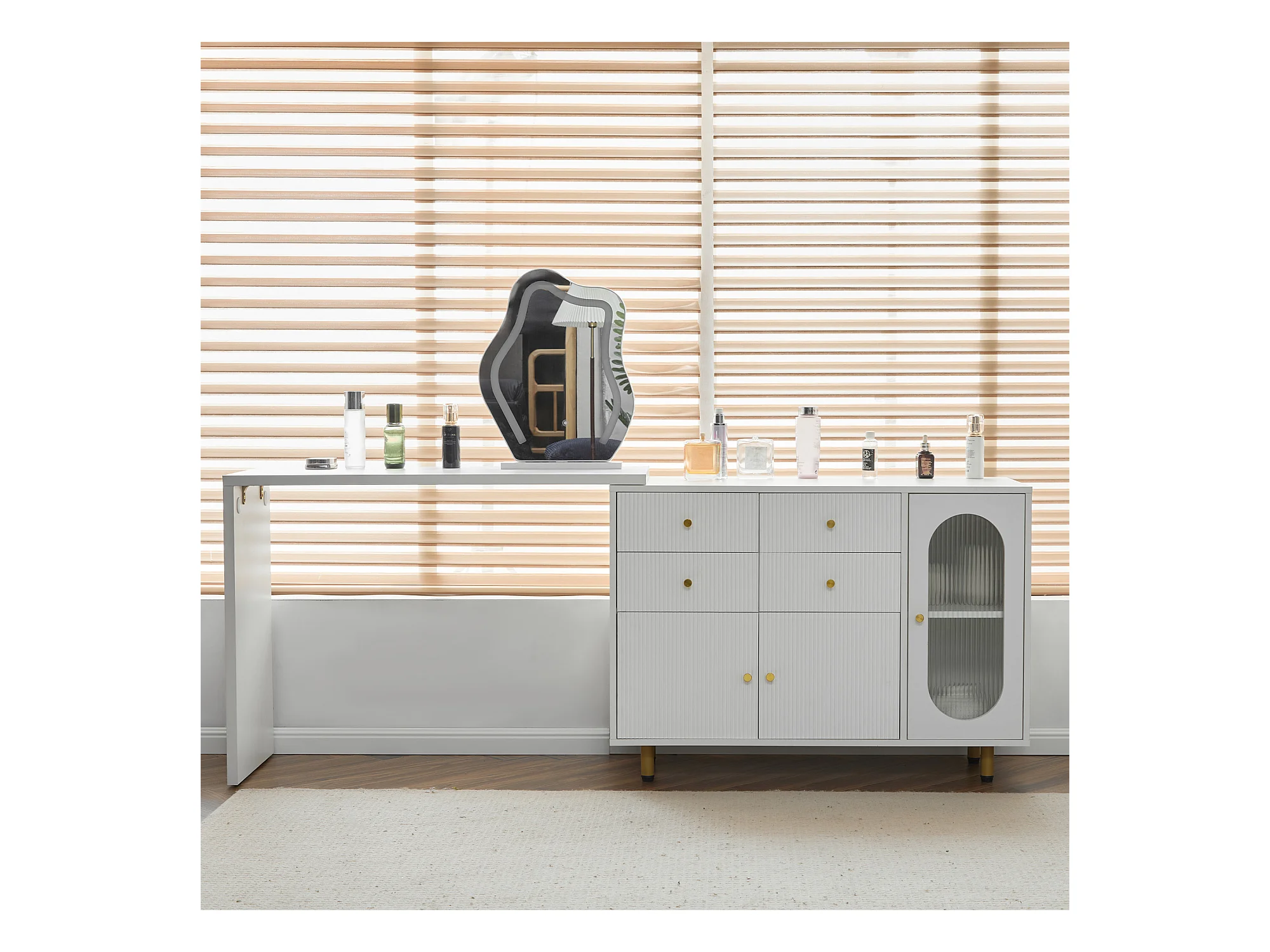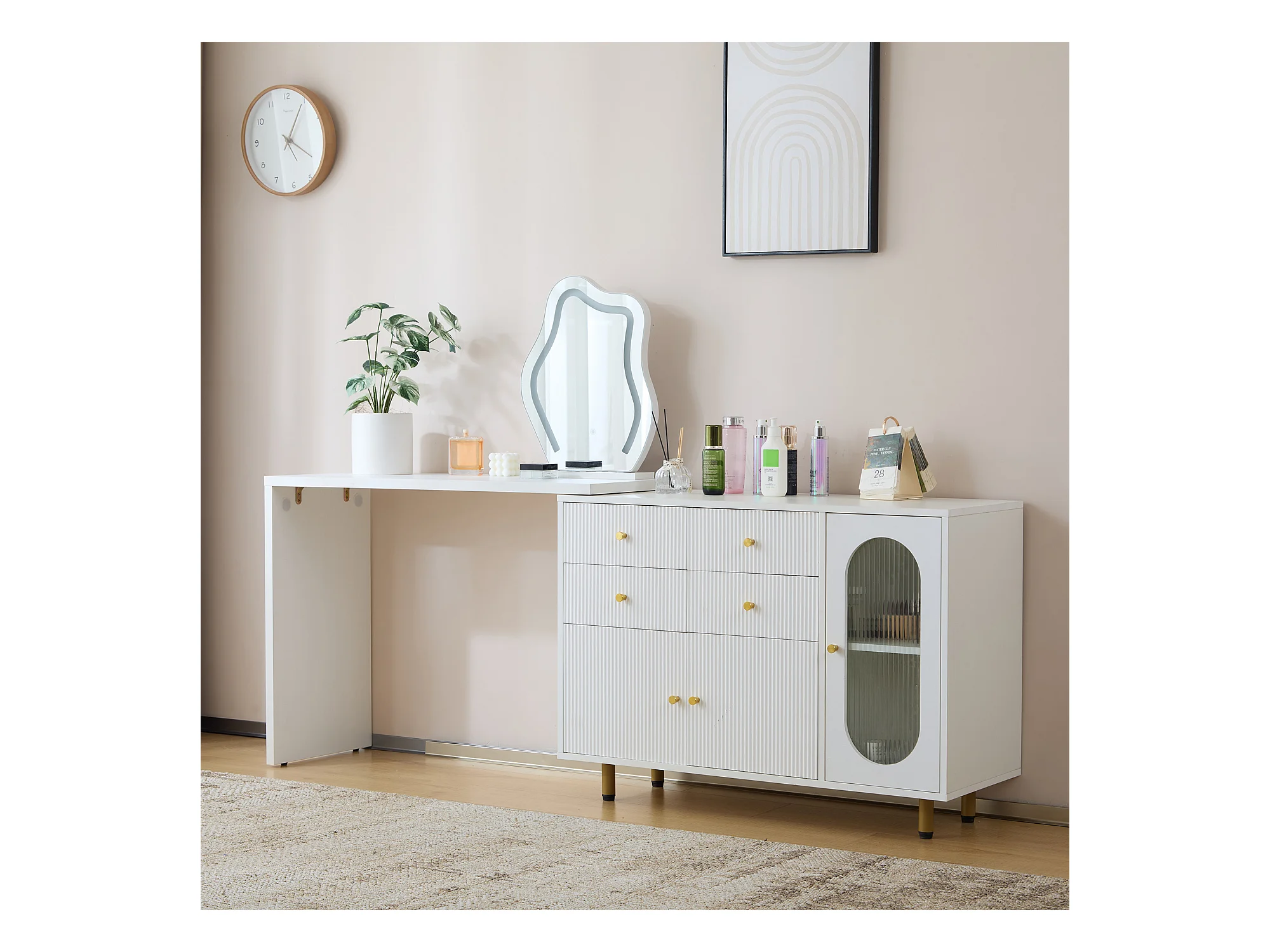 Coiffeuse extensible avec miroir, 4 tiroirs et 3 portes - 100 x 40 x 74.5 cm - Panneau de particules - LEDs - Blanc (sans tabouret)