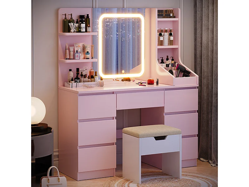 Coiffeuse LED avec 7 grands tiroirs, 6 couleurs et luminosité réglable, coiffeuse avec miroir pour chambre à coucher