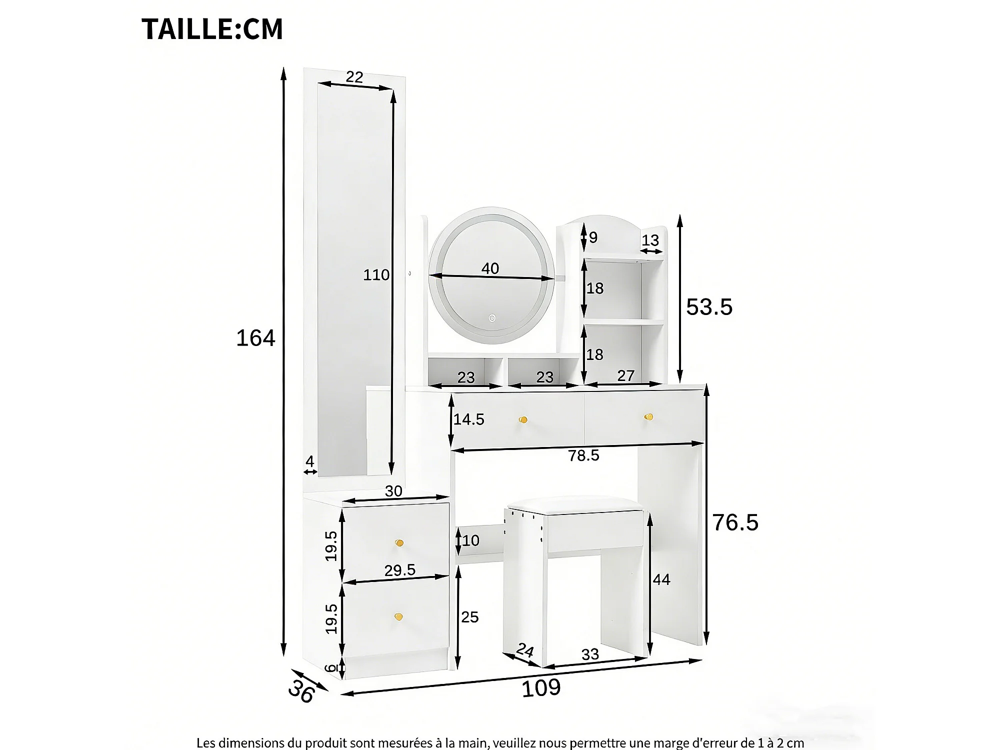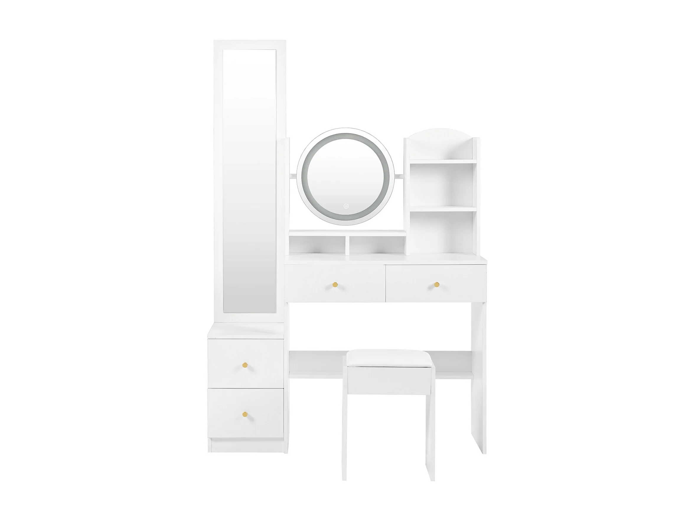 Coiffeuse miroir 4-en-1 - Table de Maquillage avec miroir rotation 360° et Miroir pleine longueur - LED et tabouret - 164 × 109 × 36 cm - Blanc