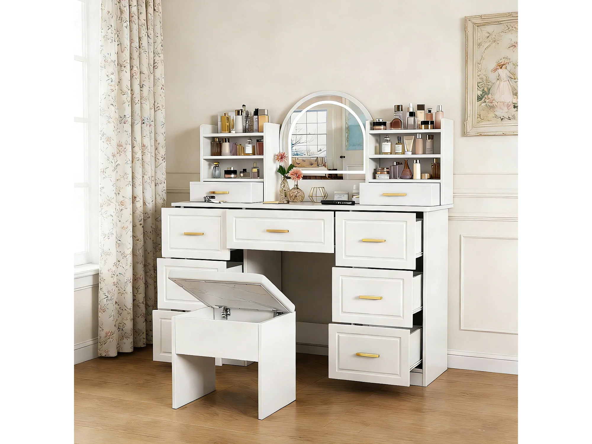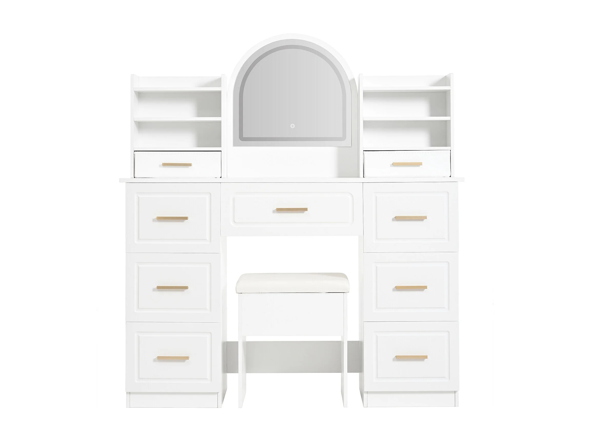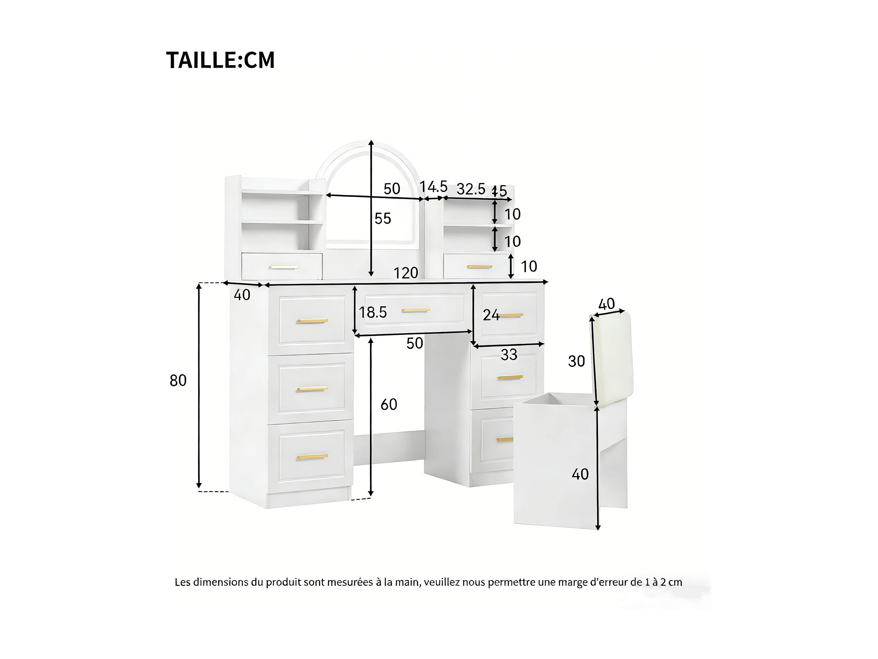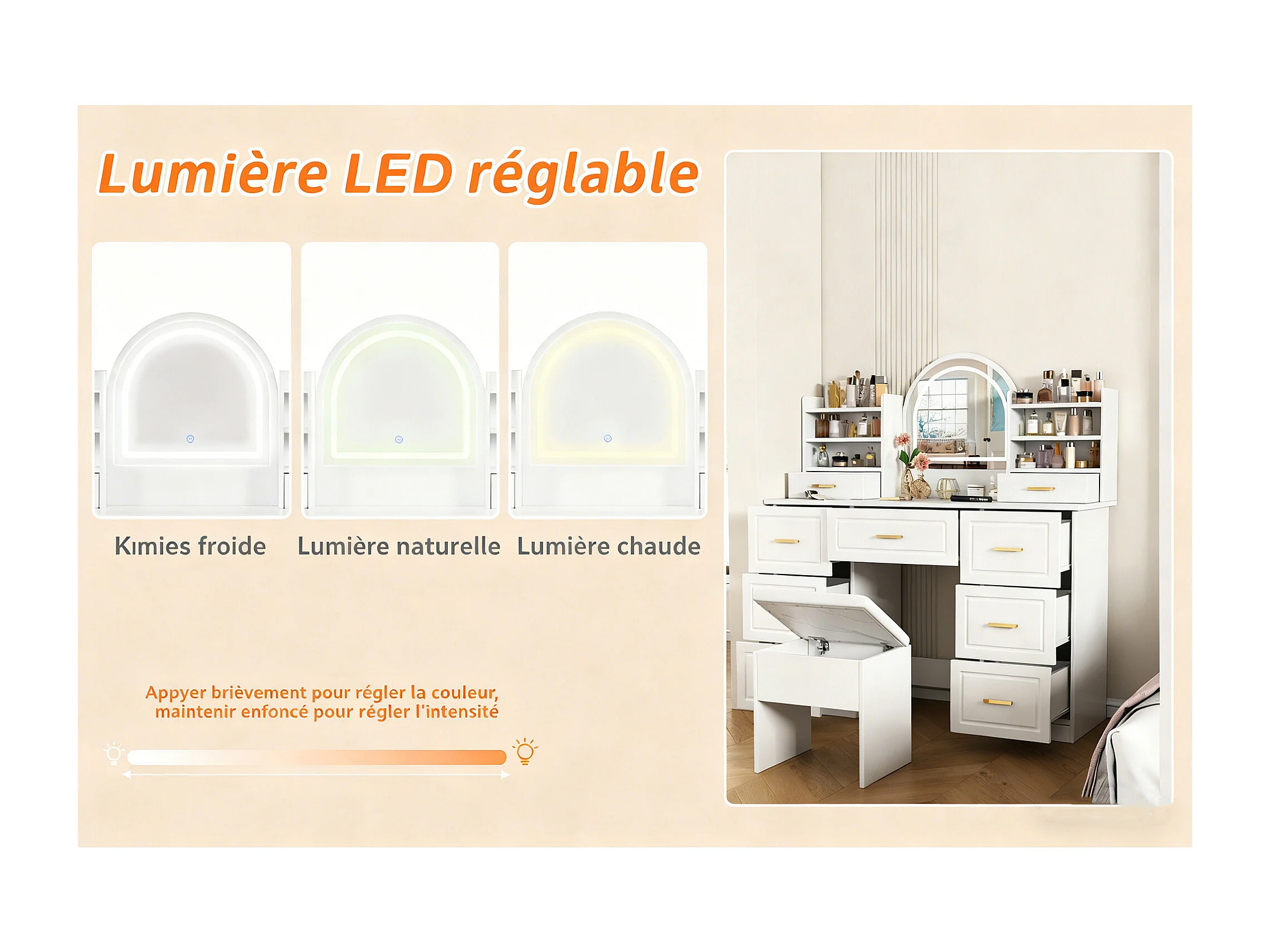 Coiffeuse miroir avec LED - Table de Maquillage avec tabouret de rangement - 9 tiroirs et 4 étagère - 120 x 40 x 135cm - PB - Blanc