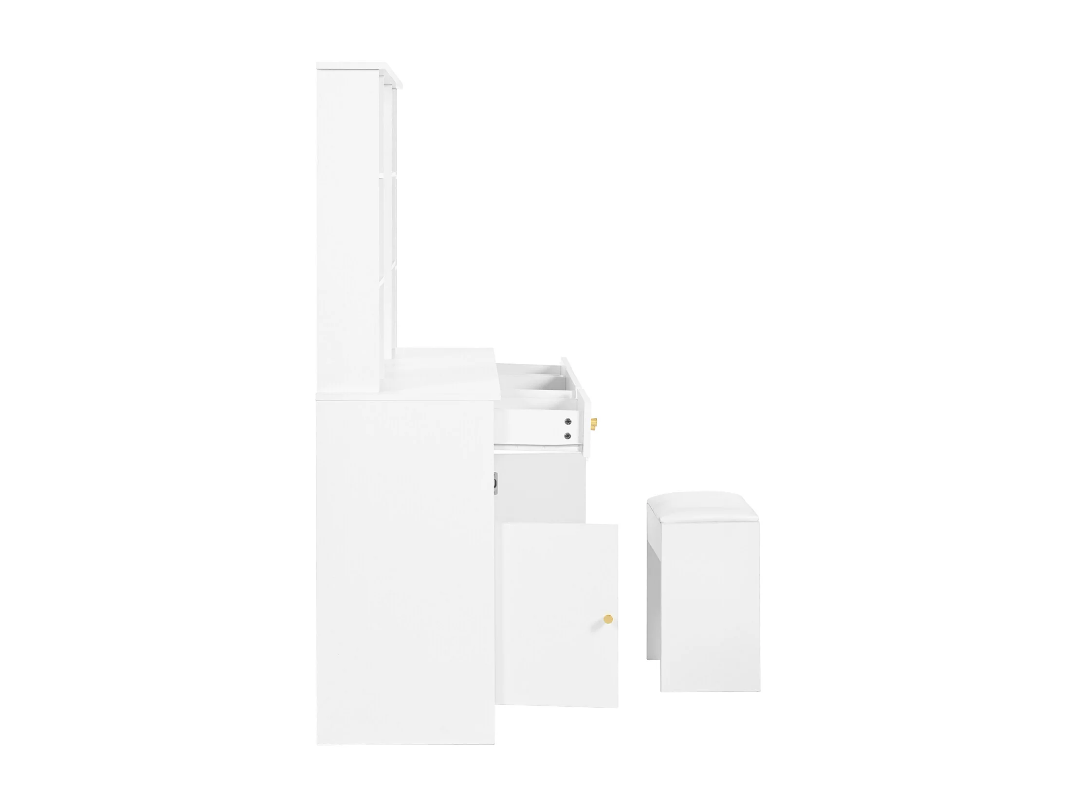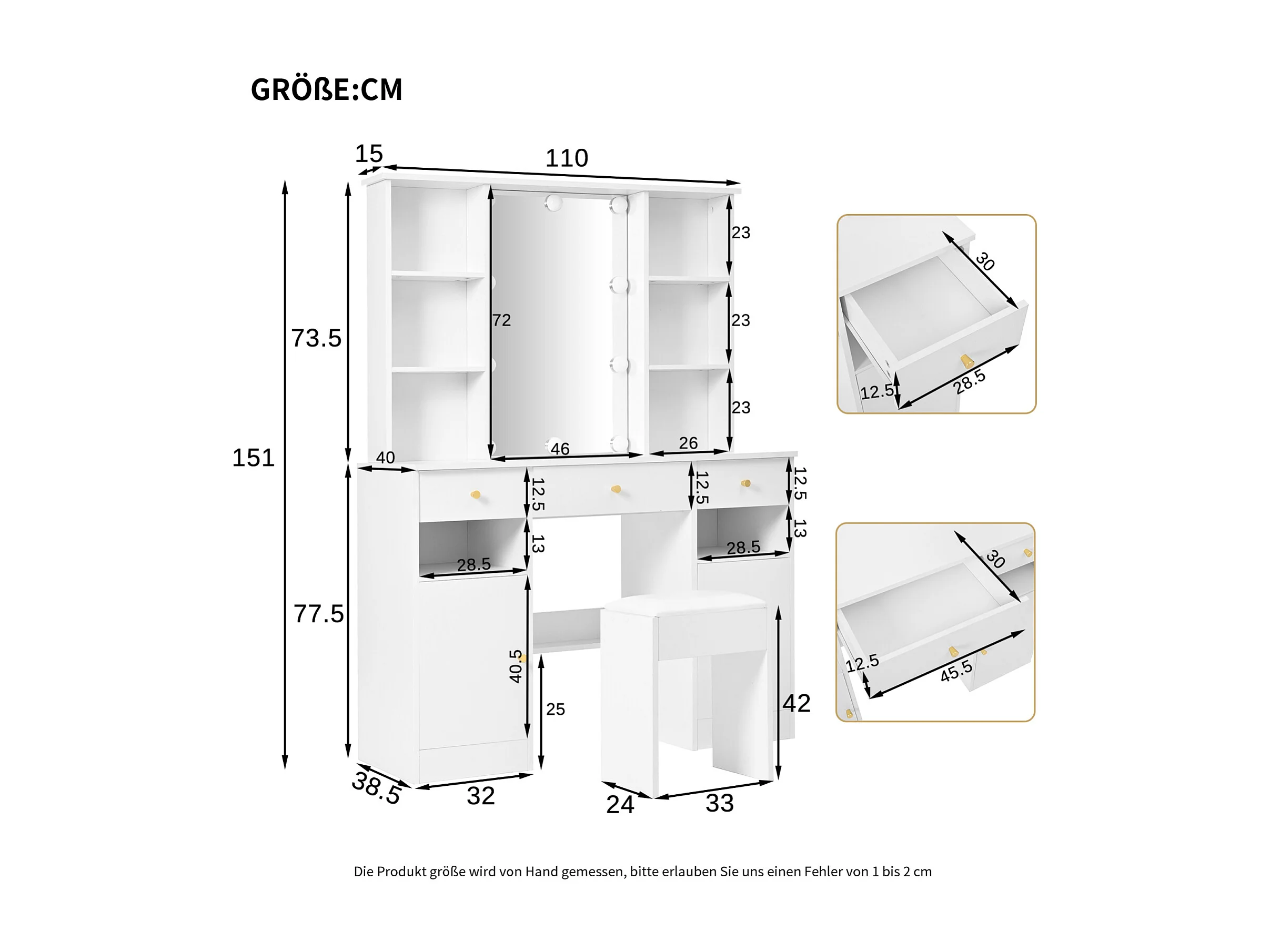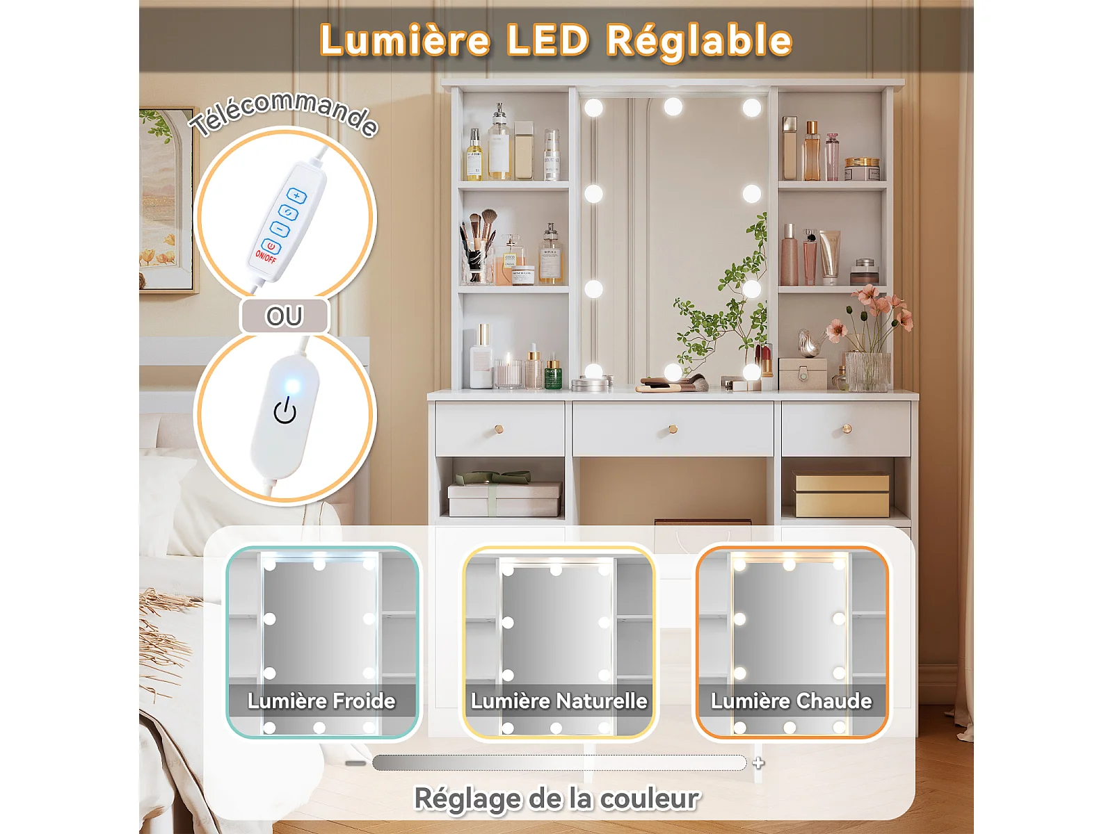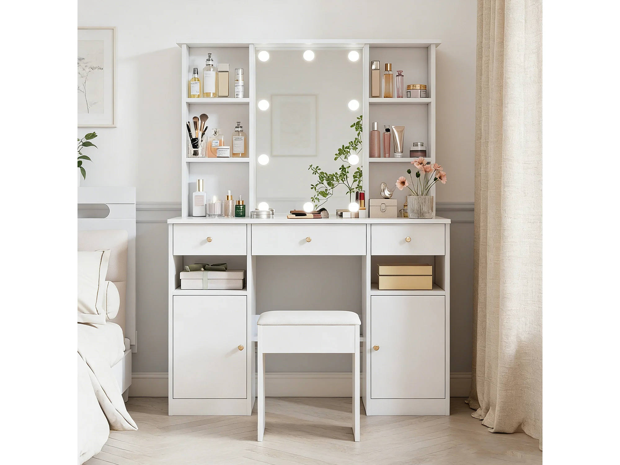 Coiffeuse miroir avec Lumières - Table de Maquillage avec tabouret - 4 Etagères Ouvertes et 3 tiroirs - 105 × 152 × 40 cm - Blanc