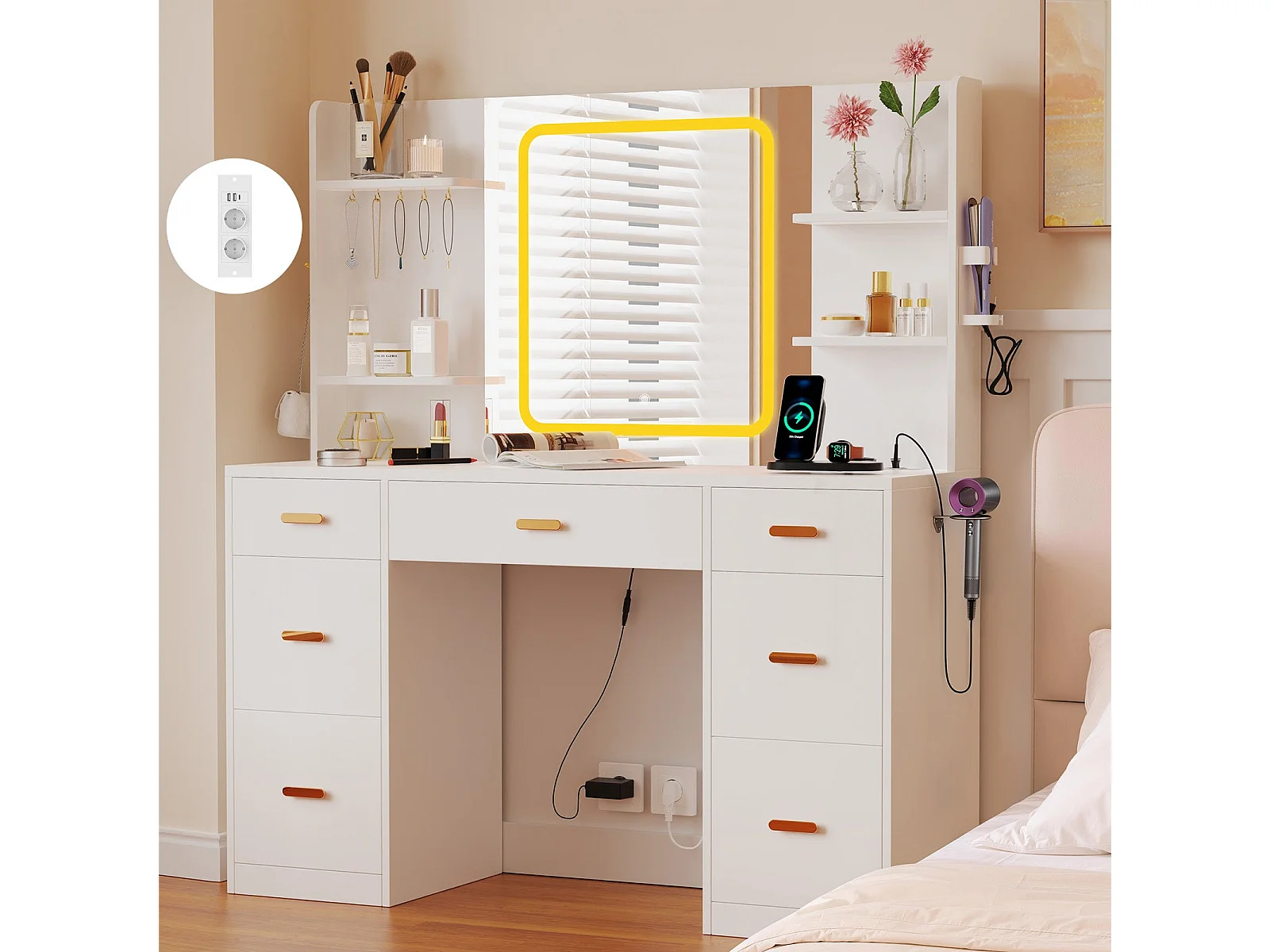 Coiffeuse | Miroir Coiffeuse avec Éclairage LED | Luminosité Réglable | 7 Tiroirs | 4 Étagères et 5 Crochets | Coiffeuse avec Miroir pour Chambre