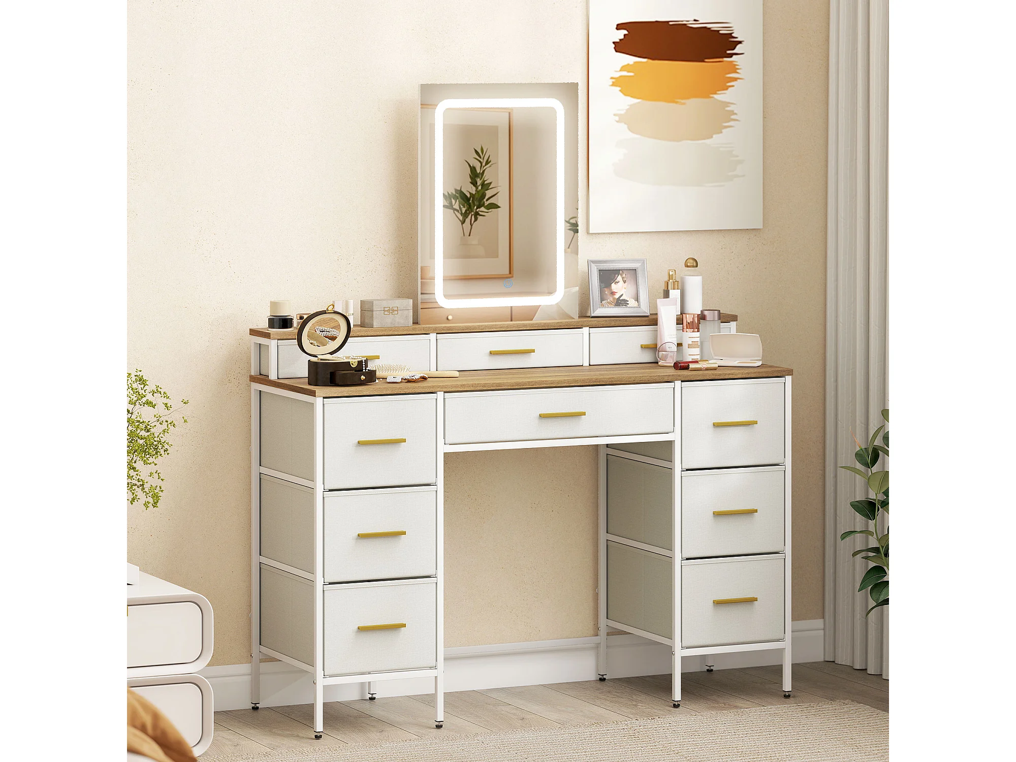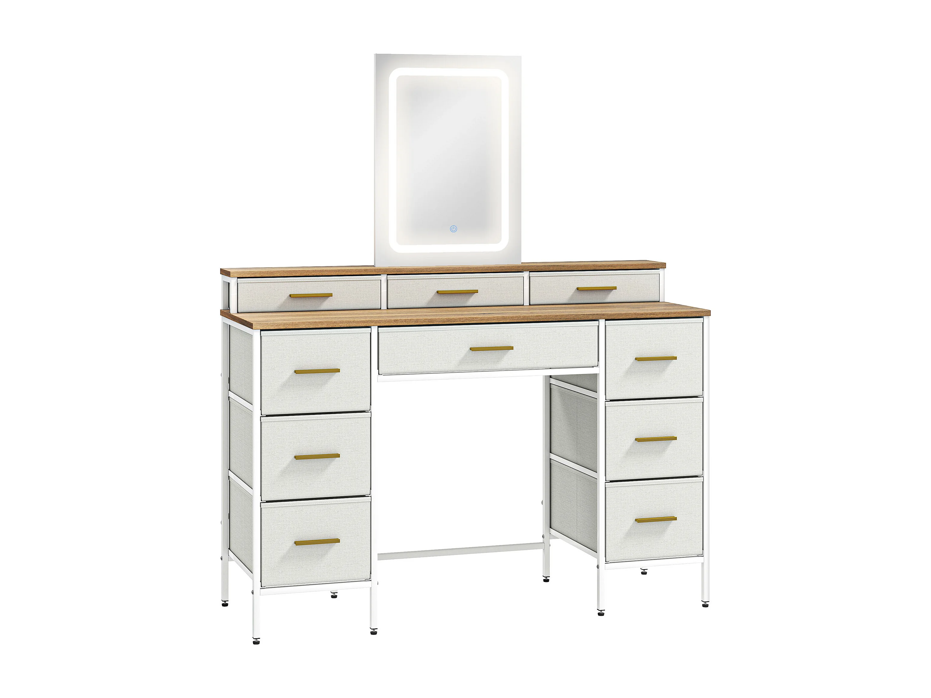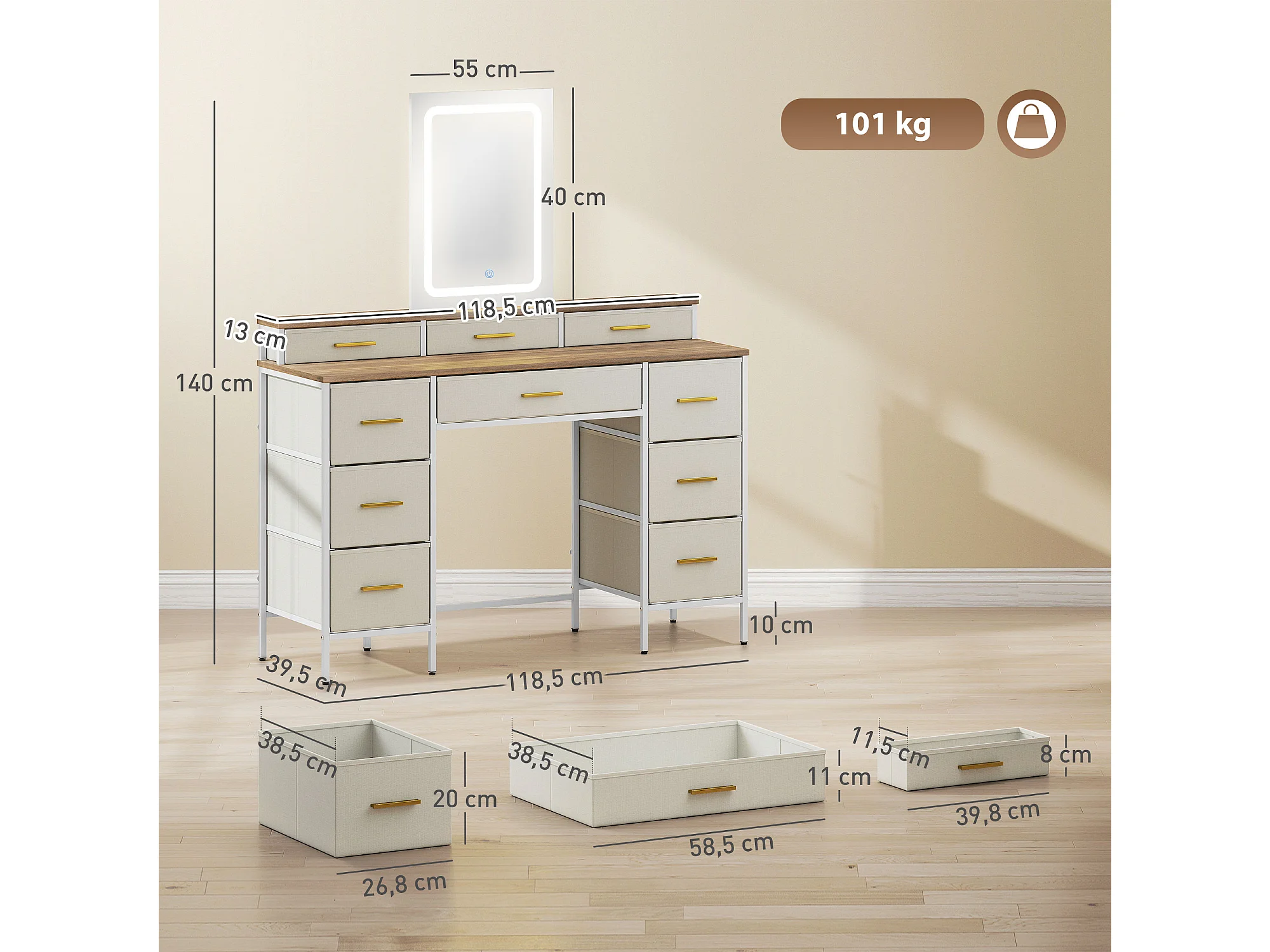 Coiffeuse miroir LED tactile réglable 10 tiroirs tissu dim. 118,5 x 39,5 x 140 cm acier blanc doré effet bois