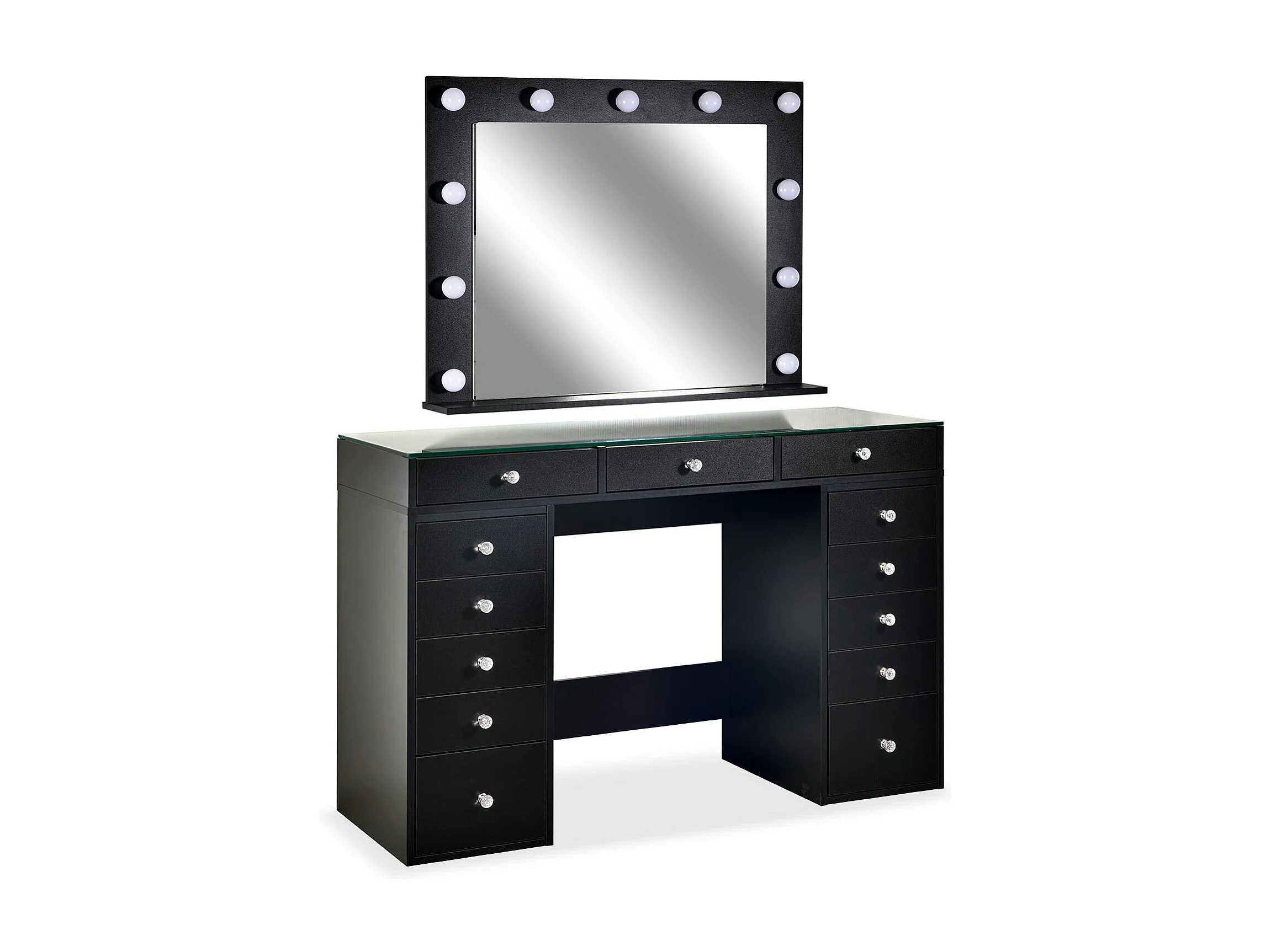 Coiffeuse moderne 13 tiroirs avec miroir lumineux et plateau en verre L120cm Probeauty Noir