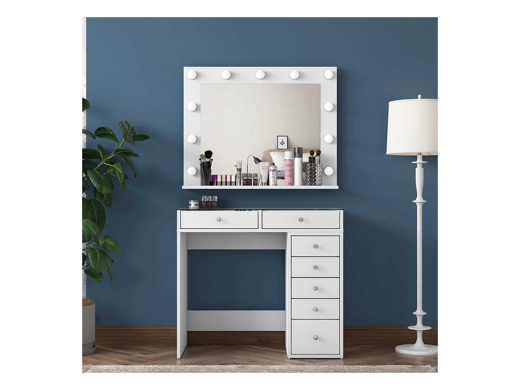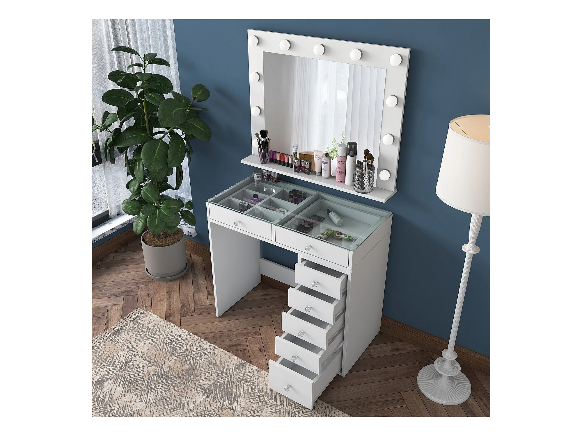 Coiffeuse moderne avec miroir LED et dessus Transparent Beline L90cm Blanc