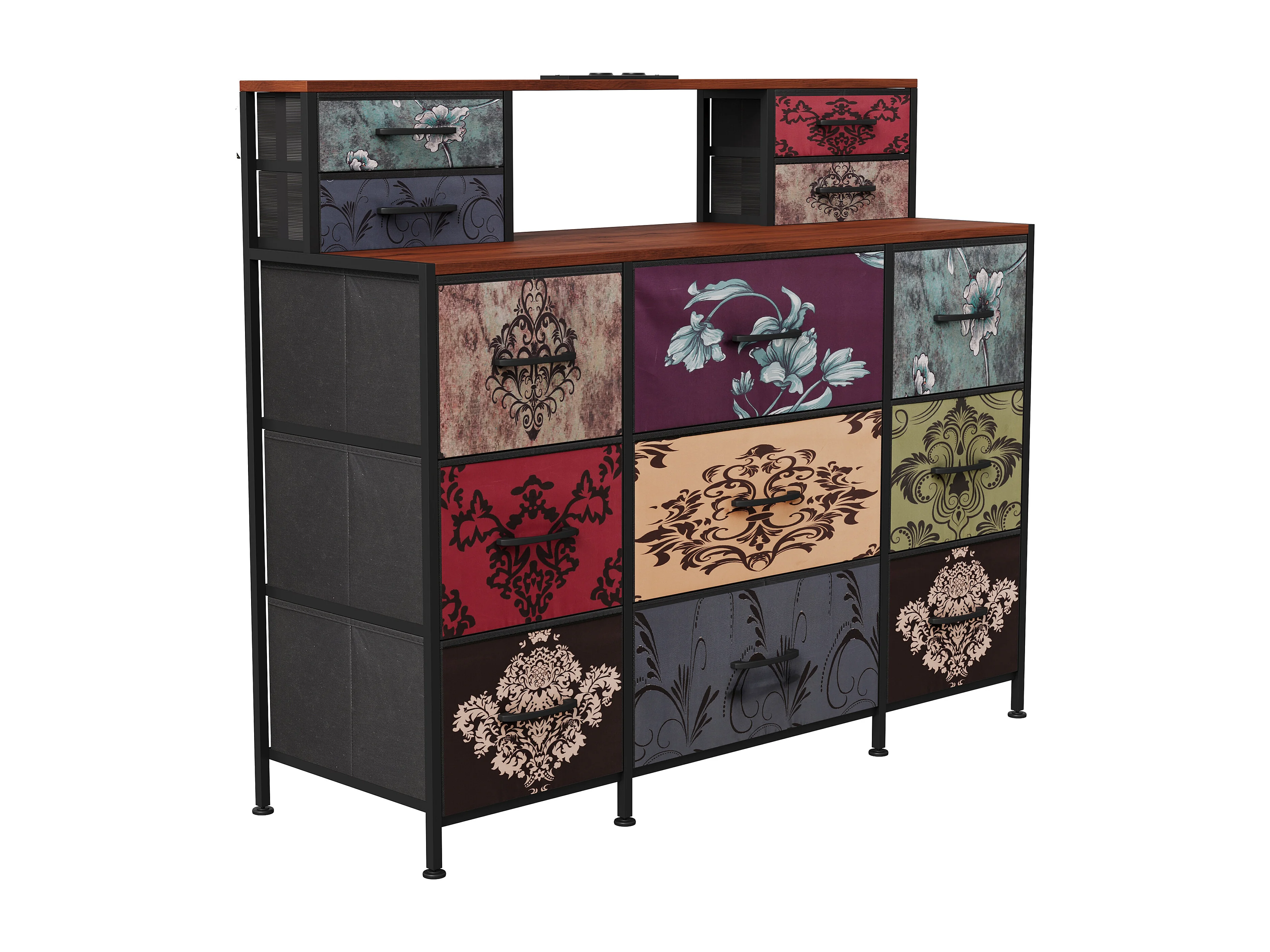 Coiffeuse pour Chambre à Coucher Vintage à Fleurs - 13 Tiroirs et 2 Étagères Ouvertes, LED et USB, Armoire de Rangement en Tissu