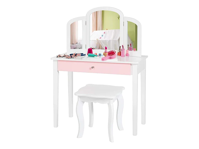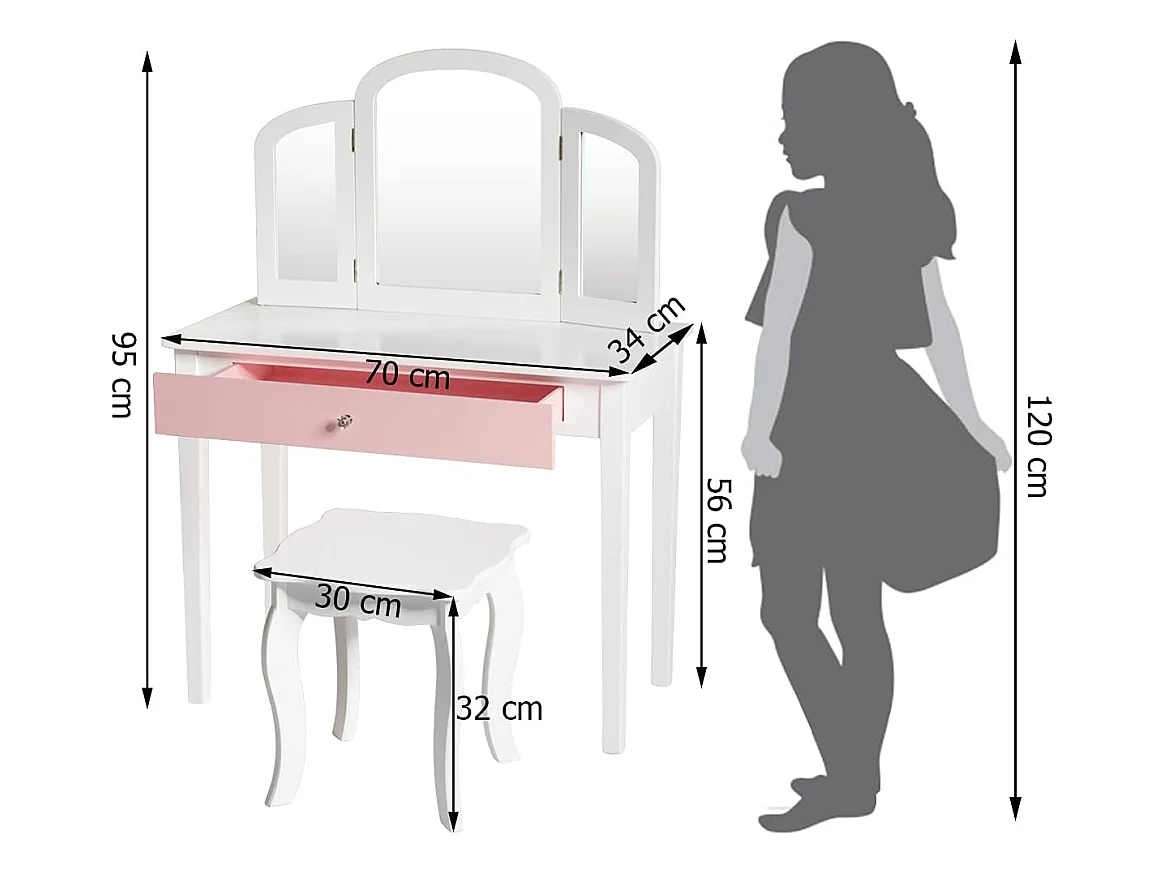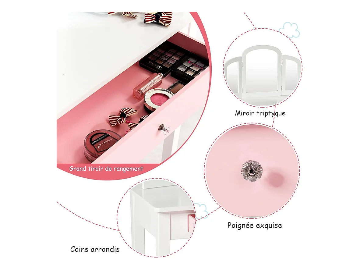 Coiffeuse pour Enfants 2 en 1 avec Miroir Amovible et Pliable, 1 Grand Tiroir Style Princesse Blanc