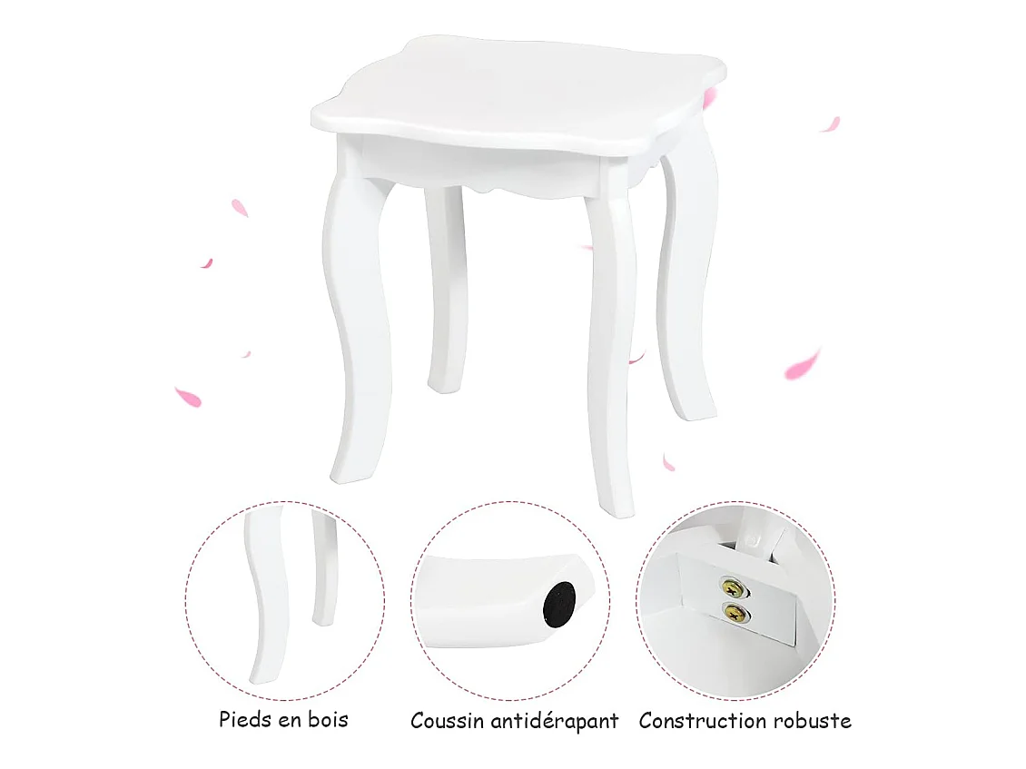 Coiffeuse pour Enfants avec Miroir Amovible - 3 Tiroirs - 2 Boîtes - Convertible Bureau - Style Princesse pour Filles, Blanc