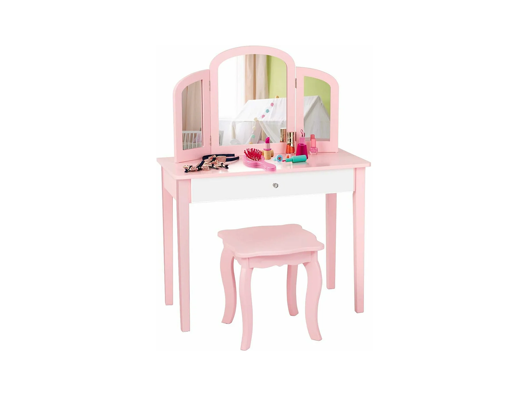 Coiffeuse pour enfants avec miroir à trois volets, ensemble de coiffeuse 2-en-1 , tabouret inclus