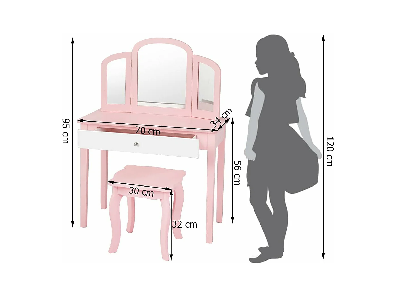 Coiffeuse Enfant Rose avec Tabouret, Table de Maquillage avec Miroir à Trois Panneaux et Tiroir, 70 x 34 x 103 CM, Rose