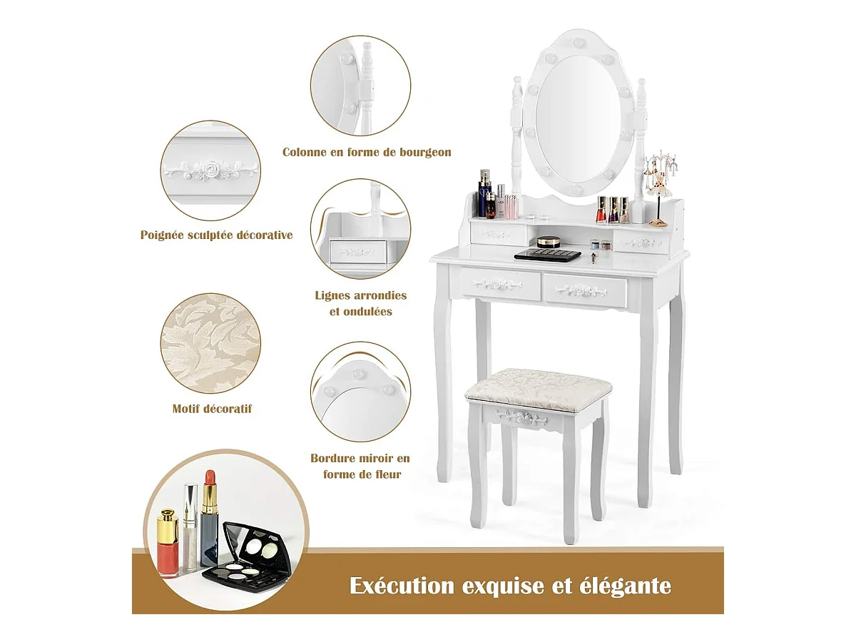 Coiffeuse 10 Ampoules LED à Intensité Variable, Miroir Pivotant à 360 Degrés avec 4 Tiroirs de Rangement Blanc