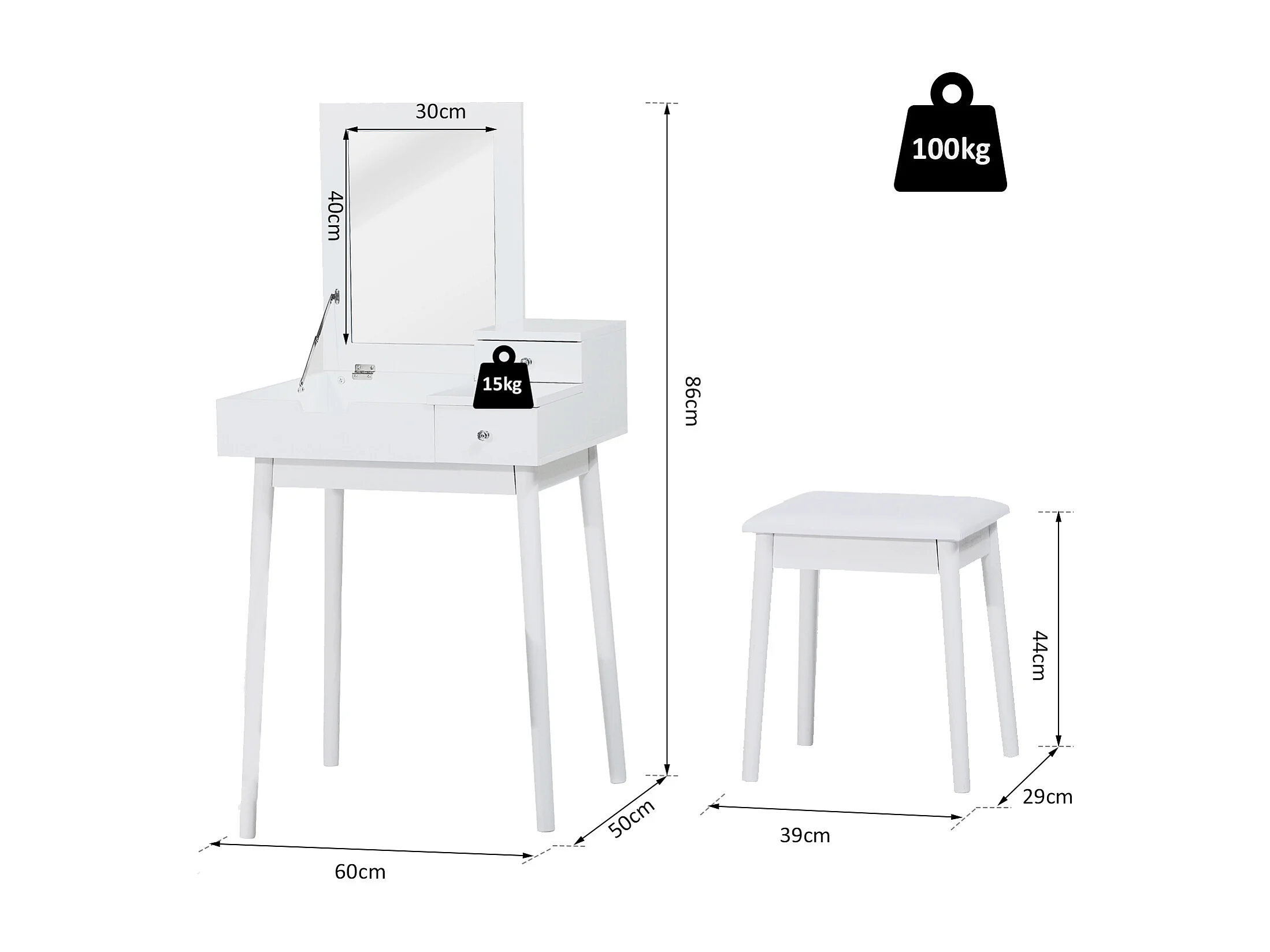 Coiffeuse table de maquillage avec tabouret miroir rabattable coffre + 2 tiroirs MDF bois massif pin blanc