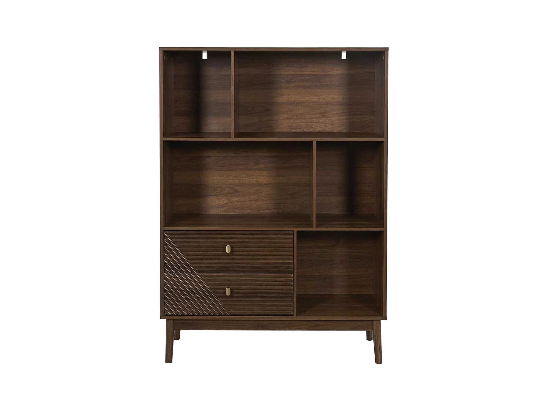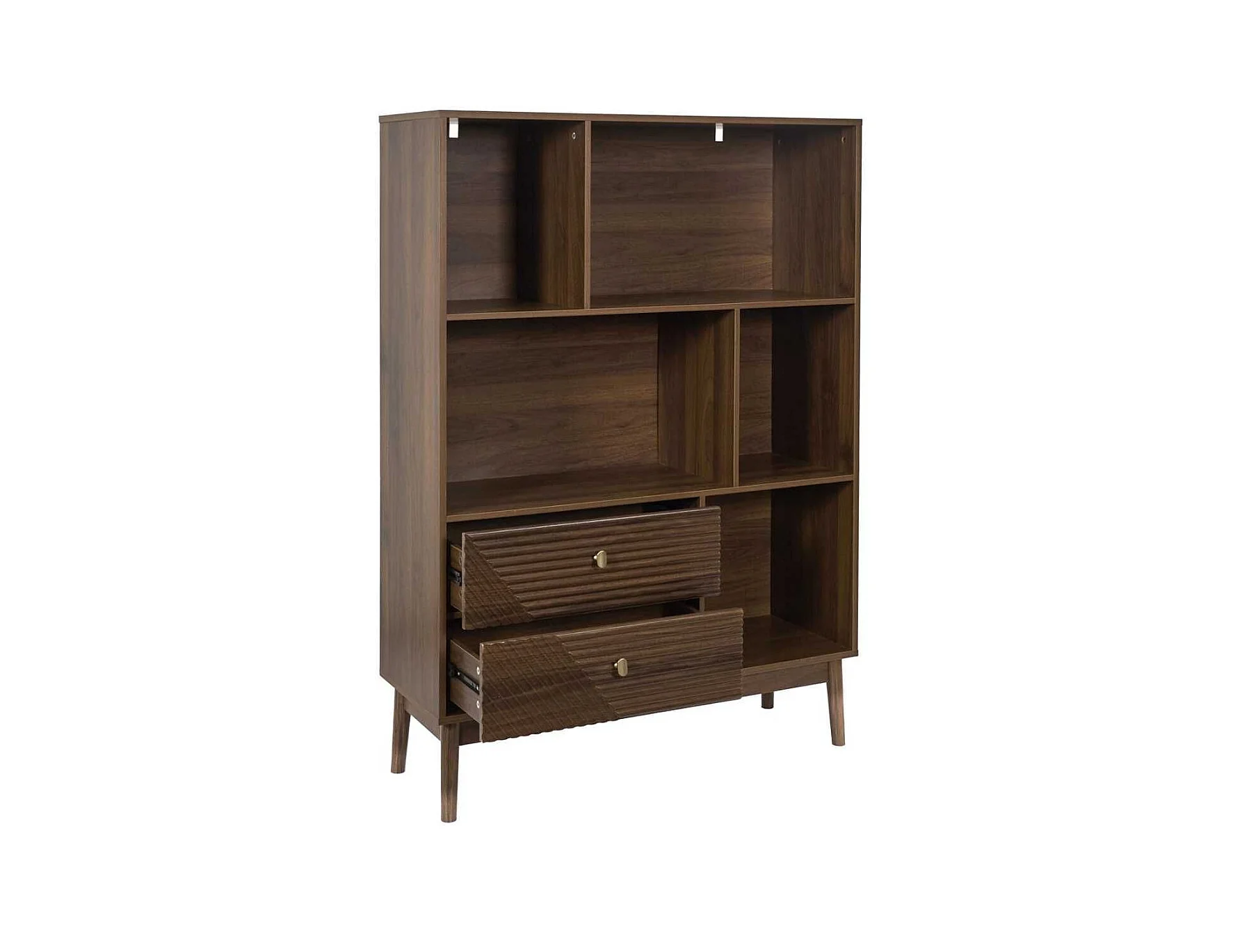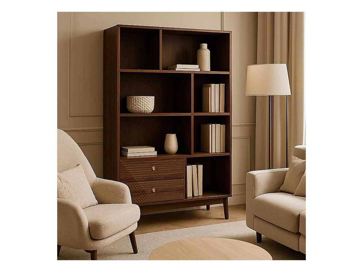 Bibliothèque 2 tiroirs 5 niches en bois et MDF pieds en pin teinté chêne foncé - COLETTE